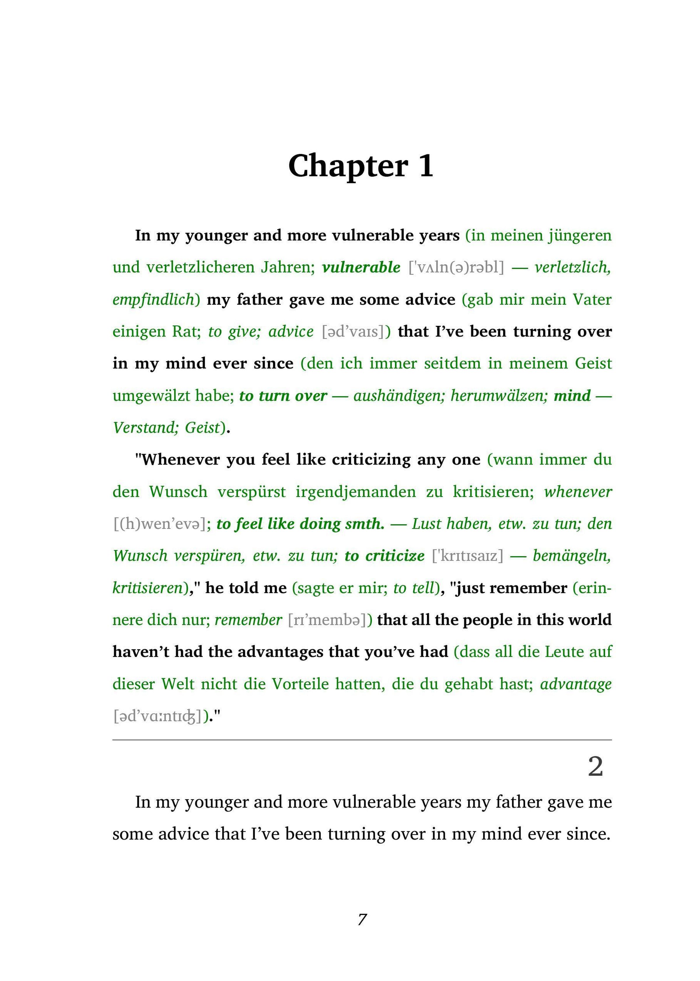 Erleben Sie die Goldenen Zwanziger mit all ihrem Glanz, ihrer Sehnsucht - und ihrer Leere. The Great Gatsby von F. Scott Fitzgerald gilt als einer der bedeutendsten Romane der amerikanischen Literatur. Diese Ausgabe enthält den vollständigen Originaltext - authentisch und ungekürzt, aber durch die Frank-Lesemethode auch für fortgeschrittene Englischlernende verständlich gemacht.