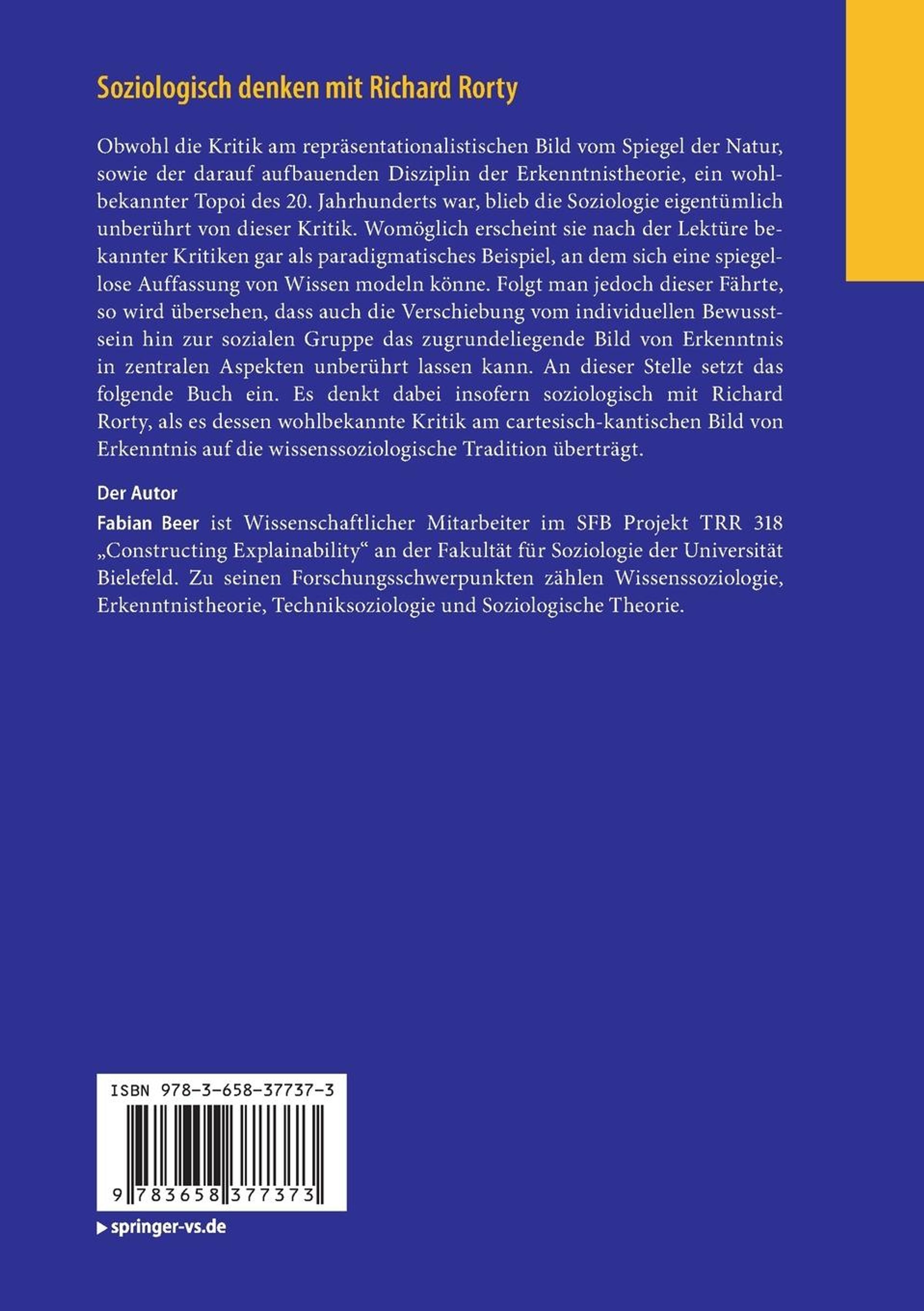 Obwohl die Kritik am repräsentationalistischen Bild vom Spiegel der Natur, sowie der darauf aufbauenden Disziplin der Erkenntnistheorie, ein wohlbekannter Topoi des 20. Jahrhunderts war, blieb die Soziologie eigentümlich unberührt von dieser Kritik. Womöglich erscheint sie nach der Lektüre bekannter Kritiken gar als paradigmatisches Beispiel, an dem sich eine spiegellose Auffassung von Wissen modeln könne. Folgt man jedoch dieser Fährte, so wird übersehen, dass auch die Verschiebung vom individuellen Bewusstsein hin zur sozialen Gruppe das zugrundeliegende Bild von Erkenntnis in zentralen Aspekten unberührt lassen kann. An dieser Stelle setzt das folgende Buch ein. Es denkt dabei insofern soziologisch mit Richard Rorty, als es dessen wohlbekannte Kritik am cartesisch-kantischen Bild von Erkenntnis auf die wissenssoziologische Tradition überträgt.