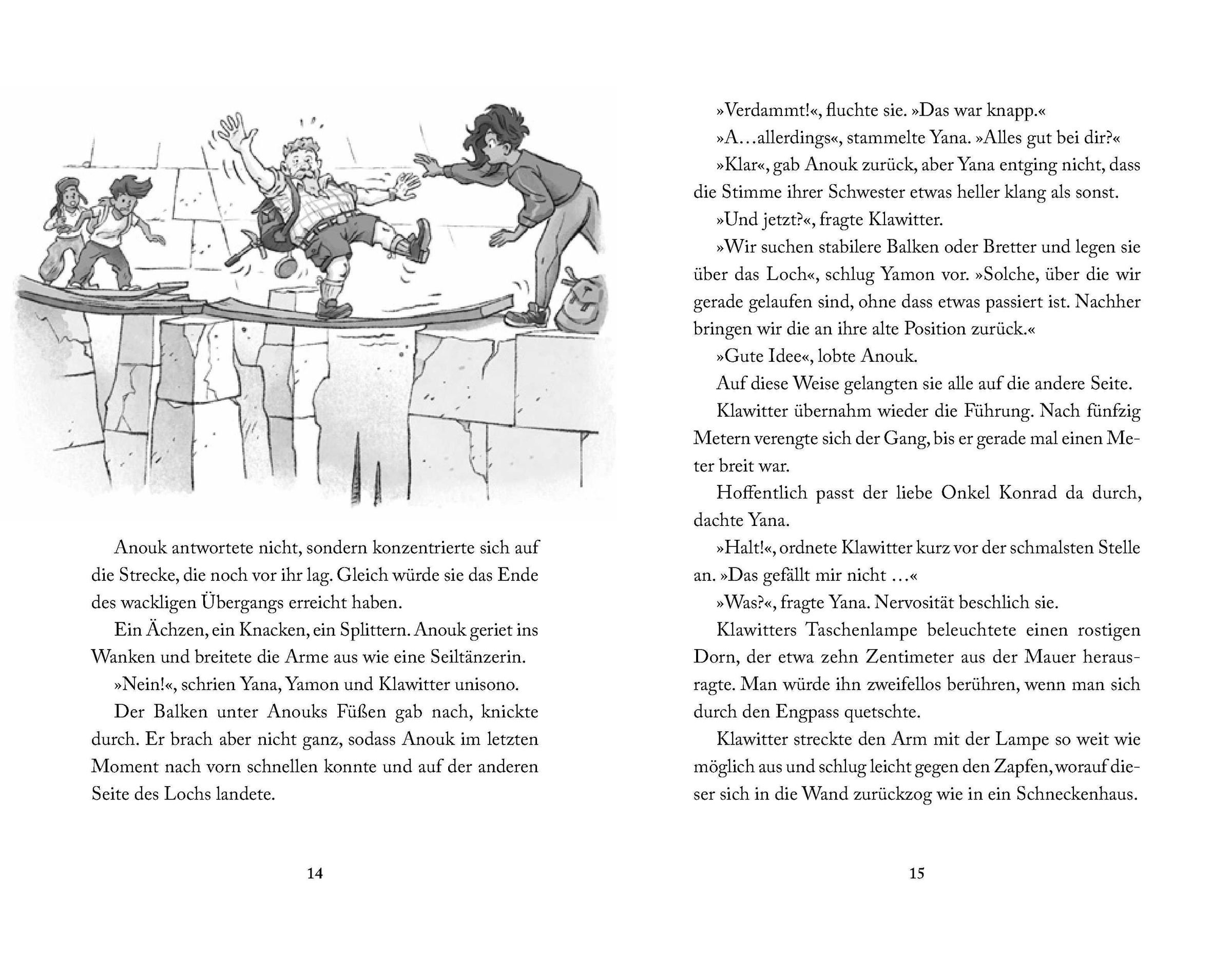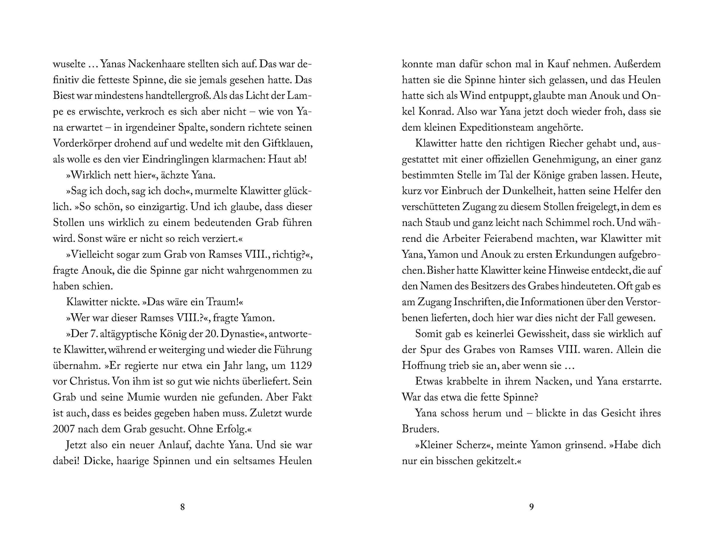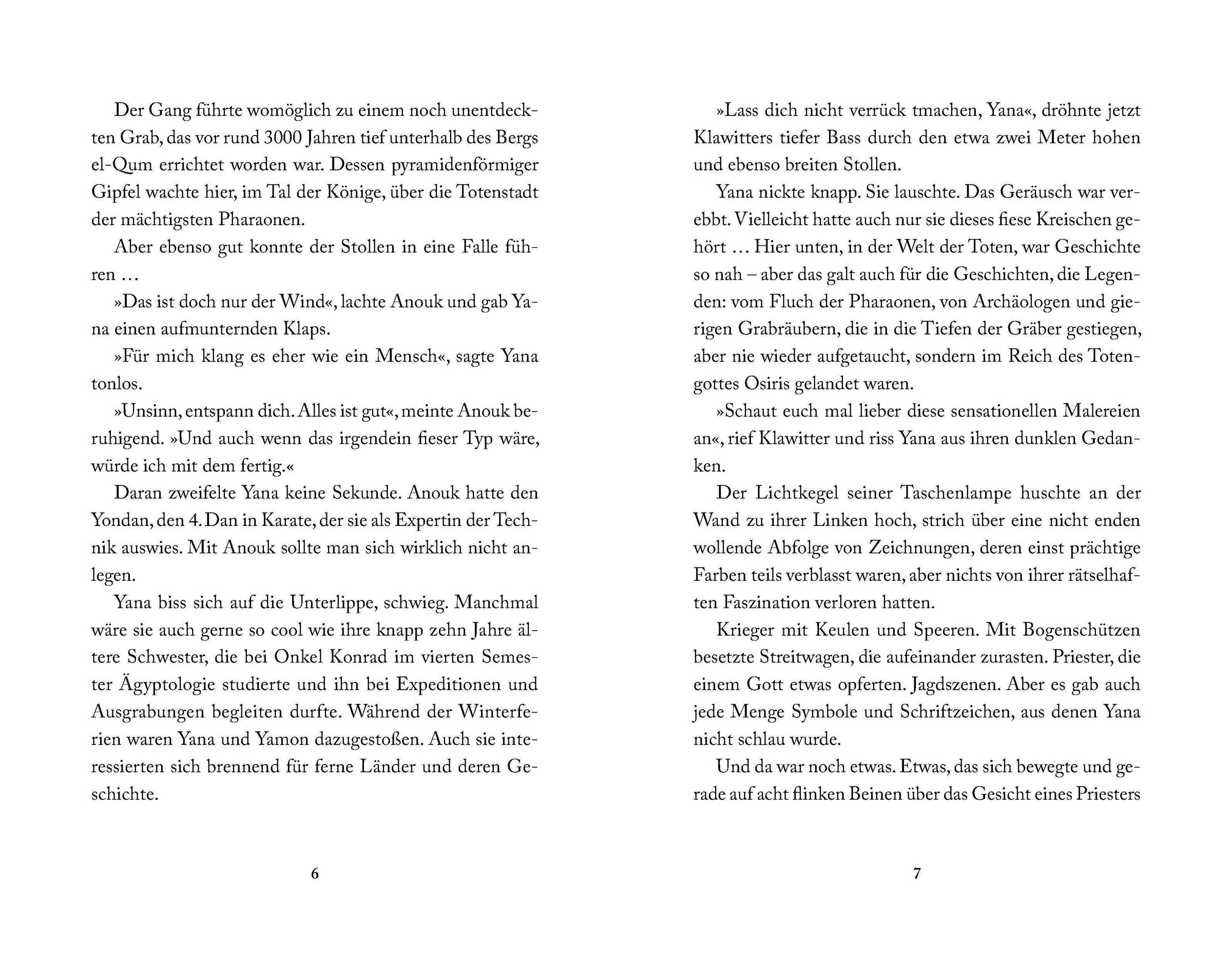 Ein spannender Sommer in Ägypten: Die Zwillinge Yana und Yamon (12) reisen mit ihrer Schwester Anouk, einer schlagfertigen Archäologiestudentin, und ihrem Onkel Professor Klawitter ins Tal der Könige. Dort entdecken sie eine neue Grabkammer - und darin eine magische Formel, mit der sie sich in heilige Tiere verwandeln: Bastet die Katze, Horus den Falken und Anubis den Hund. Als sie beim Besuch im Ägyptischen Museum Zeugen eines Raubüberfalls werden, bei dem unter anderem Tutanchamuns Maske und eine Mumie entwendet werden, kommt es zu einer halsbrecherischen Verfolgungsjagd. Und der Drahtzieher kennt das Geheimnis der magischen Formel! Wird es den drei Geschwistern gelingen, die historischen Schätze zurückzuholen?