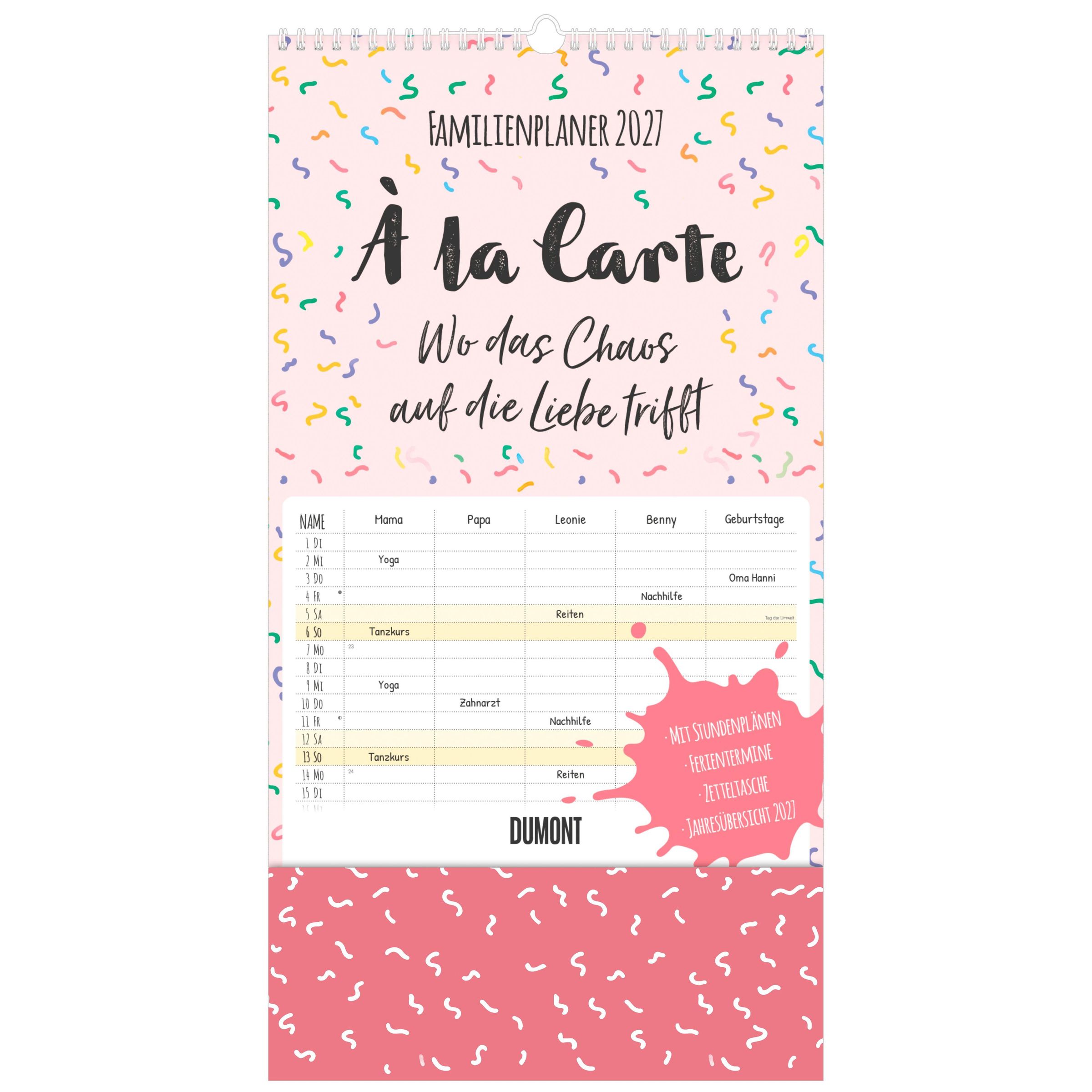 Der DUMONT Familienplaner à la Carte 2027 bringt Übersicht und Freude in den Familienalltag. Mit 5 Spalten für getrennte Eintragungen, liebevoll gestalteten Monatsseiten und inspirierenden Zitaten ist er ein praktischer und zugleich dekorativer Begleiter durchs Jahr.