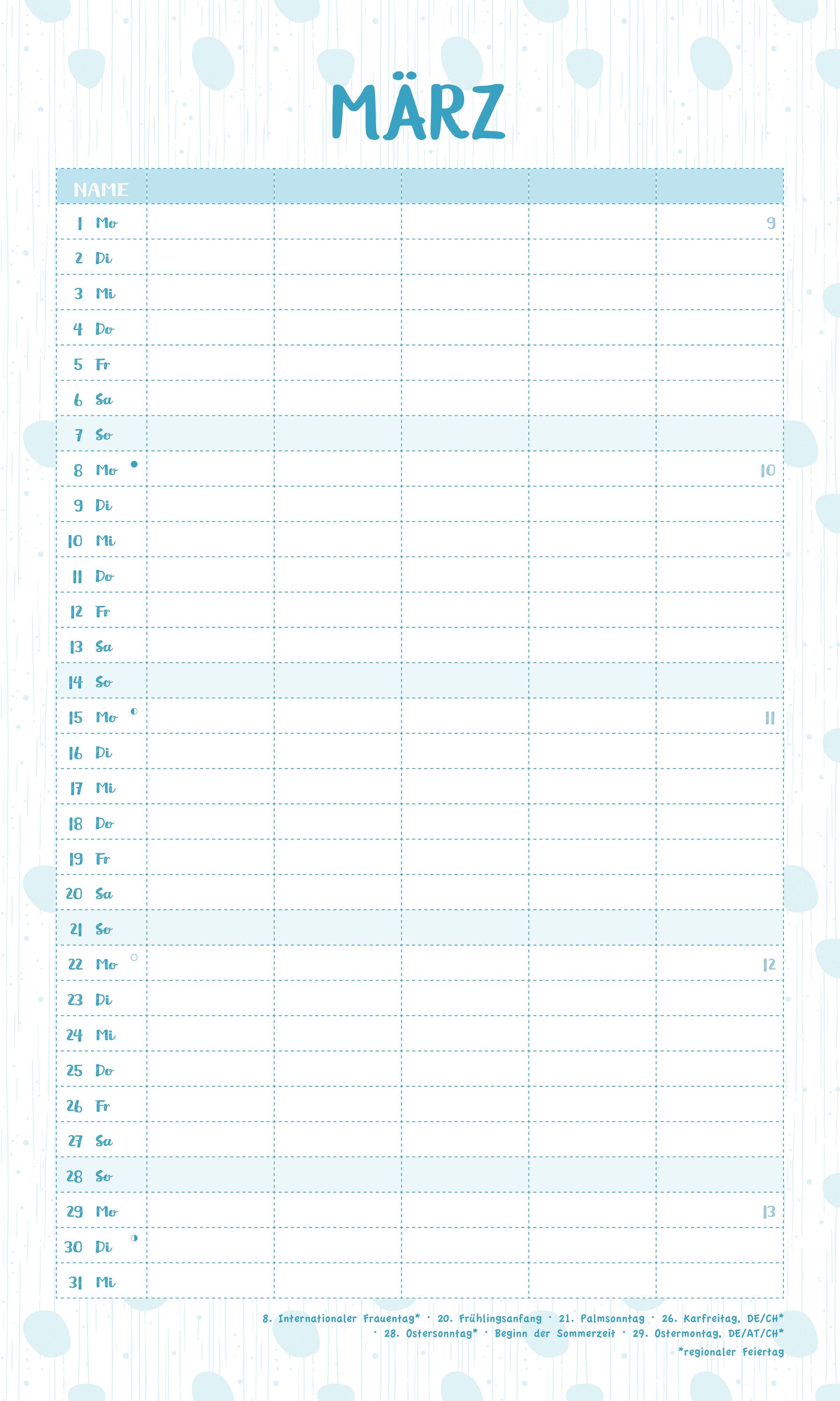 5 Spalten für volle Übersicht: Ideal für die einzelnen Familienmitglieder und ihre Themen wie Schule, Hobbys, Haushalt oder Freizeitaktivitäten.