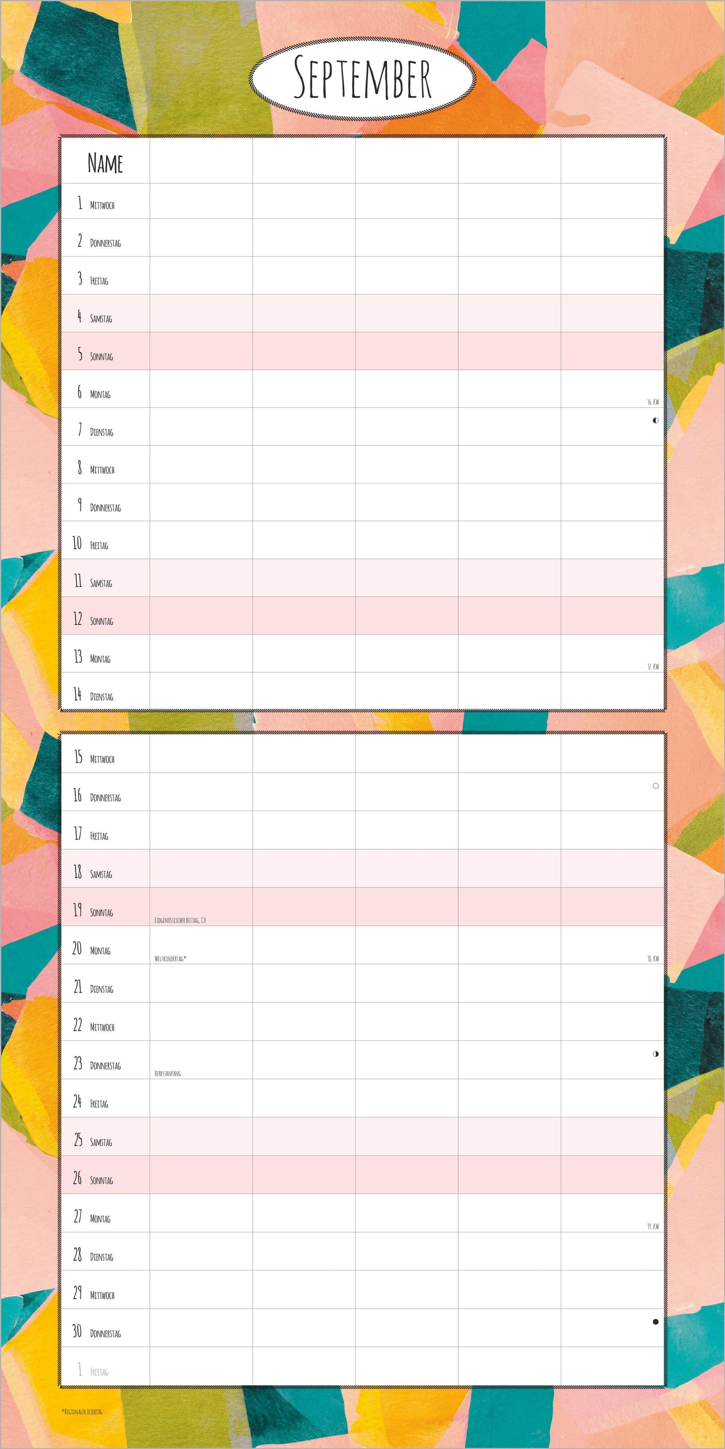 Im Format 30 x 30 cm (aufgeklappt 30 x 60 cm) präsentiert dieser Broschürenkalender farbenfrohe und abwechslungsreiche Illustrationen, die jeden Monat zum Blickfang machen. Das übersichtliche, 6-sprachige Kalendarium enthält alle Feiertage für Deutschland, Österreich, die Schweiz und weitere europäische Länder. Zusätzlich sind die wichtigsten Ferientermine (DE/AT/CH) vermerkt, und eine praktische Jahresübersicht erleichtert die langfristige Planung. Monatsübersichten vom Vor- und Folgemonat sowie ein großzügiger Notizbereich runden die Ausstattung ab.