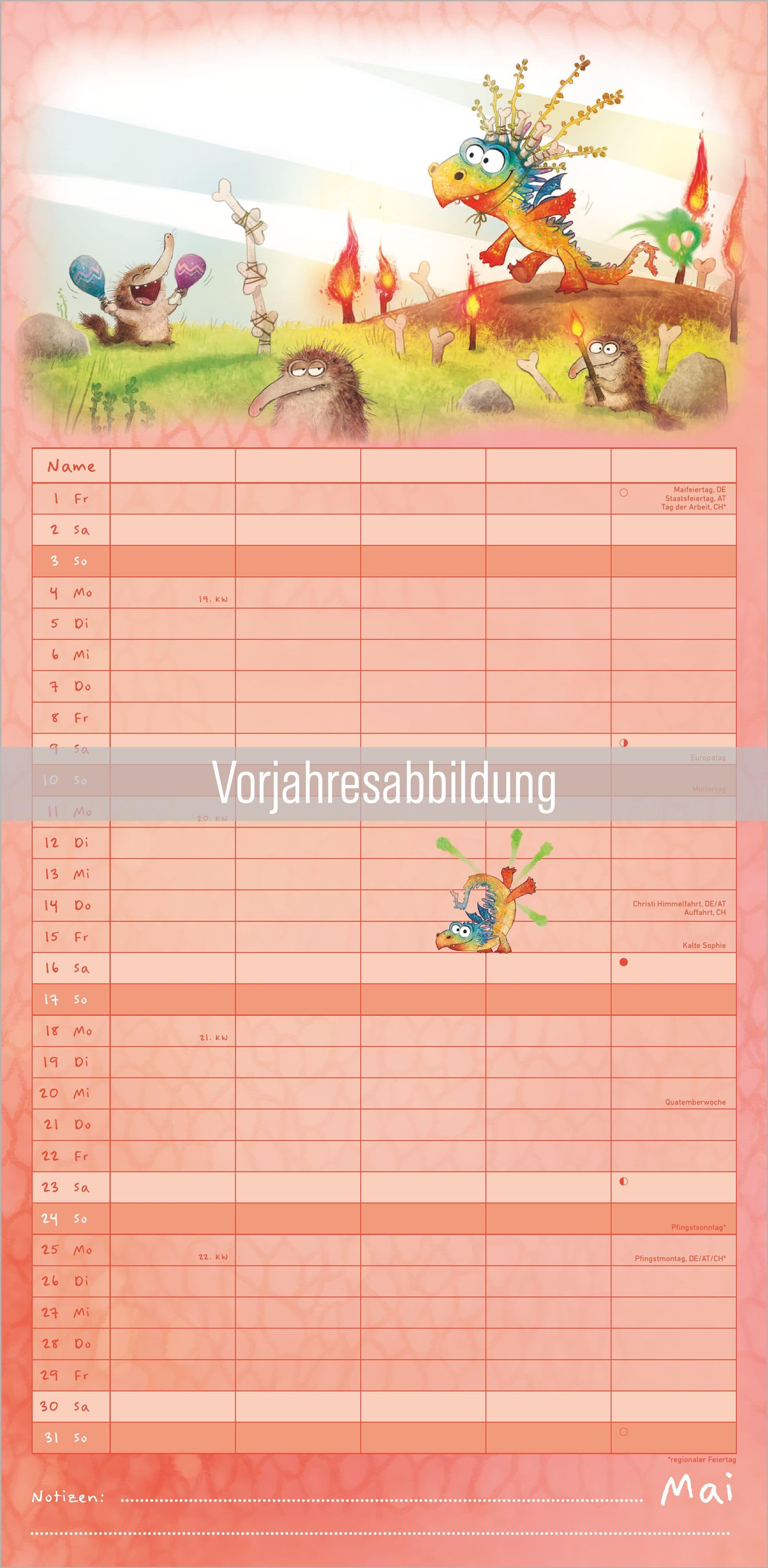 Praktische Extras: Deutschsprachiges Kalendarium mit Feiertagen (DE/AT/CH), klare Monatsaufteilung