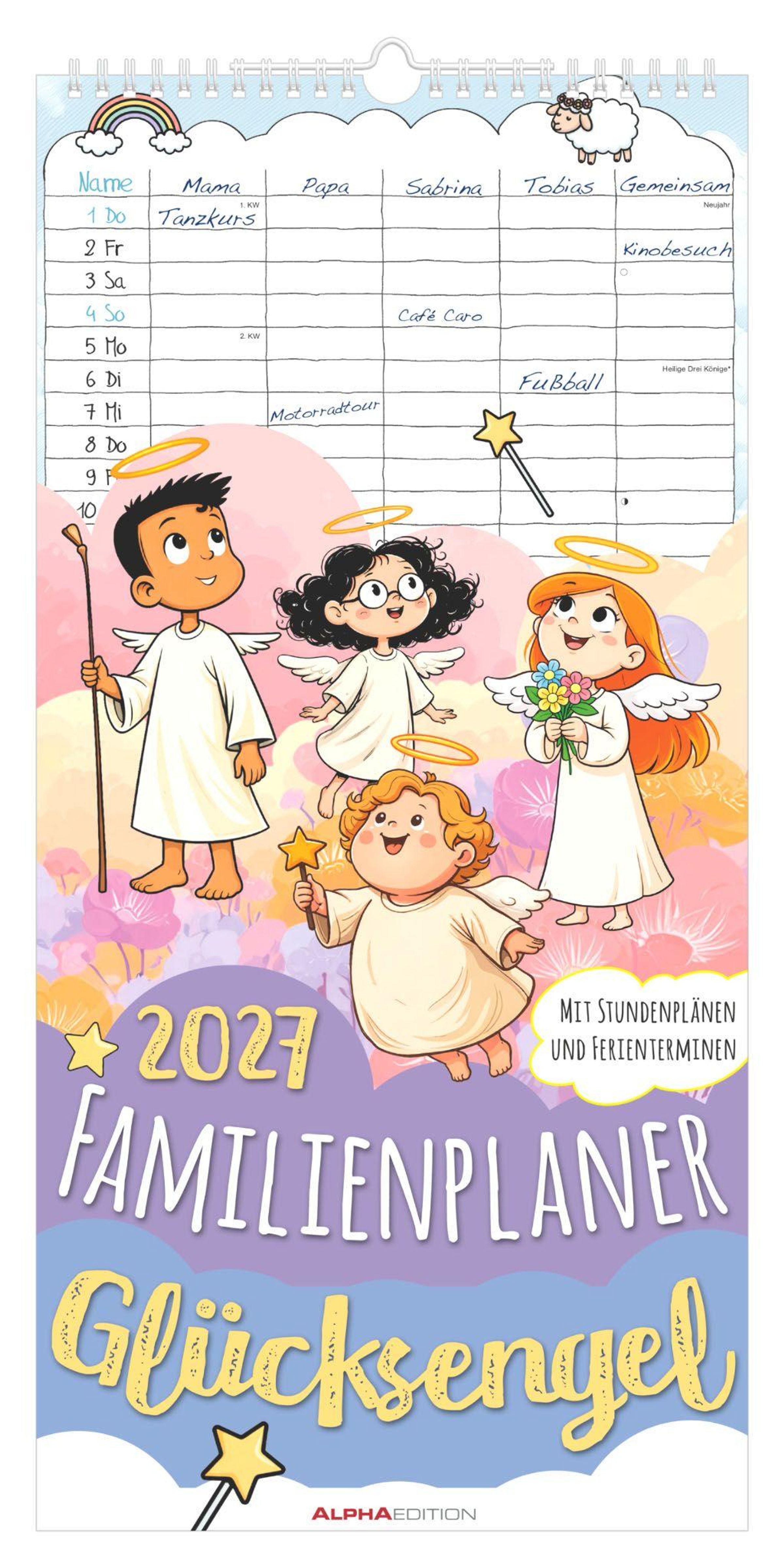 Mit dem Familienplaner Glücksengel 2027 von Alpha Edition wird Planung im Alltag ganz leicht -- und gleichzeitig richtig charmant. Süße Engelillustrationen im sanften Pastell-Look begleiten euch durchs Jahr: kleine Glücksengel zwischen Wolken und Sternen, liebevoll gezeichnet und wunderbar dekorativ. Dazu gibt es jeden Monat einen passenden Schutzengel-Spruch, der ein gutes Gefühl vermittelt. Dank 5 Spalten hat jedes Familienmitglied (mit Themen wie Schule, Sport, Haushalt, Freizeitaktivitäten) seinen festen Platz -- übersichtlich, schnell erfassbar und ideal für den Familienalltag.