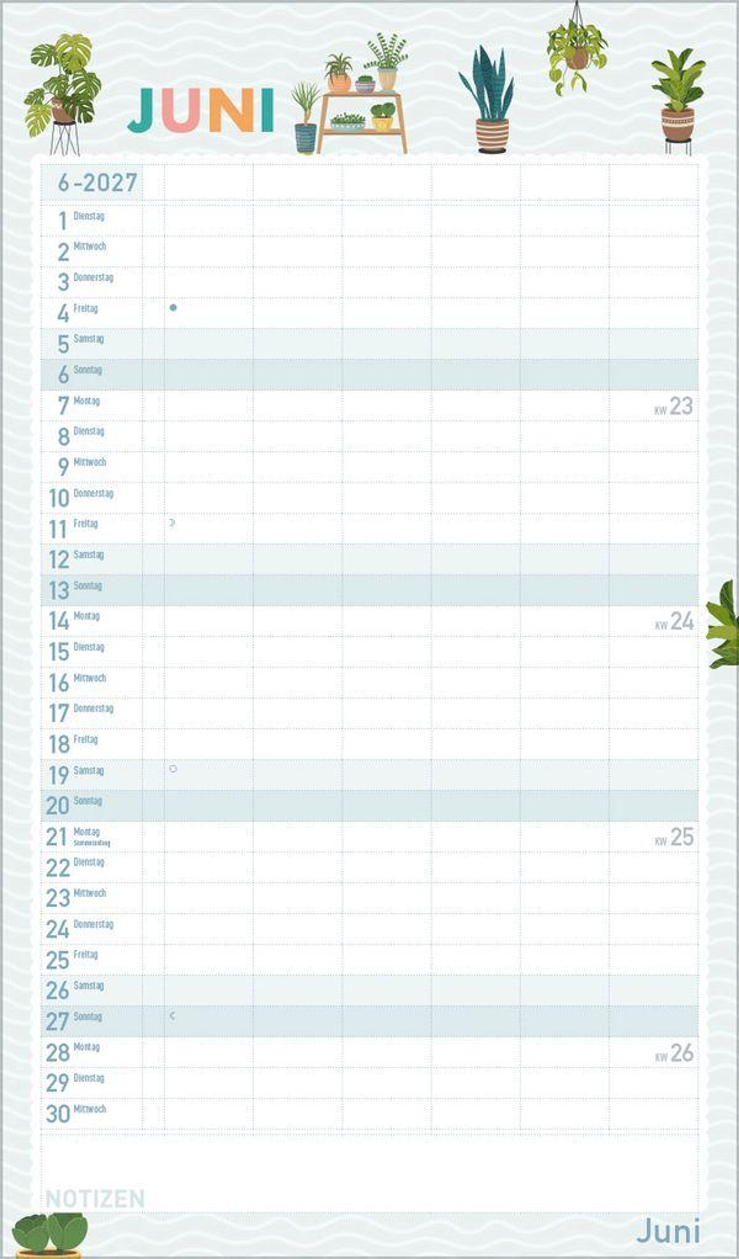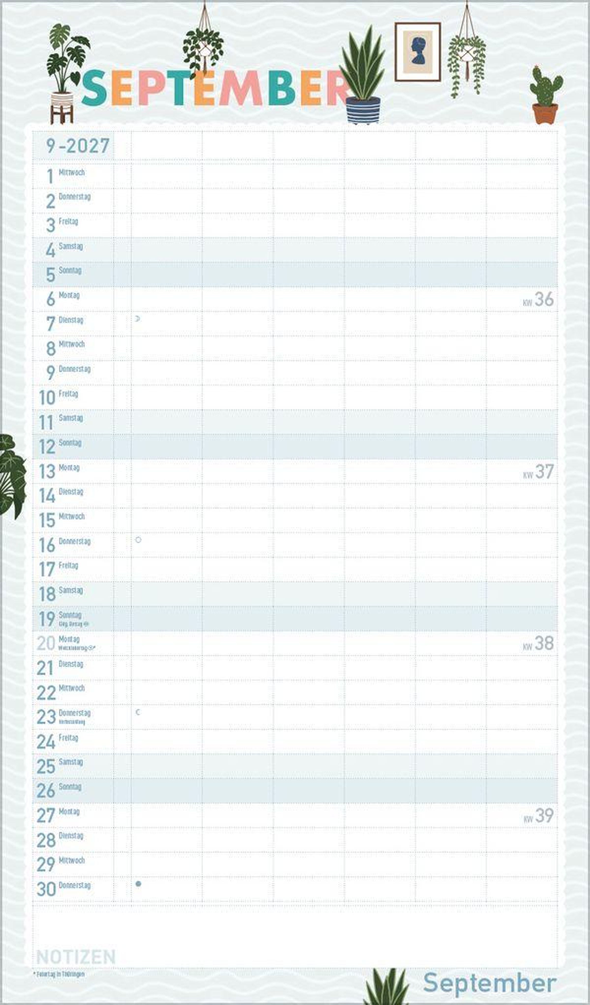 Urban Jungle und Zimmerpflanzen liegen voll im Trend. In seinen fröhlichen und pastellig-zarten Illustrationen im nach wie vor angesagten Flat Design greift dieser Familienplaner diesen Trend auf und zaubert mit seinen vielen Details eine liebevolle Wohlfühl-Atmosphäre an die Wand. Mit sechs großen Spalten sowie Ferienterminen und Vorschau fürs Folgejahr.