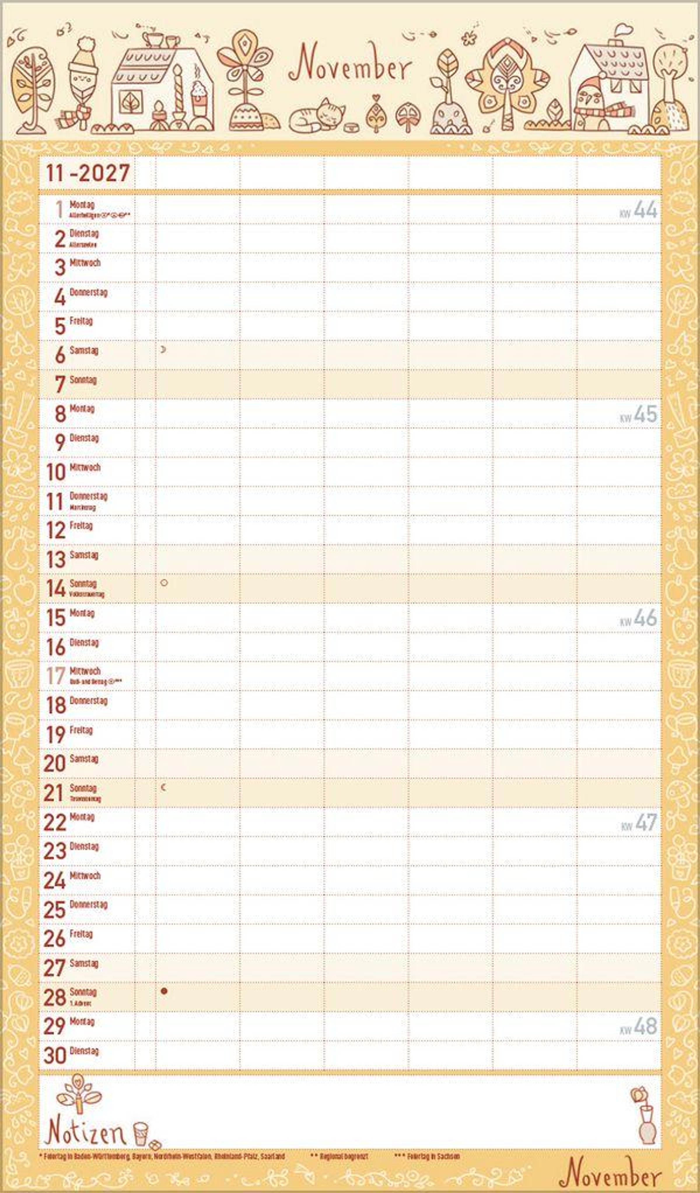 - Familienkalender, 6 große Spalten. Familientimer mit Ferienterminen, extra Spalte und Vorschau bis März 2027. Format: 27 x 46 cm