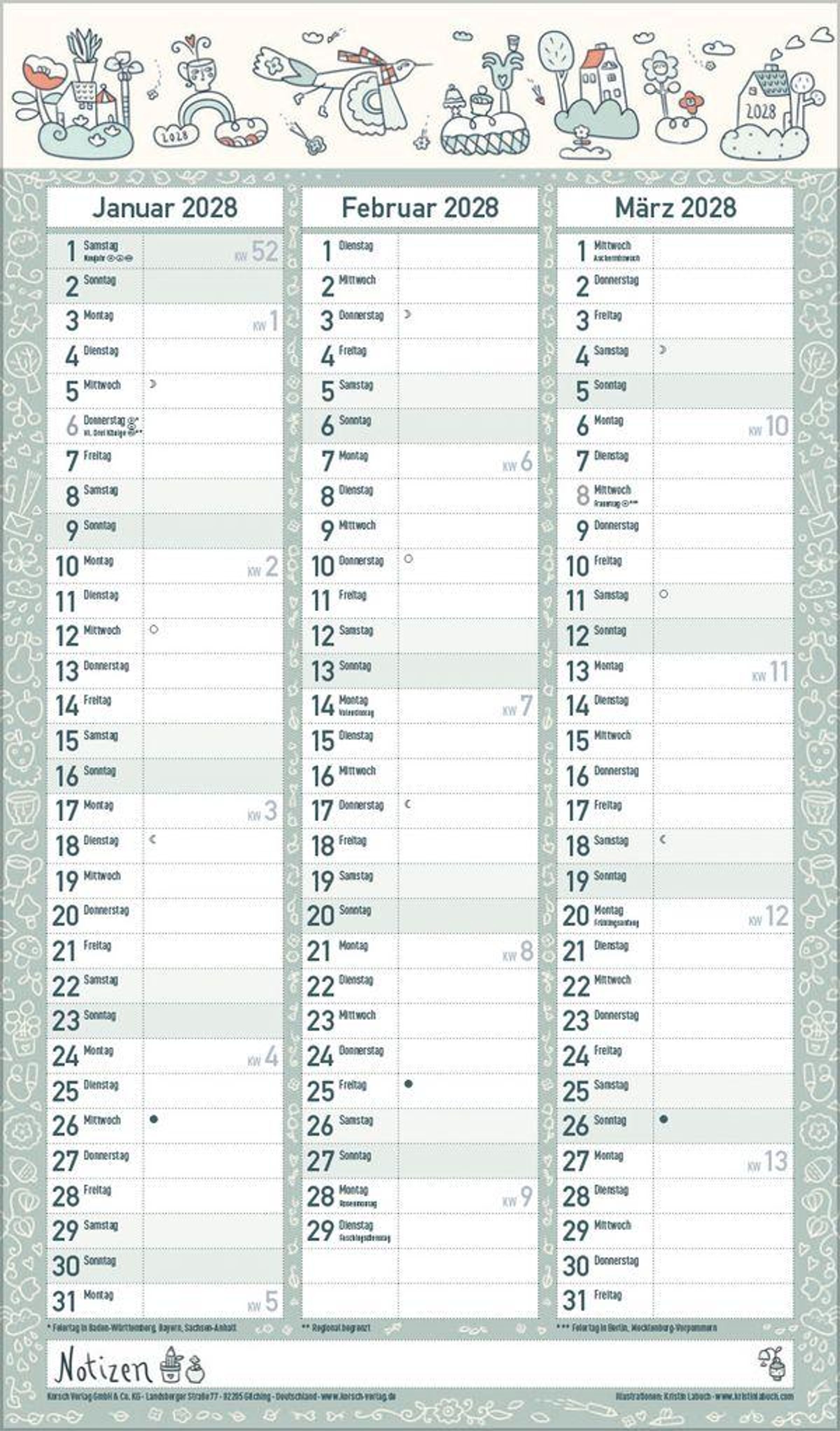 Lieblingspläne und sonstige Termine finden ausreichend Platz in diesem liebevoll und exklusiv für Korsch gestalteten Familienplaner. Daneben gibt es viel zu entdecken, denn Kristin Labuch aus Münster hat unzählige kleine Figuren und Elemente handgezeichnet und zu herzerwärmenden kleinen Szenen verwoben, getaucht in harmonische, ruhige Farbwelten. Sechs Spalten plus Müllspalte und eine Vorschau ins nächste Jahr sowie Ferientermine helfen bei der Planung.