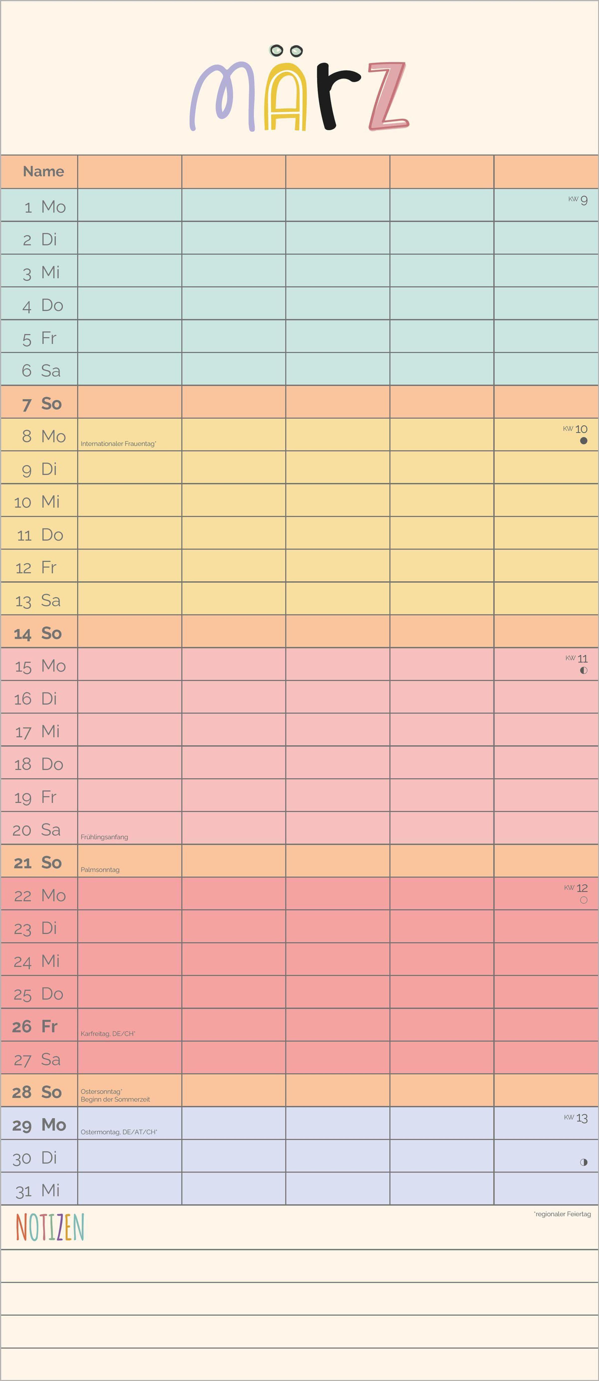 Das farbenfrohe und moderne Design bringt jeden Monat Freude ins Haus und macht die Terminplanung zum Vergnügen. Dank des großzügigen Formats von 20 x 45 cm und des klar strukturierten deutschsprachigen Kalendariums haben Sie alle Termine, Feiertage (DE/AT/CH) und Mondphasen stets griffbereit. Die stabile Spiralbindung mit Aufhängevorrichtung sorgt dafür, dass Ihr Kalender sicher hängt und sich leicht umblättern lässt.