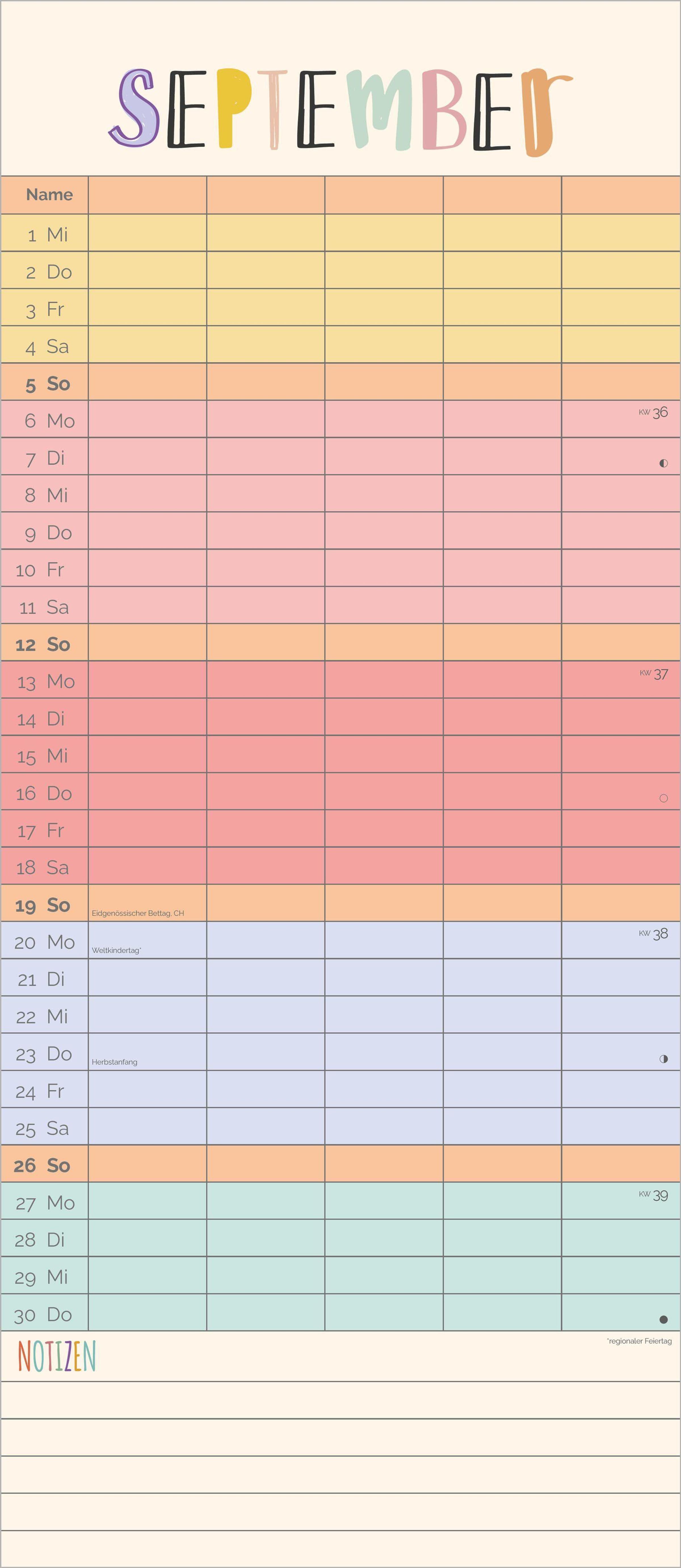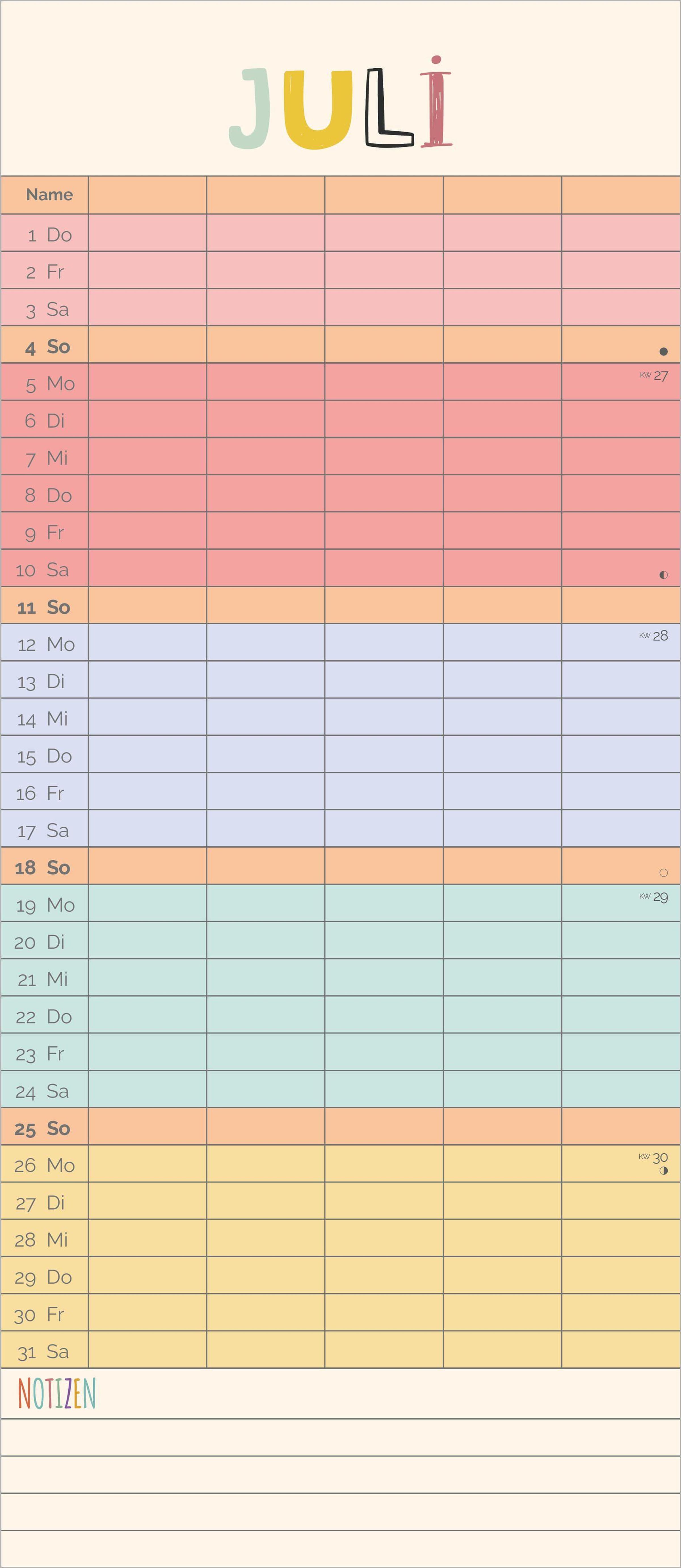 Familienplaner im Format 20 x 45 cm mit 5 Spalten für klare Terminübersicht