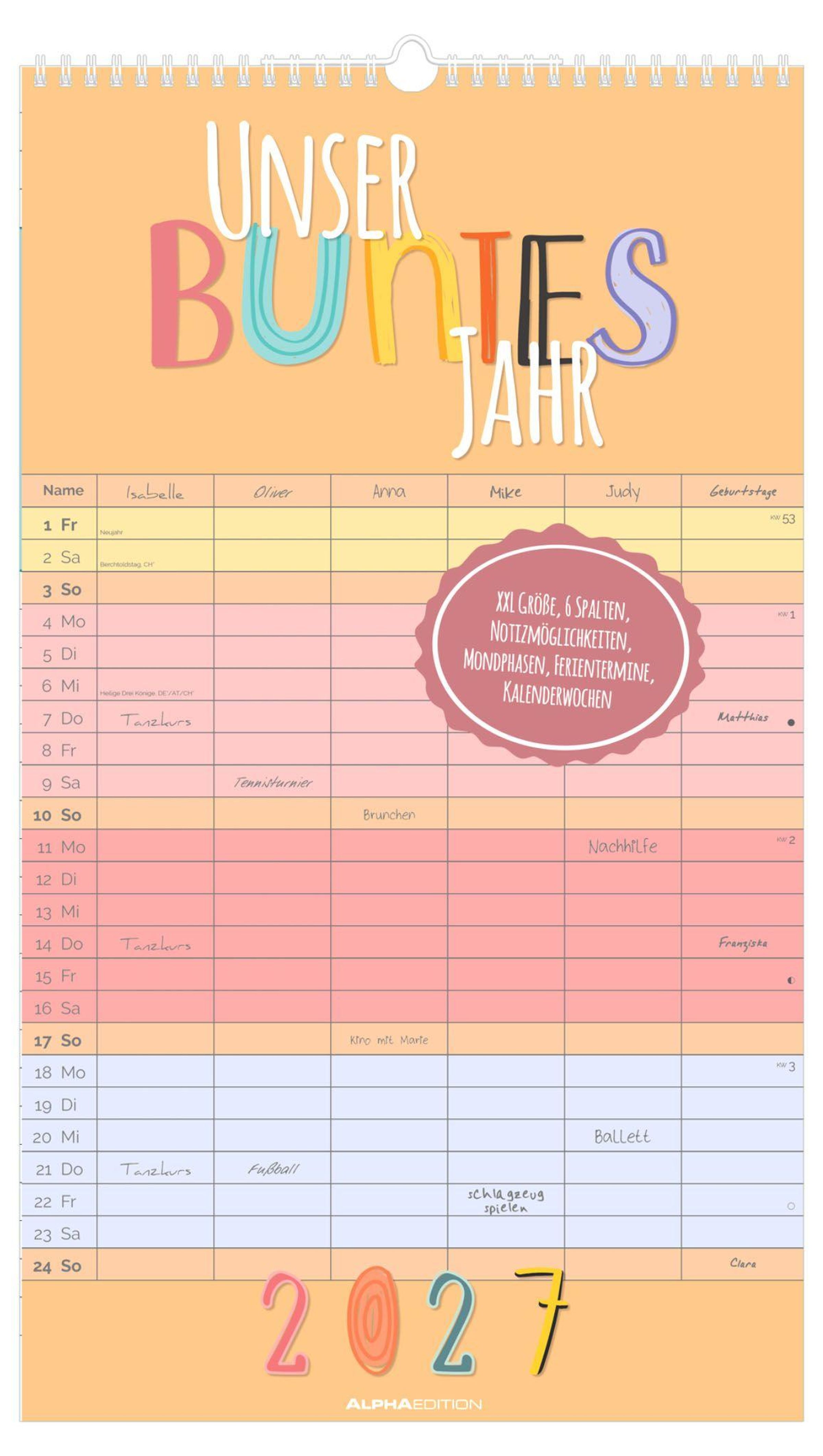 Mit dem Familienplaner „Unser buntes Jahr" 2027 von Alpha Edition behalten Sie alle Termine Ihrer Familie im Blick. Der farbenfrohe Wandkalender im großzügigen Format (26x45 cm) überzeugt durch Übersichtlichkeit und modernes Design -- ideal für Familienorganisation und Alltagsplanung.