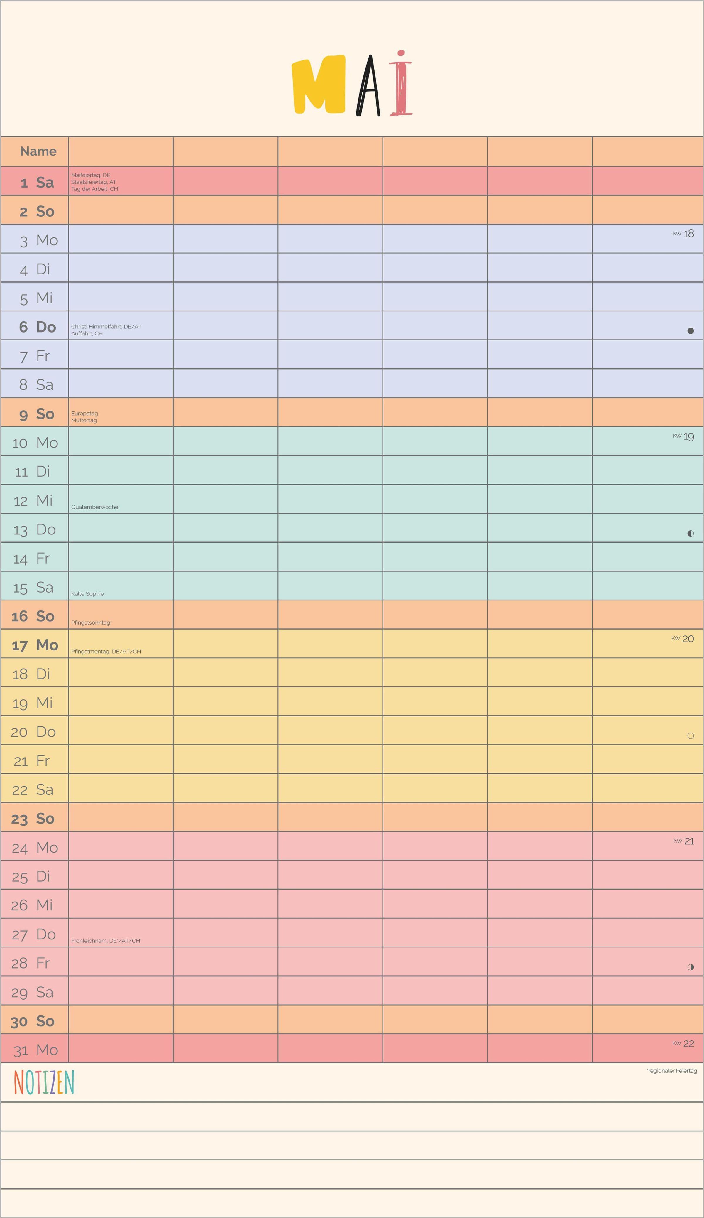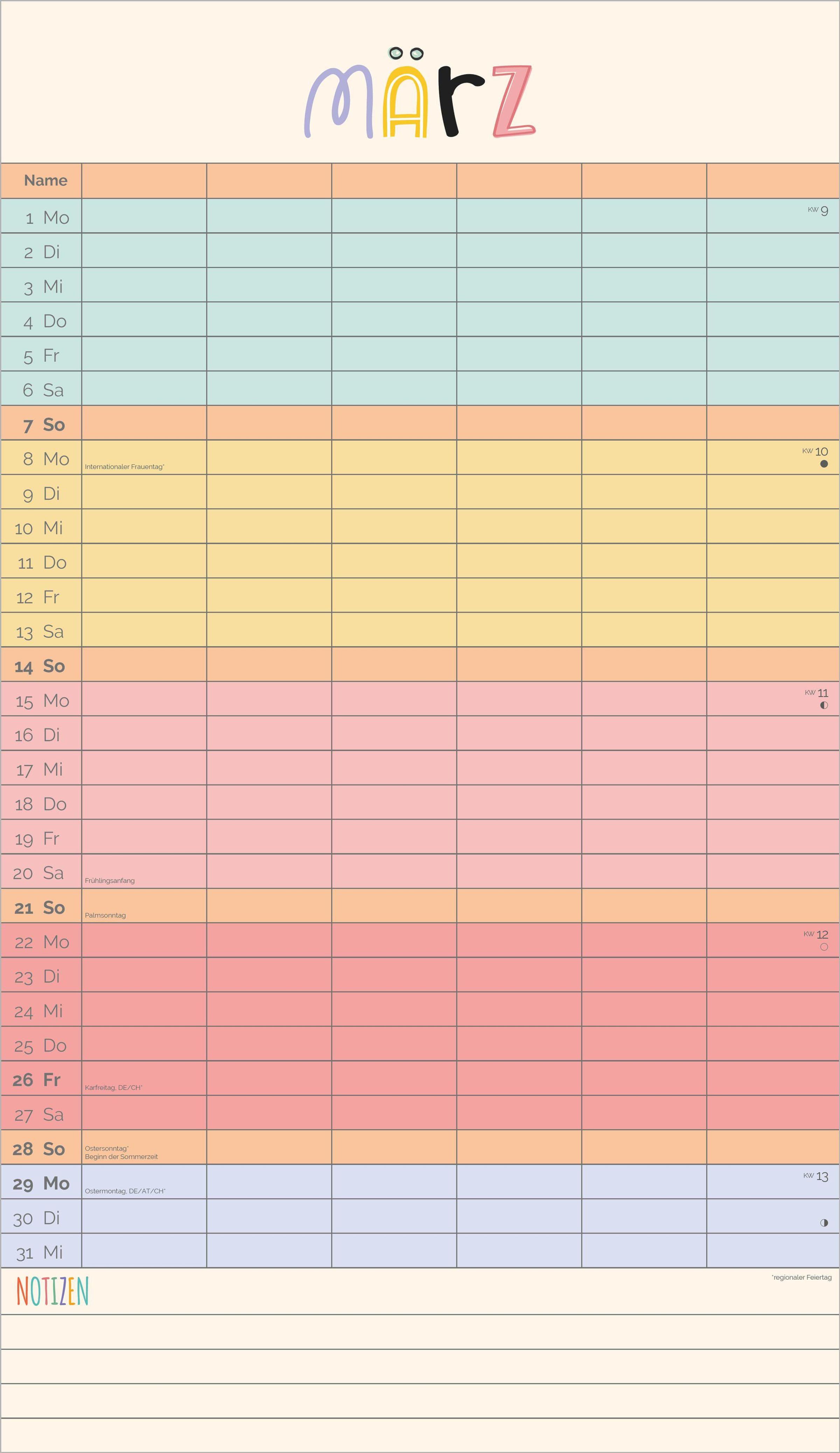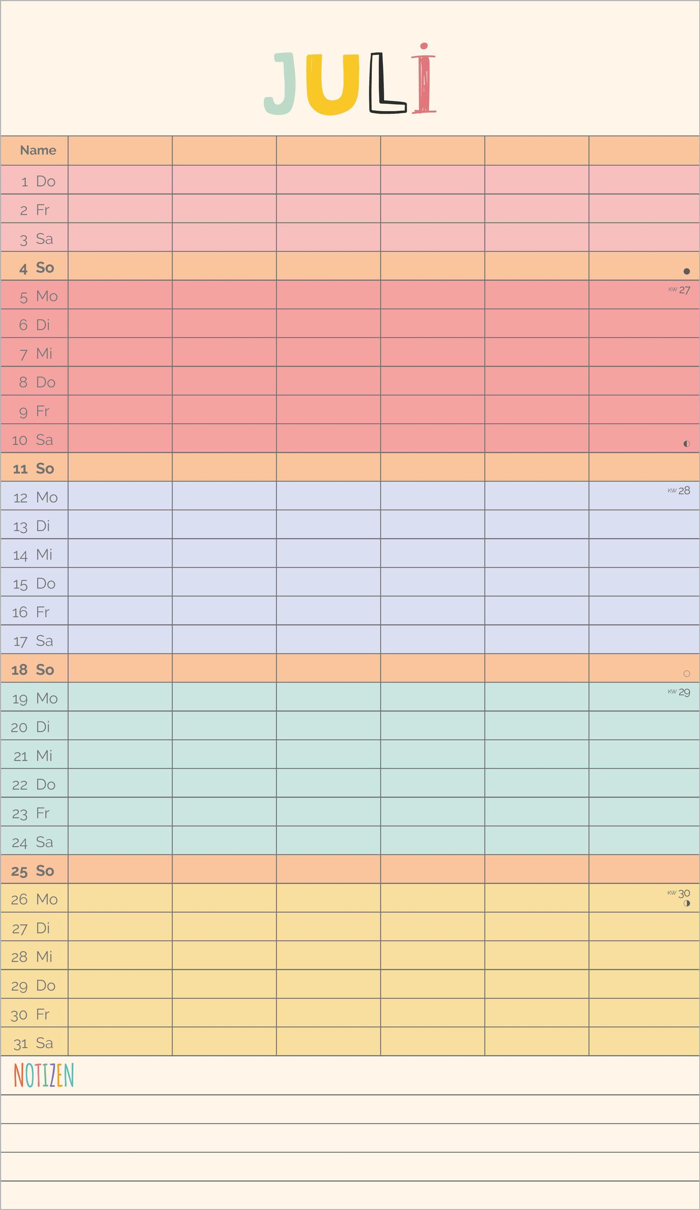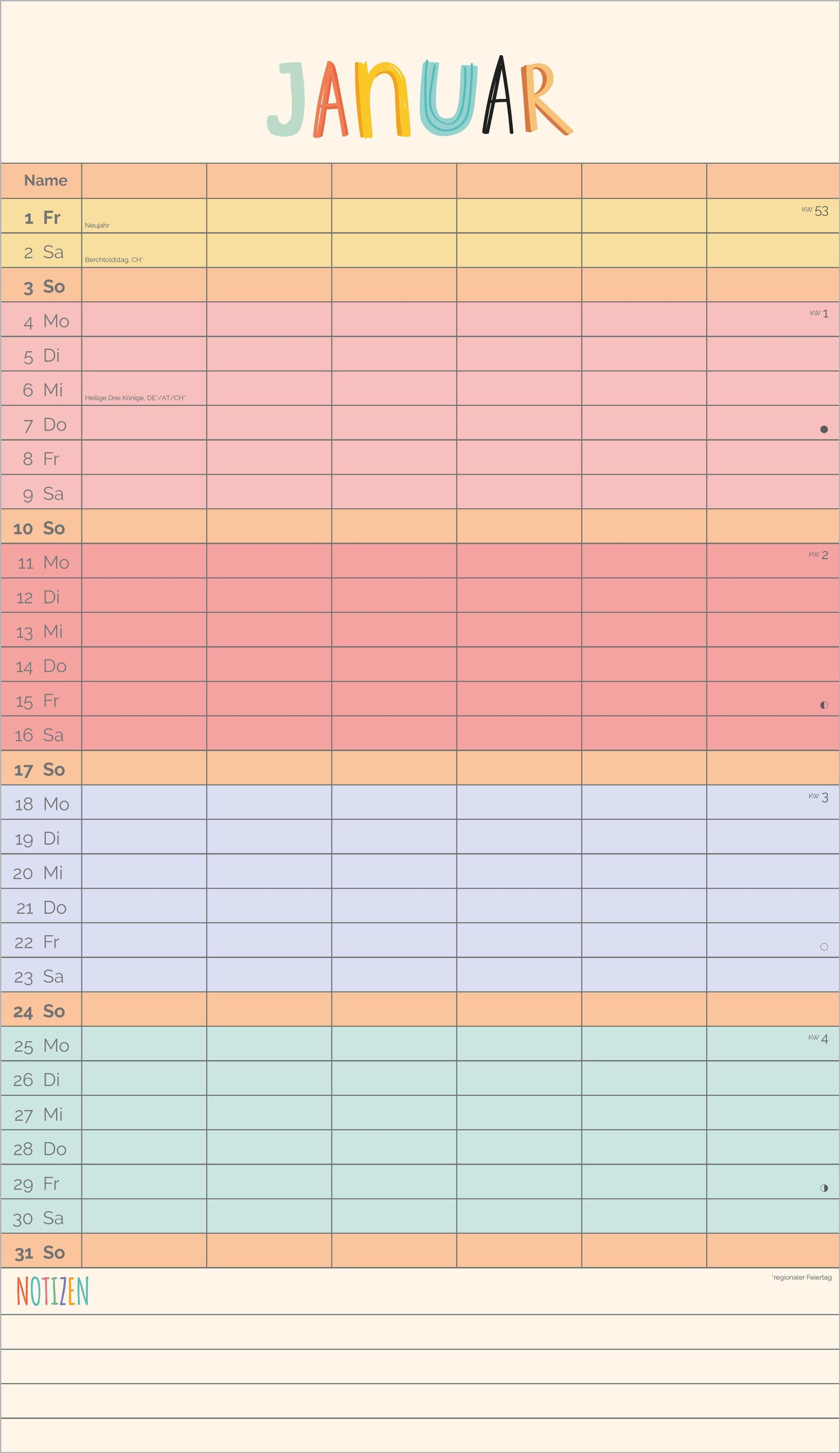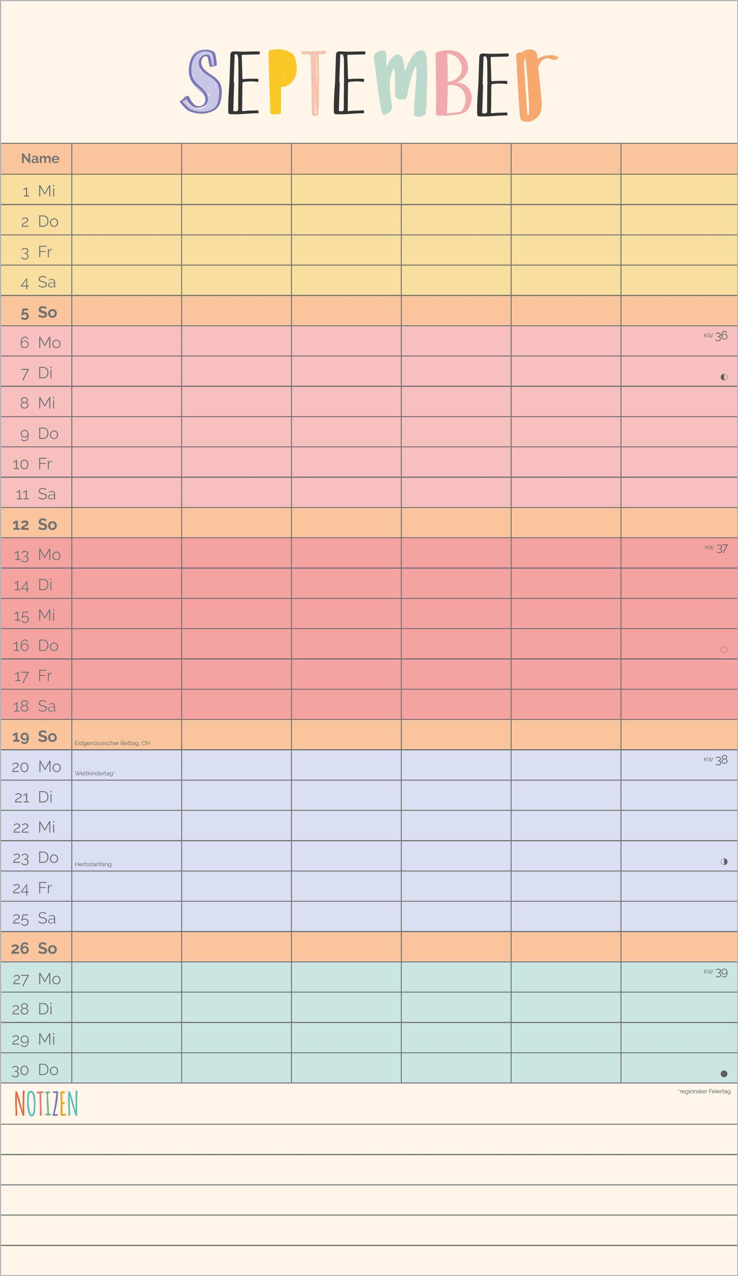 6 Spalten für die ganze Familie: Übersichtliche Eintragung von Terminen, Geburtstagen und Aktivitäten.