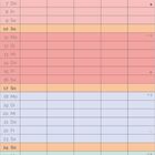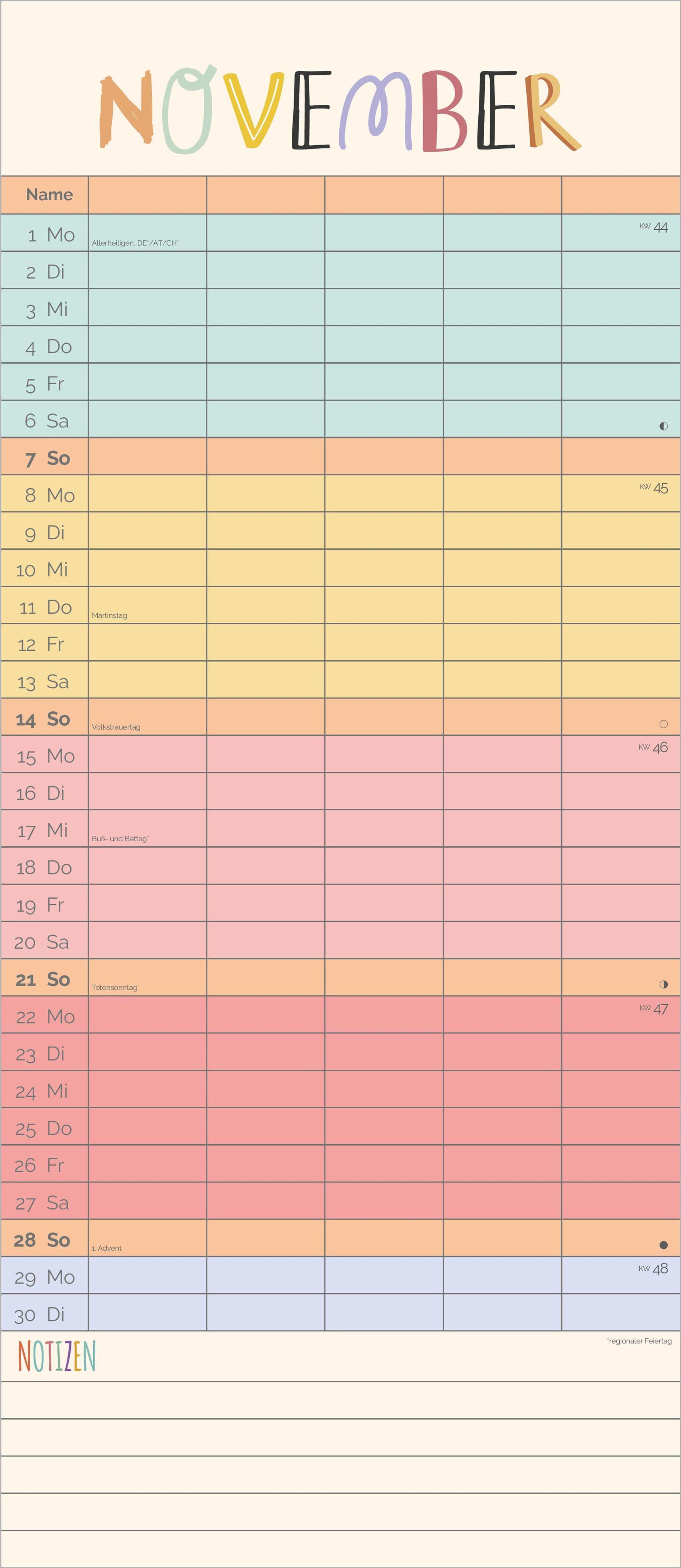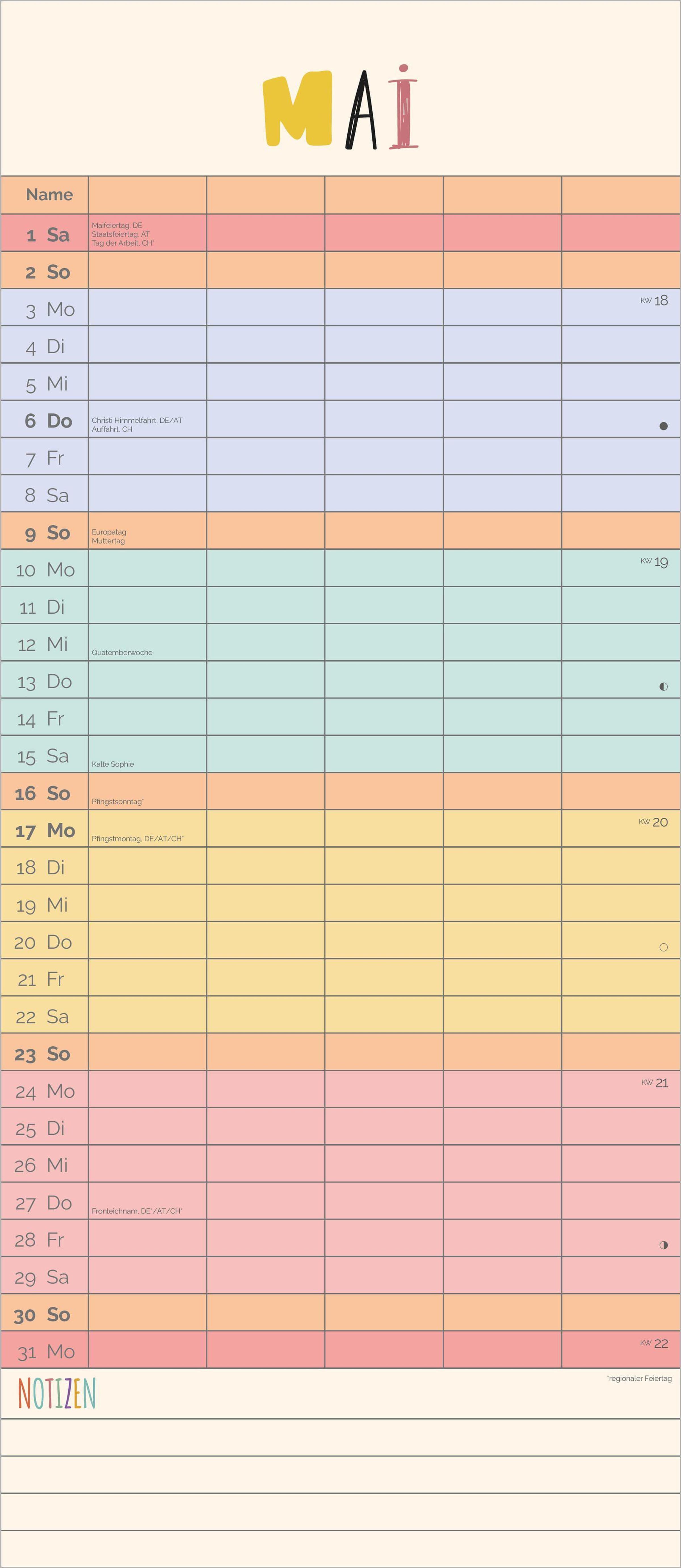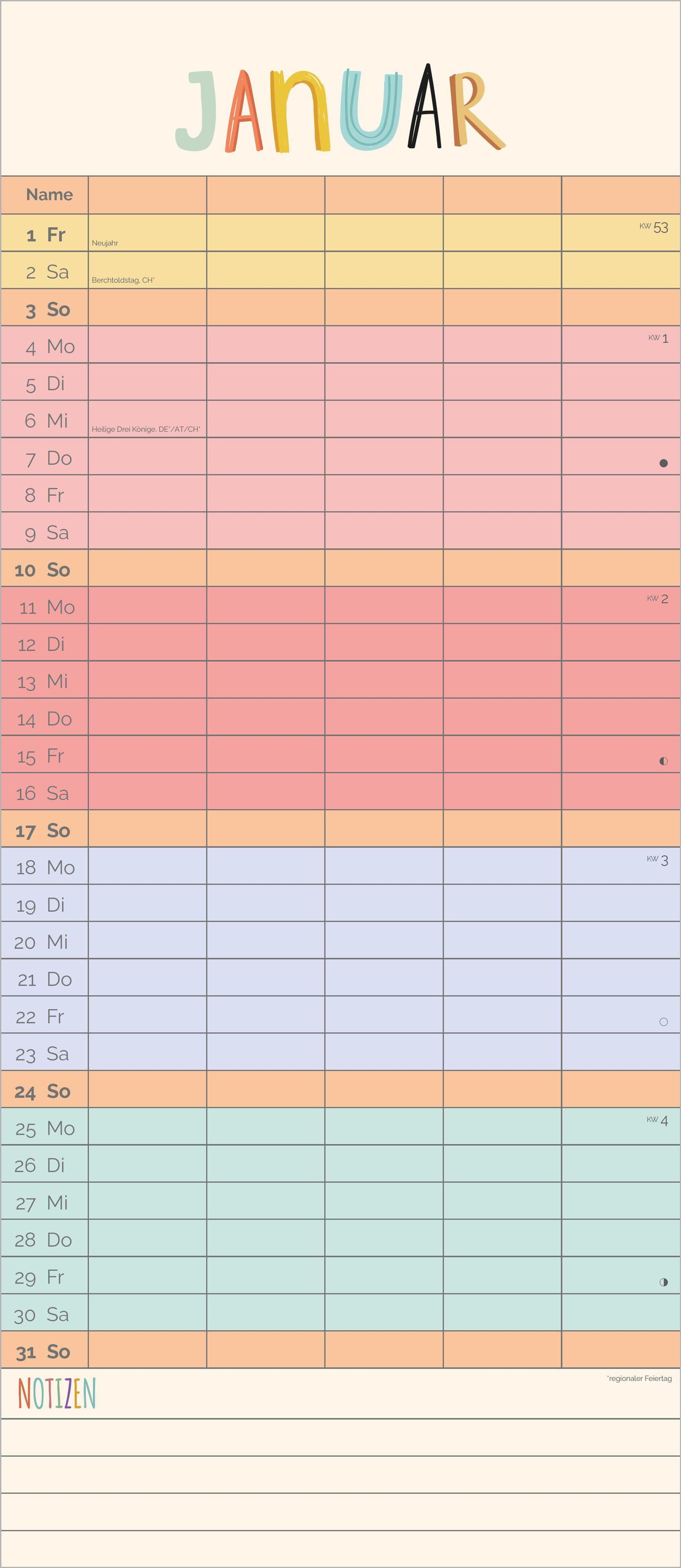 „Unser buntes Jahr“, 5 Spalten, Notizmöglichkeiten, Mondphasen, Ferien, Kalenderwochen. Farbig gestalteter Kalender., Kalender