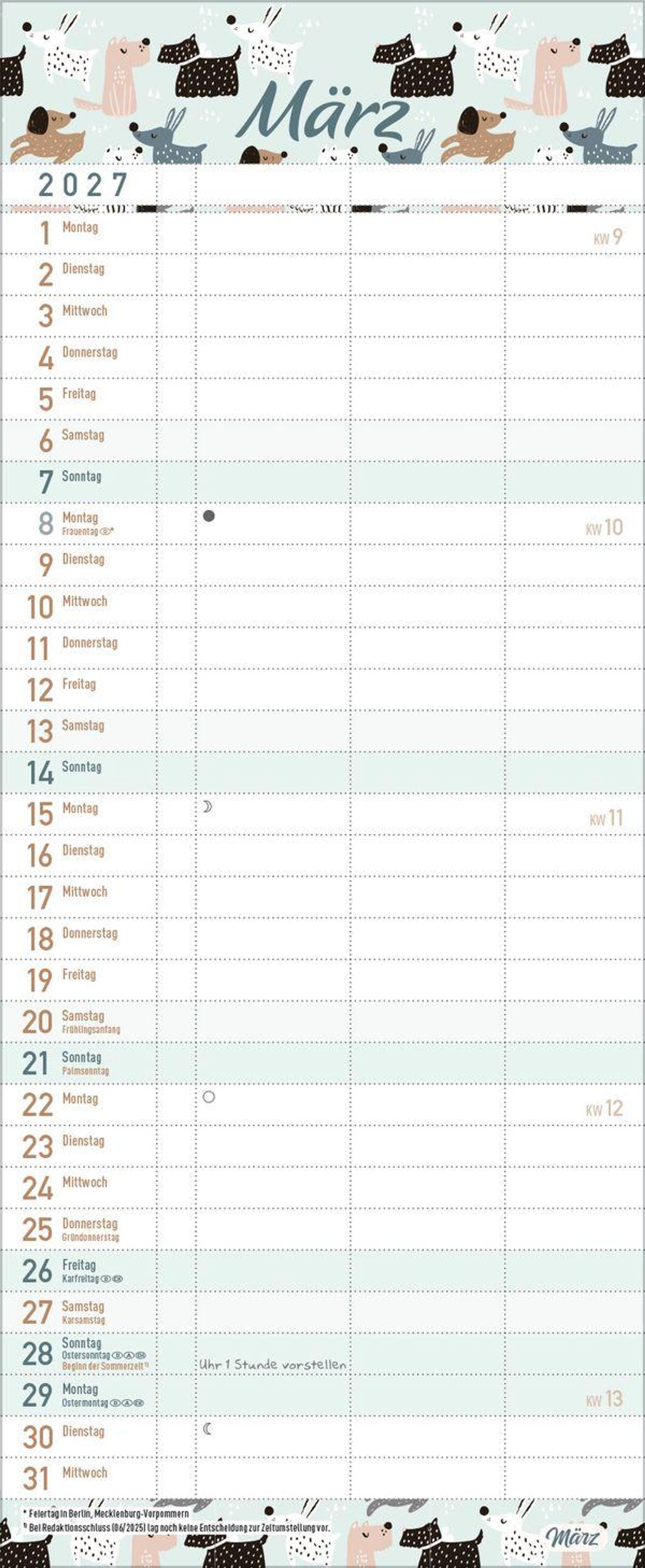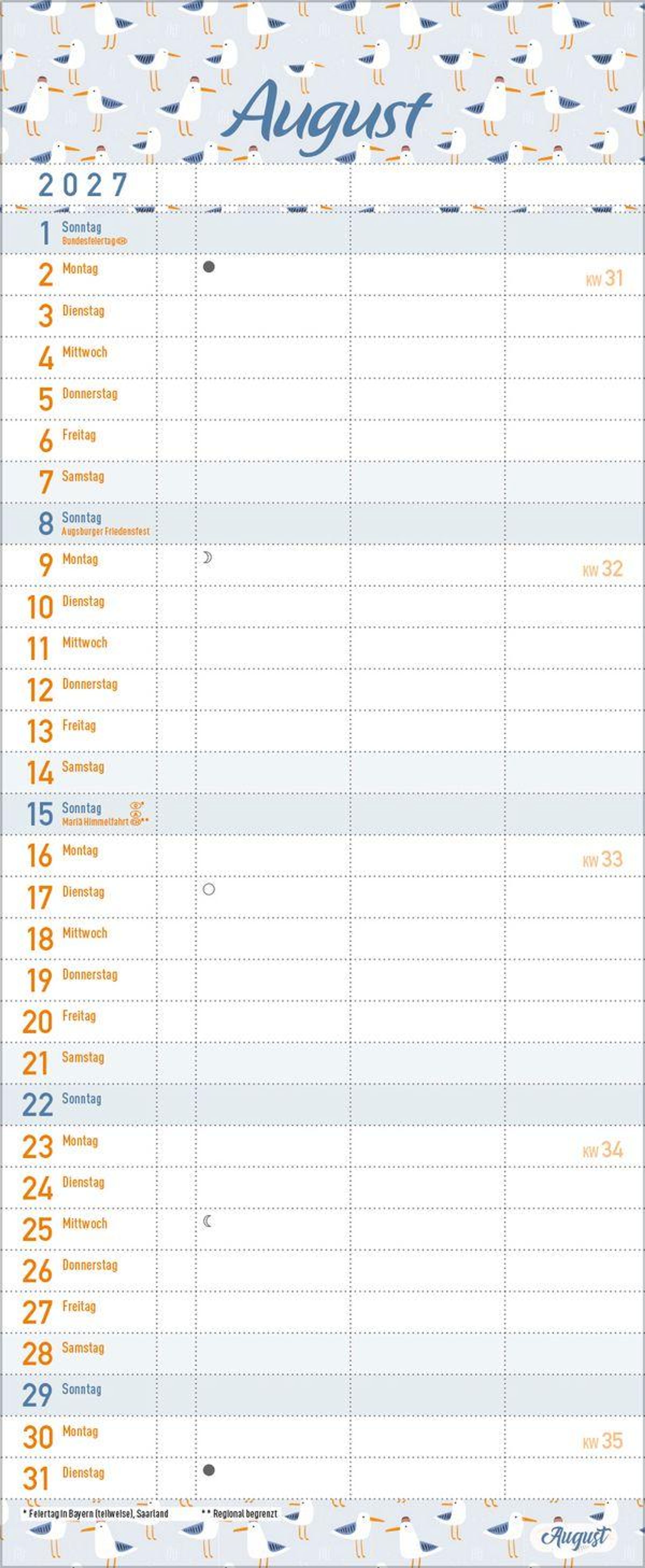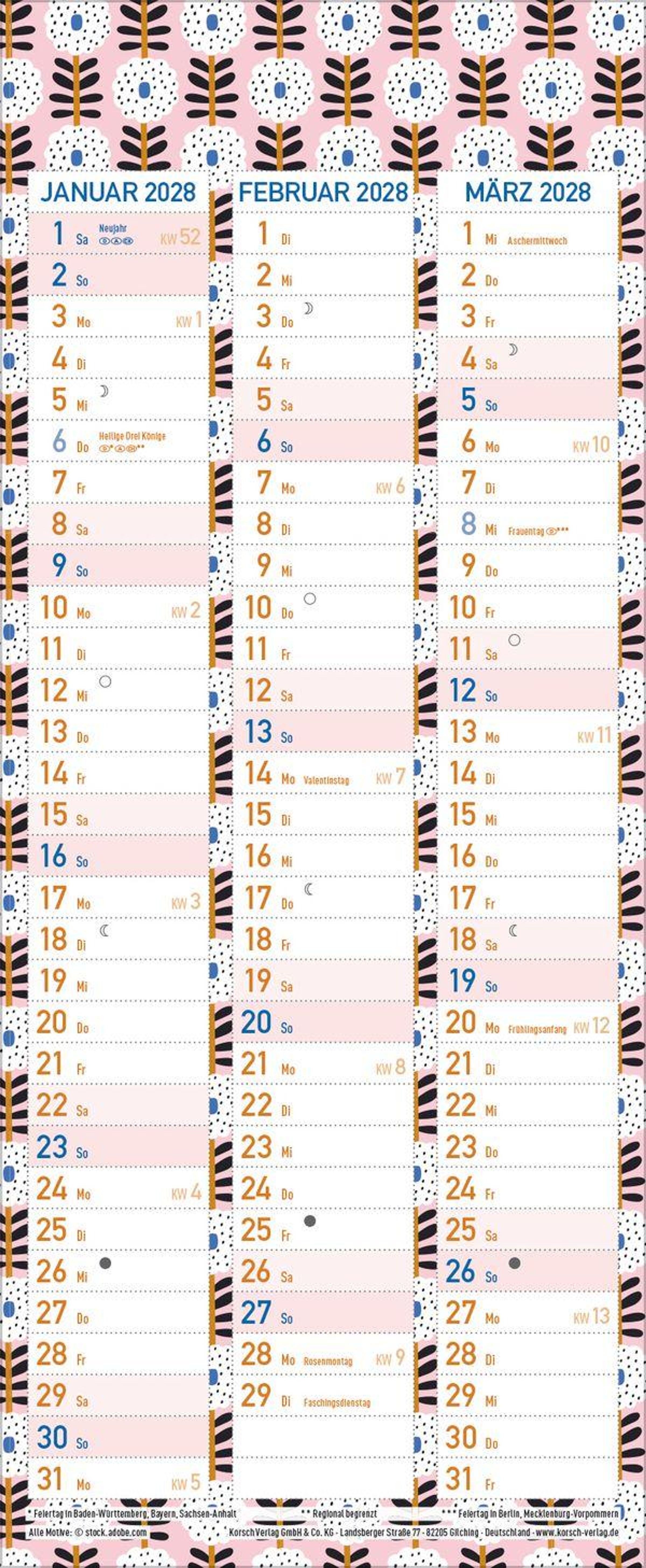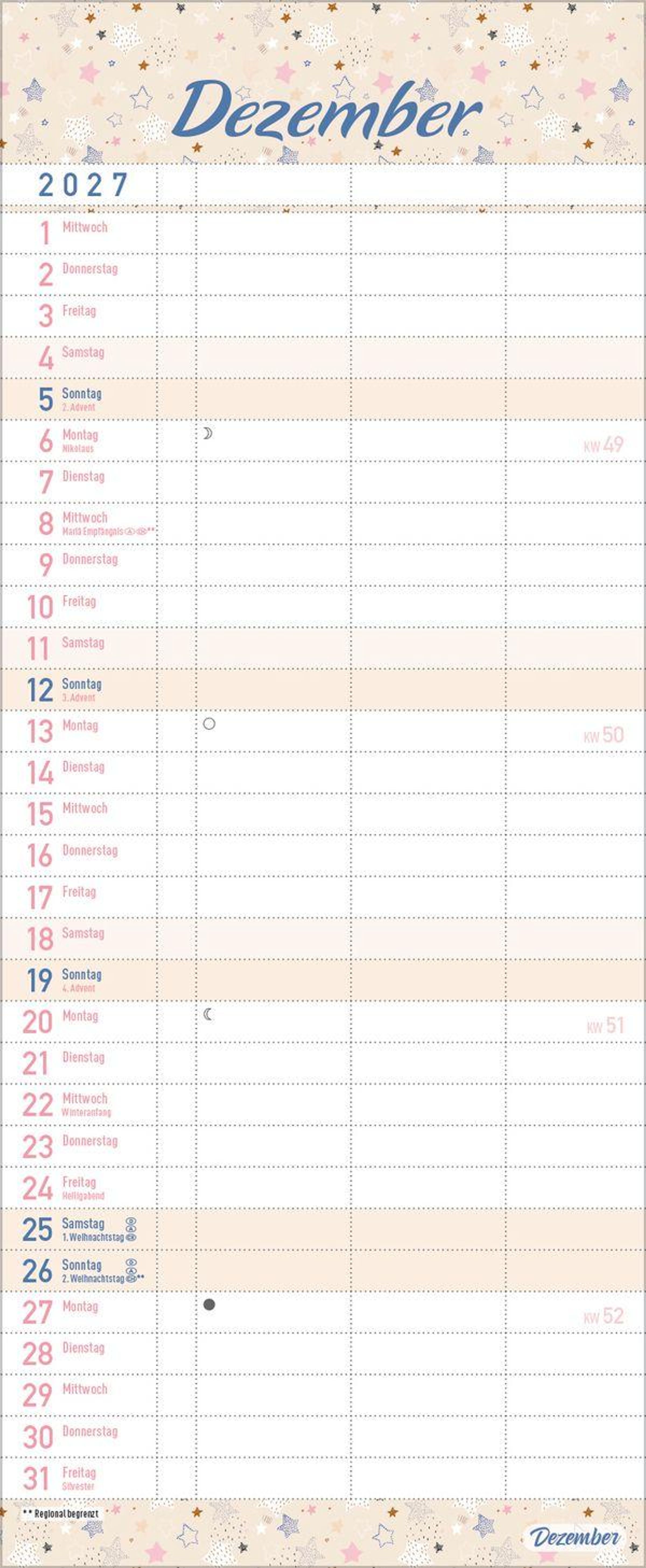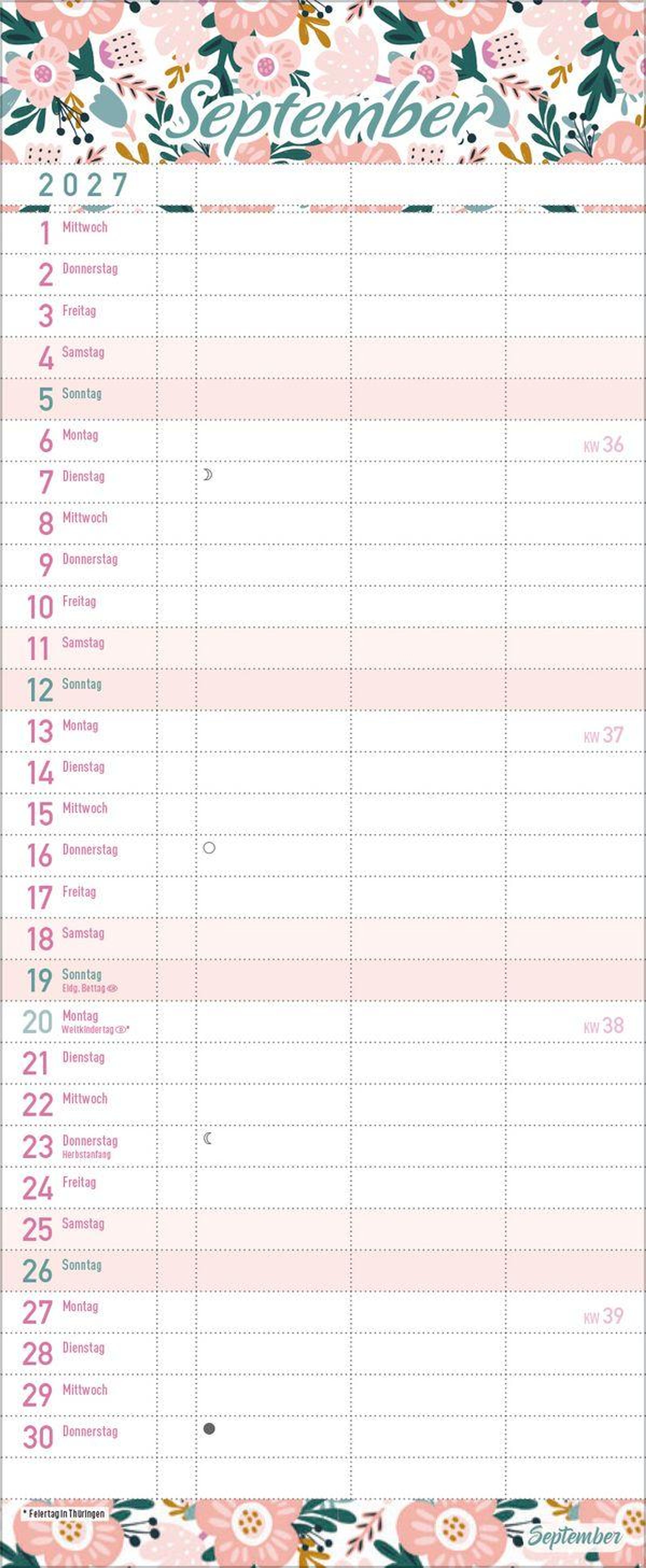 - Familienkalender, 3 Spalten. Familientimer mit Ferienterminen, extra Spalte und Vorschau bis März 2027. Kleines Format: 14 x 34 cm