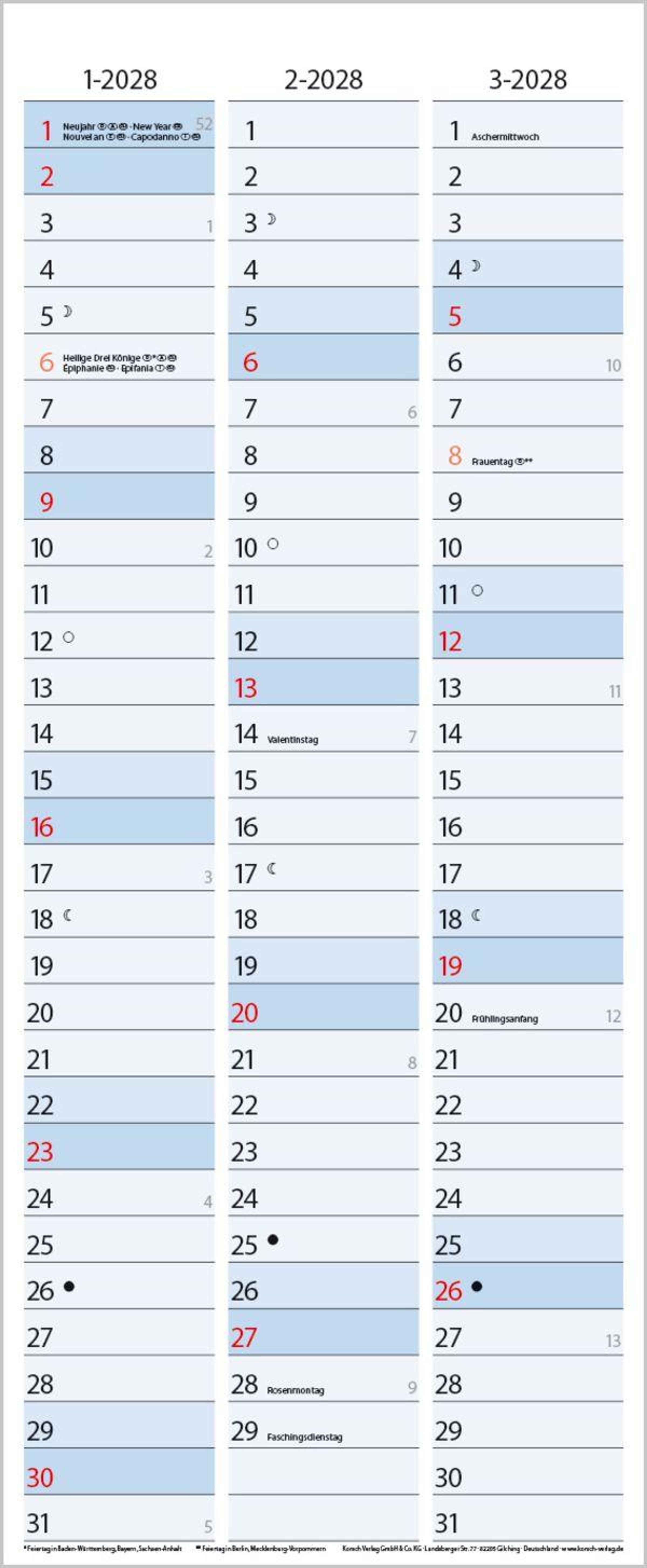 Weitere Informationen wie Mondphasen , Ferientermine und Feiertage (auch regionale) sowie deutlich lesbare Kalenderwochen runden den Kalender ab und sorgen für einen vollständigen Überblick Ihres Jahres.