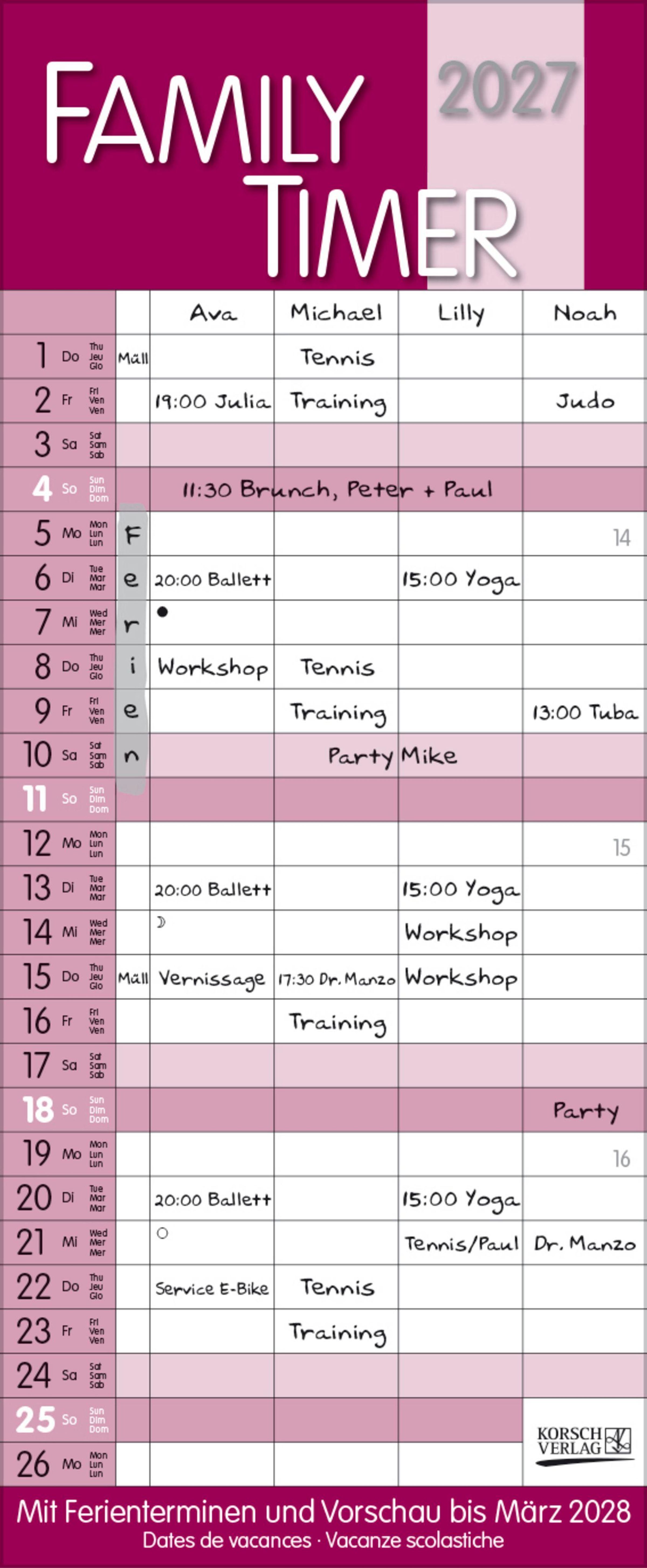 - Familienplaner mit 4 breiten Spalten. Hochwertiger Familienkalender mit Ferienterminen, Vorschau bis März 2027 und nützlichen Zusatzinformationen.