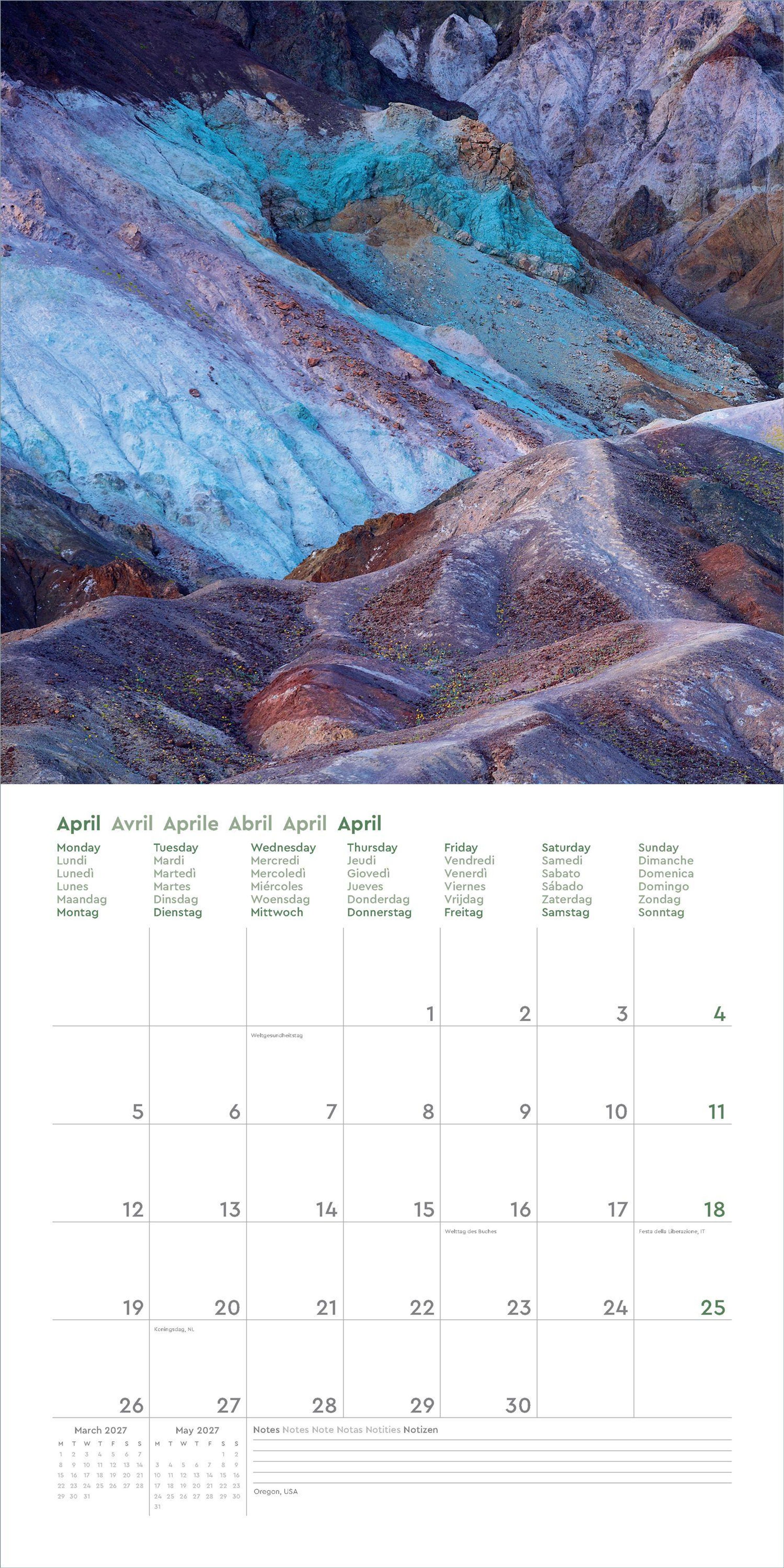 „2027 Farben der Erde, Colours of the Earth“. Eine bunte Berglandschaft mit blauen, lila und braunen Tönen., Kalender