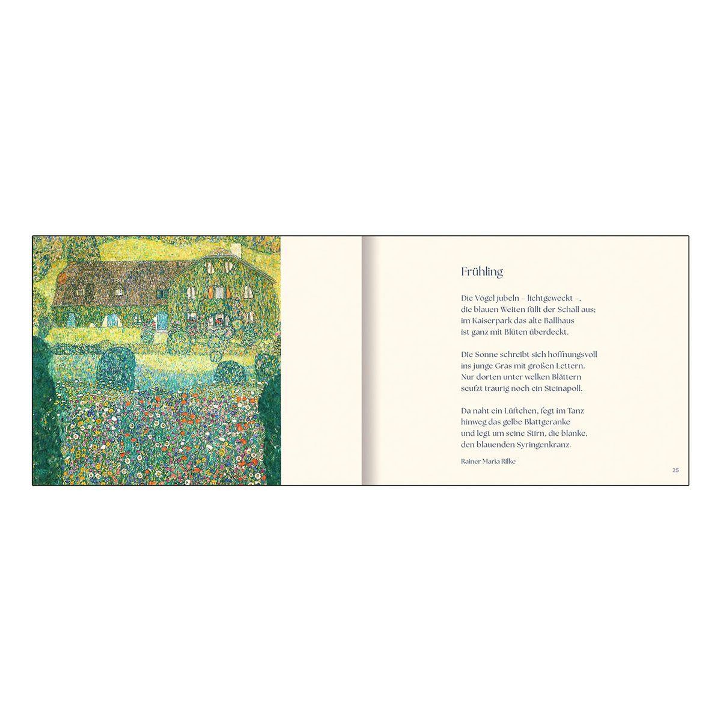 Die Gemälde von Gustav Klimt faszinieren Betrachter und Kunstkenner bis heute. Dieses Buch verbindet die schönsten Frühlingsmotive des beliebten Malers des Jugendstils mit kurzen Texten und Geschichten beliebter Zeitgenossen wie Rainer Maria Rilke, Hugo von Hofmannsthal und Stefan George. Ihre Botschaft ist optimistisch, da die Bilder wie 'Bauerngarten', 'Park' oder auch 'Mohnwiese' der Sehnsucht nach Ruhe und Muße Raum geben. Gemälde und Zeichnungen aus allen Schaffensphasen des Künstlers laden zur stillen Betrachtung ein. Ein ausführliches Bildverzeichnis sowie eine Kurzbiografie liefern interessante Hintergrundinformationen zum Werk des großen Malers. Autoren: Rainer Maria Rilke Wilhelm Busch Hugo von Hofmannsthal Theodor Fontane Stefan George Heinrich Heine Christian Morgenstern u. a.