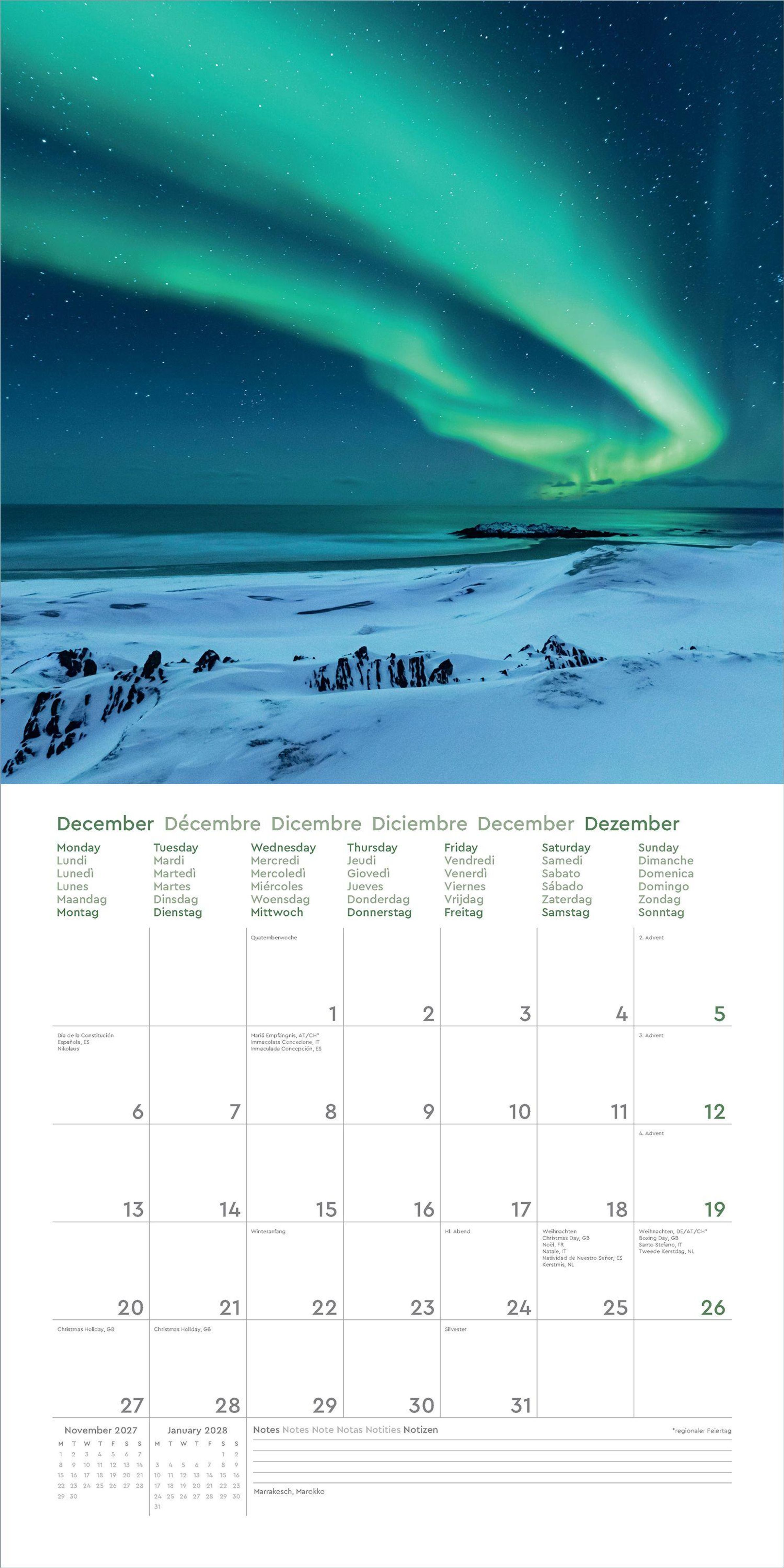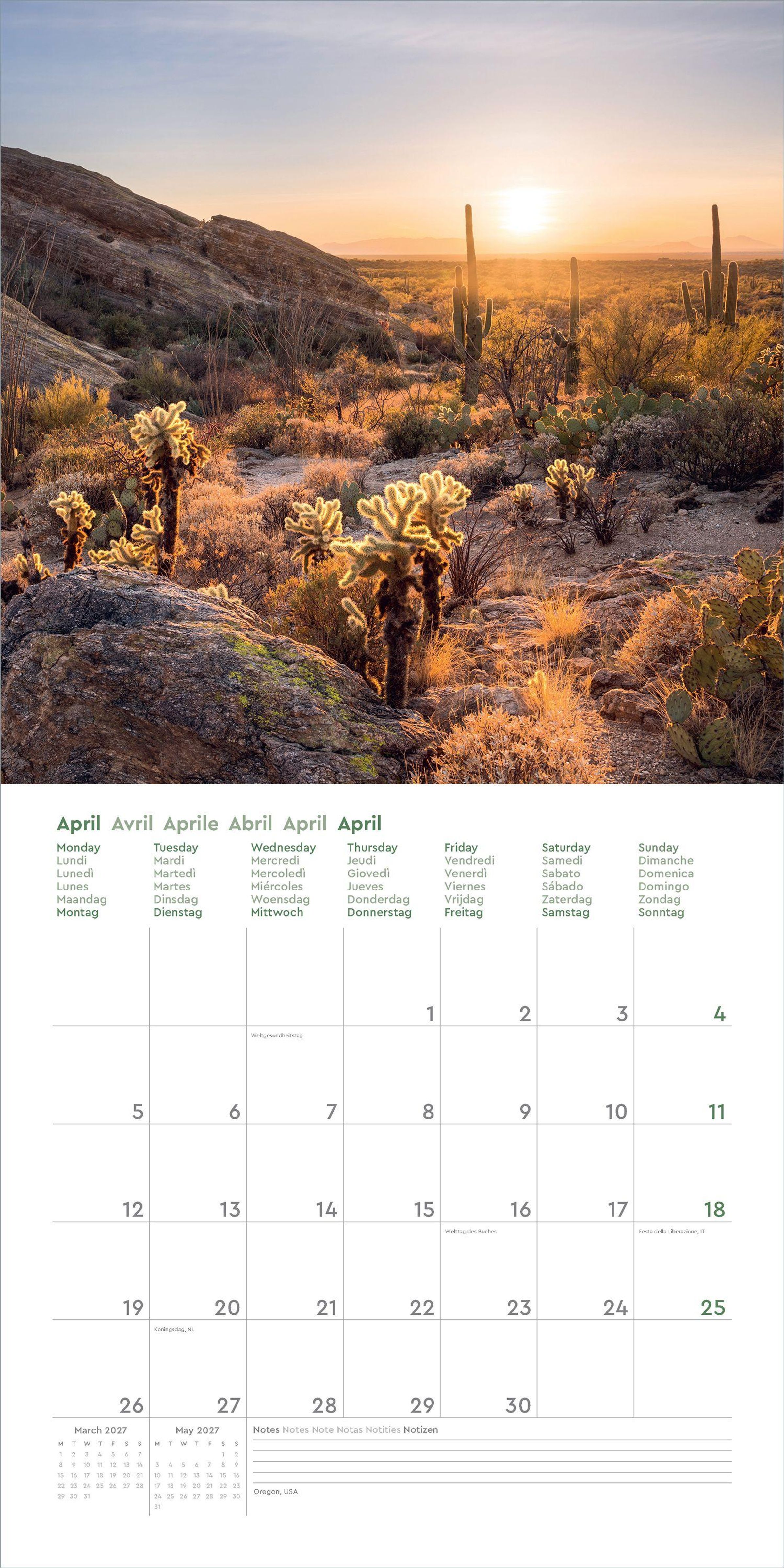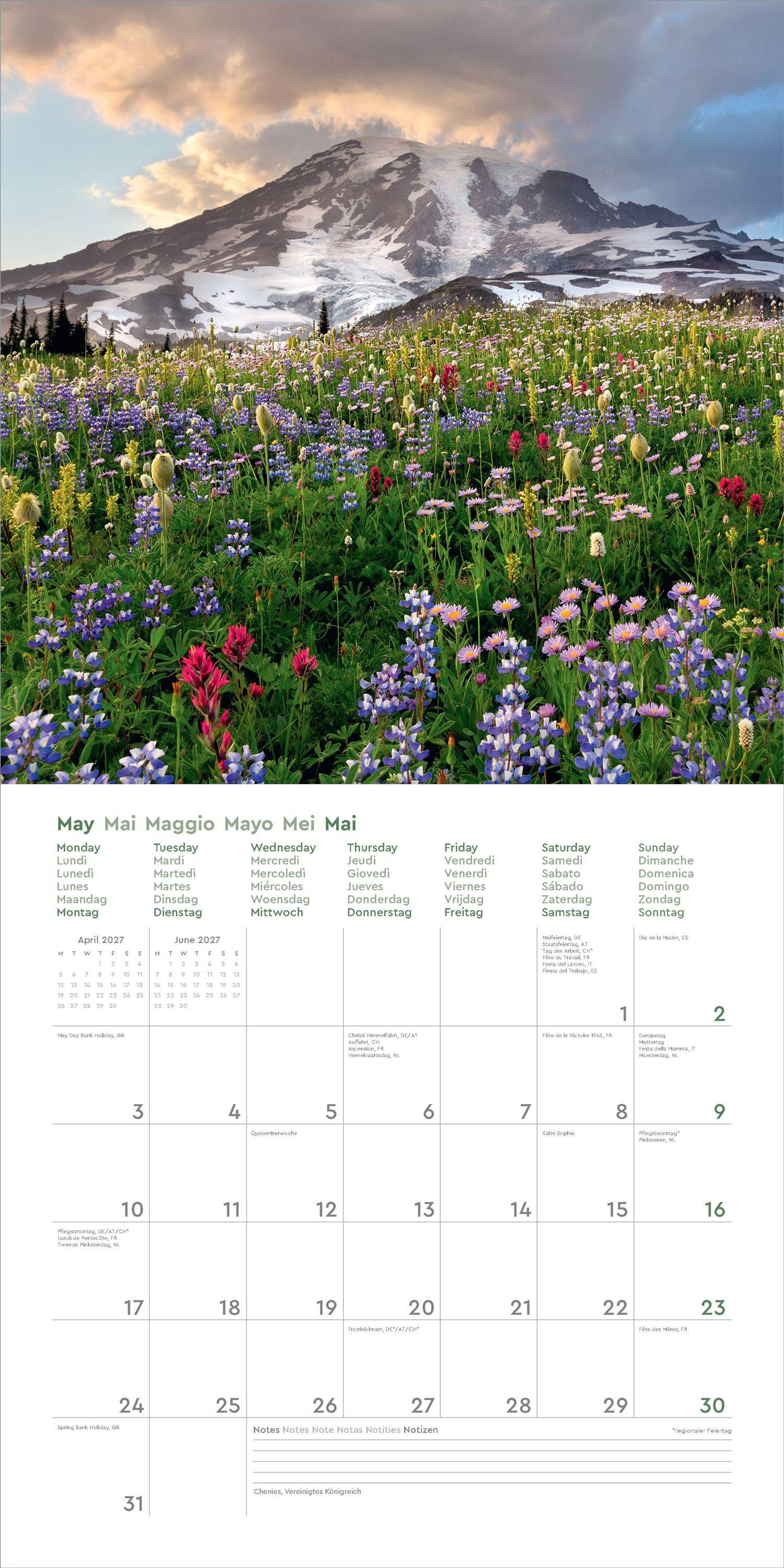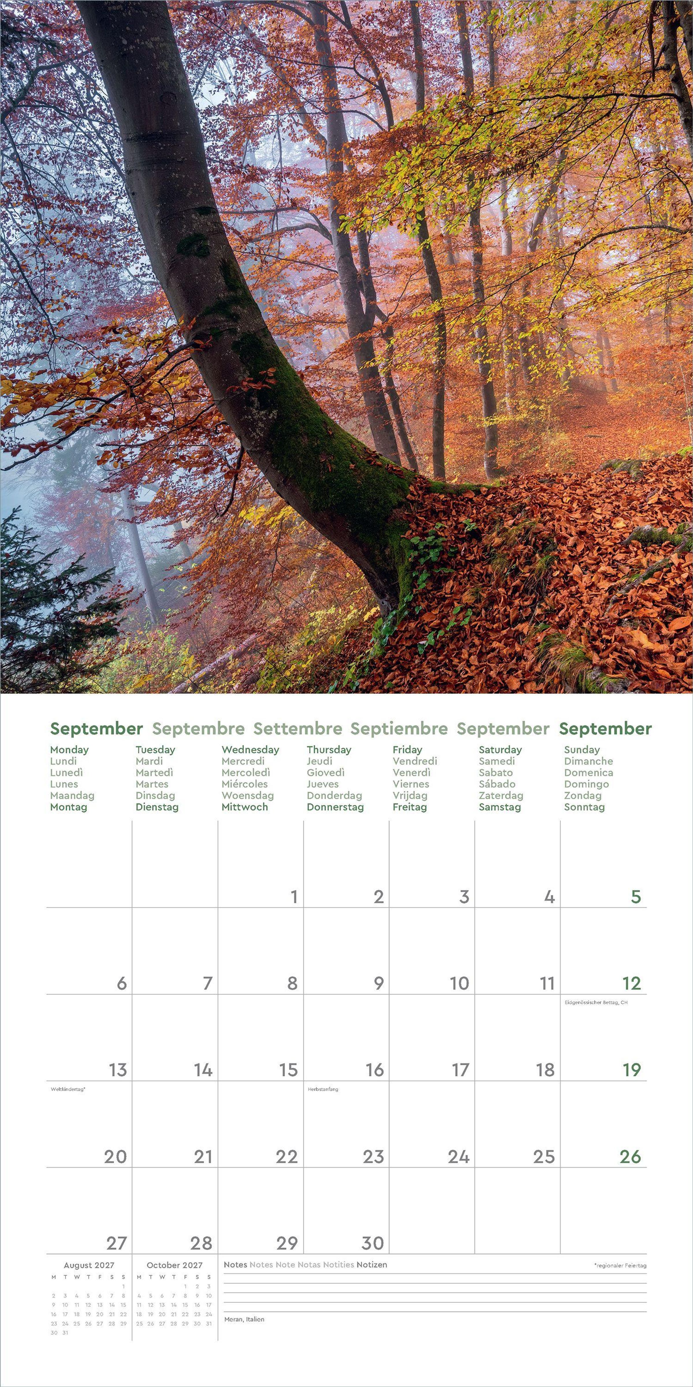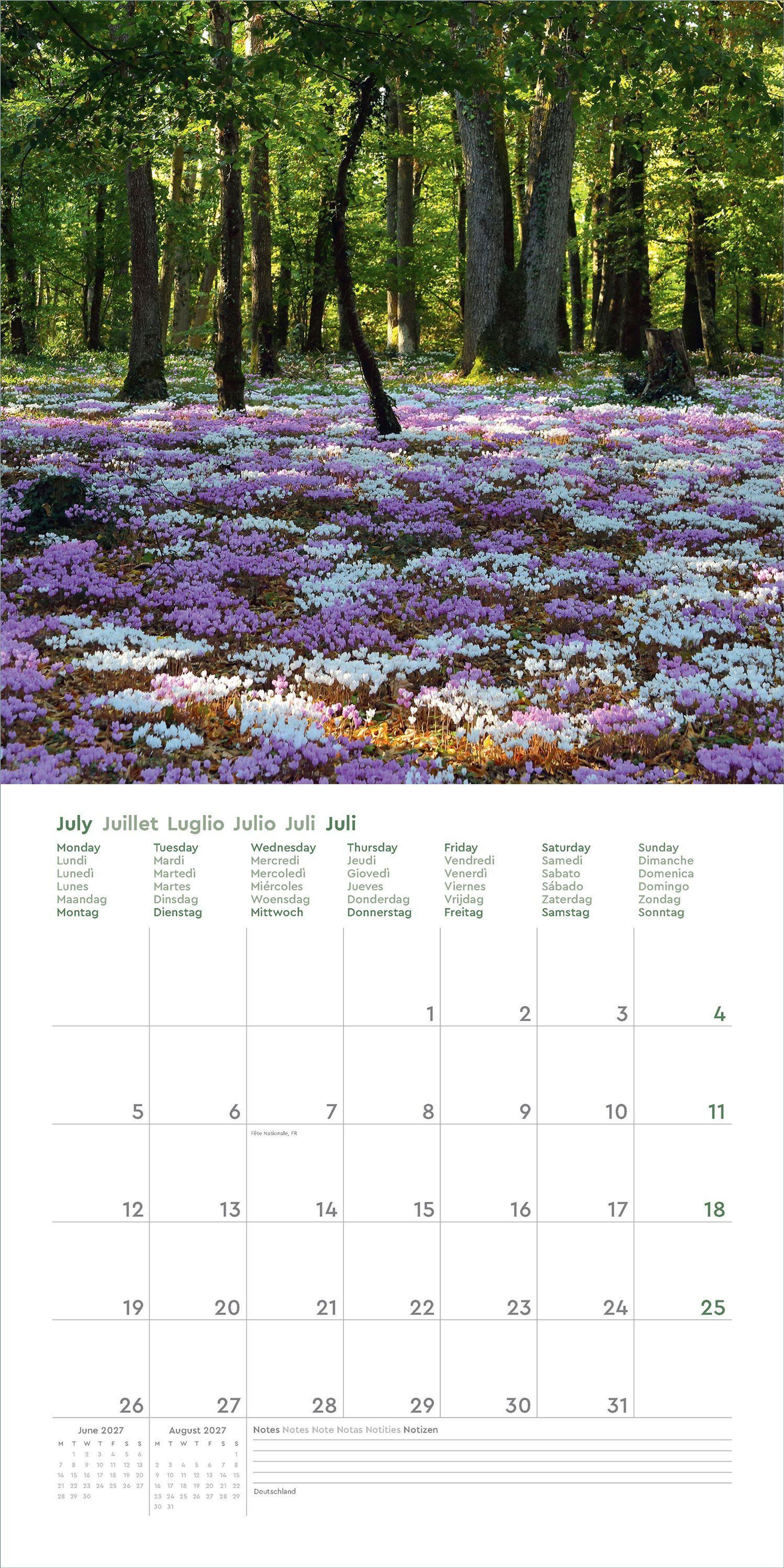 • Farbenprächtiger Wandkalender mit Monatskalendarium für Notizen