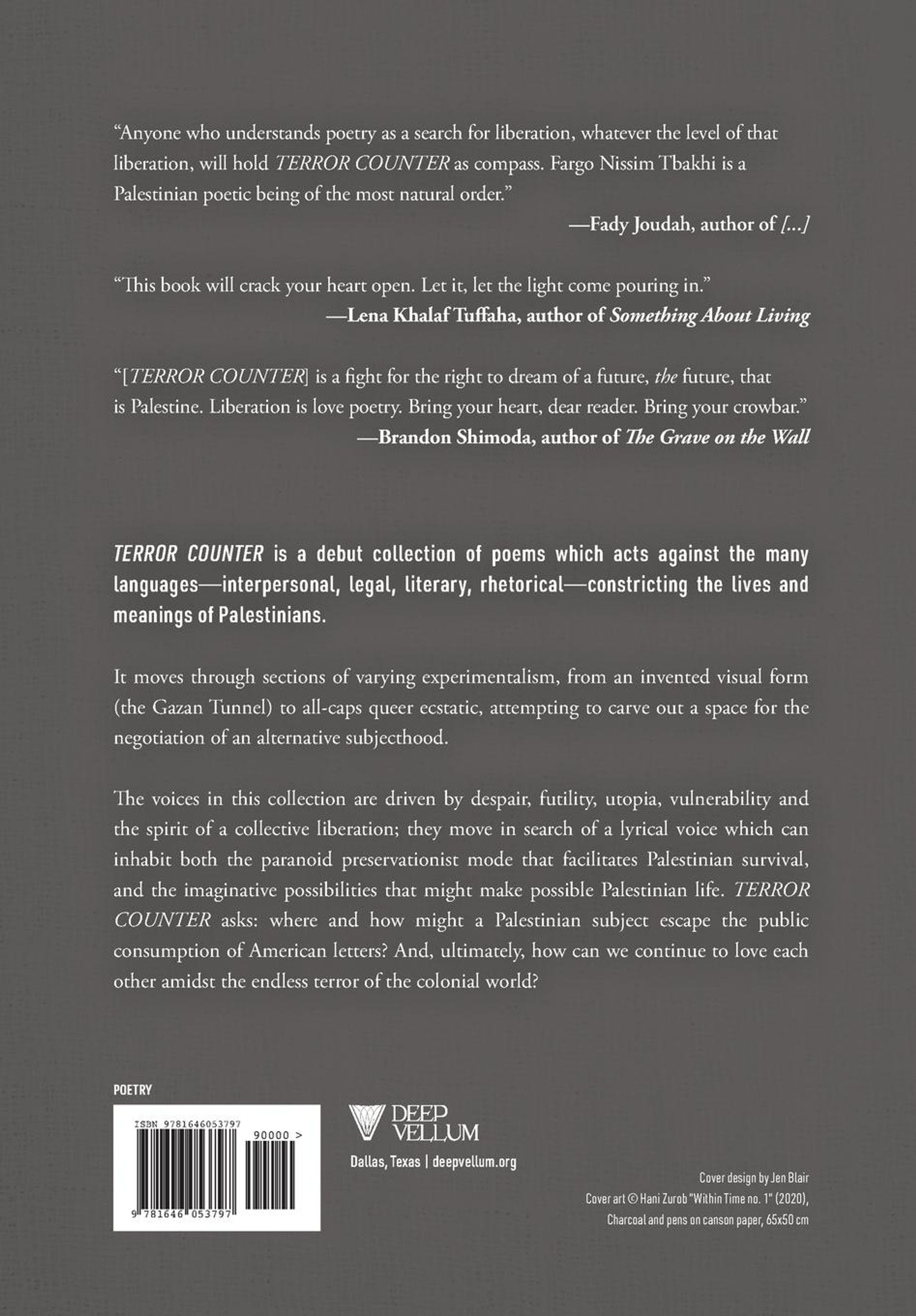 TERROR COUNTER is a debut collection of poems which acts against the many languages---interpersonal, legal, literary, rhetorical---constricting the lives and meanings of Palestinians.