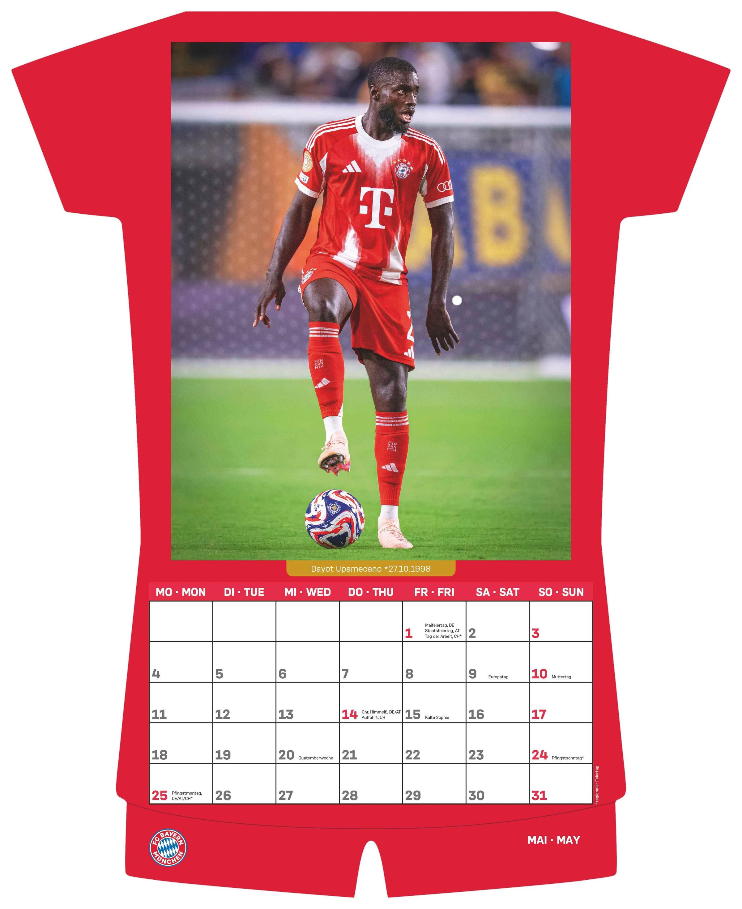 Der FC Bayern München Trikotkalender 2026 ist ein origineller Hingucker für alle Fans des Rekordmeisters. In Form eines Trikots gestaltet, zeigt er Monat für Monat faszinierende Fotografien rund um die erfolgreichsten Spieltage und Momente der letzten Saison -- ein Muss für jeden Bayern-Fan.
