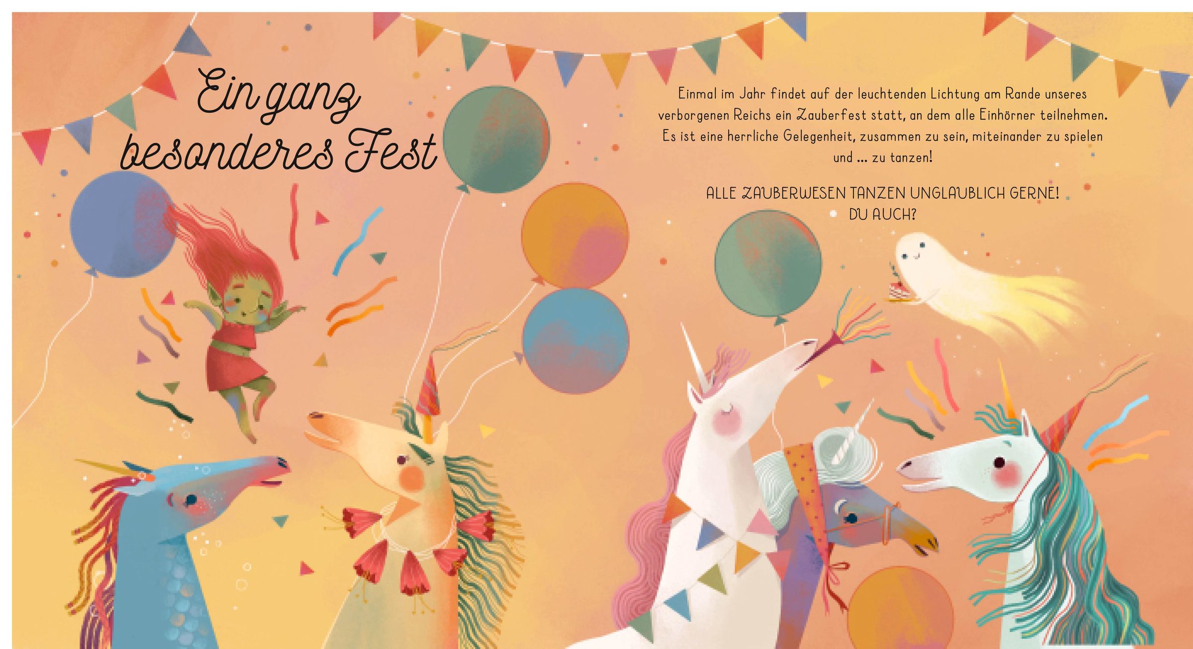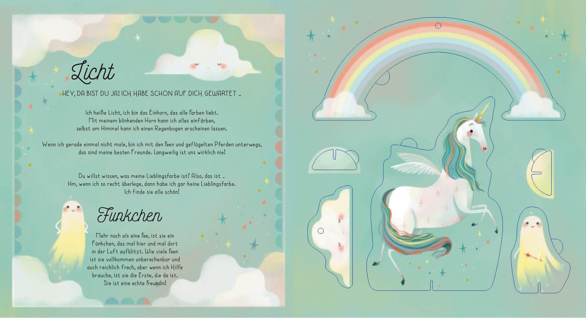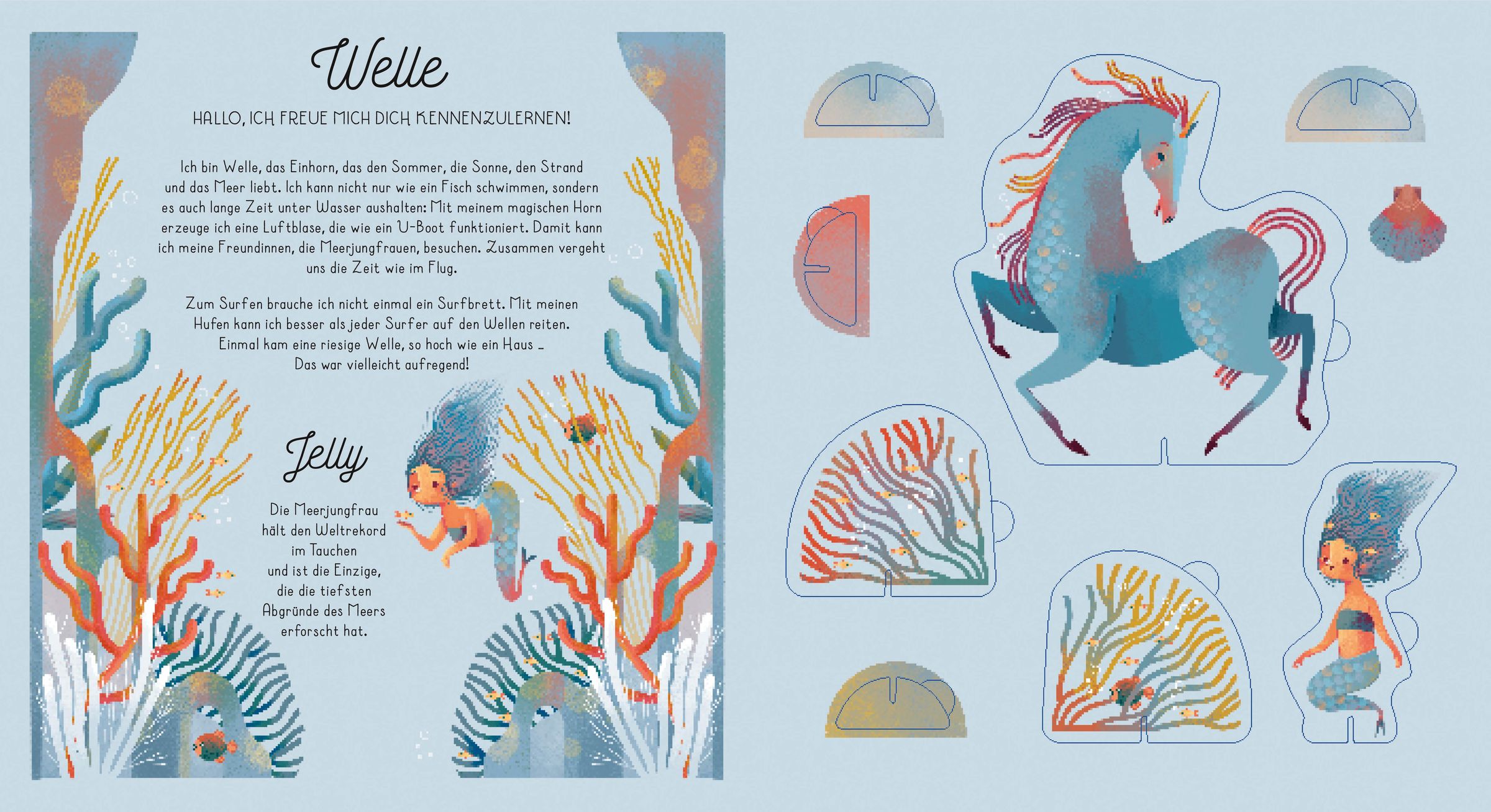 Hinter dem Horizont, am Ende des Regenbogens liegt sie - die fantastische Welt der Einhörner. Hier ist alles möglich und du kannst jeden Tag aufs Neue ein zauberhaftes Abenteuer erleben. In diesem magischen Einhorn-Bilderbuch entdeckst du ihr poetisches Paradies in zarten Farben. Du findest darin auch viele 3D-Figuren von den Einhörnern und ihren Freunden, damit du mit allen spielen kannst. Einfach die gestanzten Spielfiguren entnehmen, in die Standfüße aus dickem Karton stecken und loslegen. Tauche mit ihnen ein in den Ozean, feiert zusammen ein märchenhaftes Fest, tanzt im Schnee oder besucht die Einhorn-Schule im Wald.