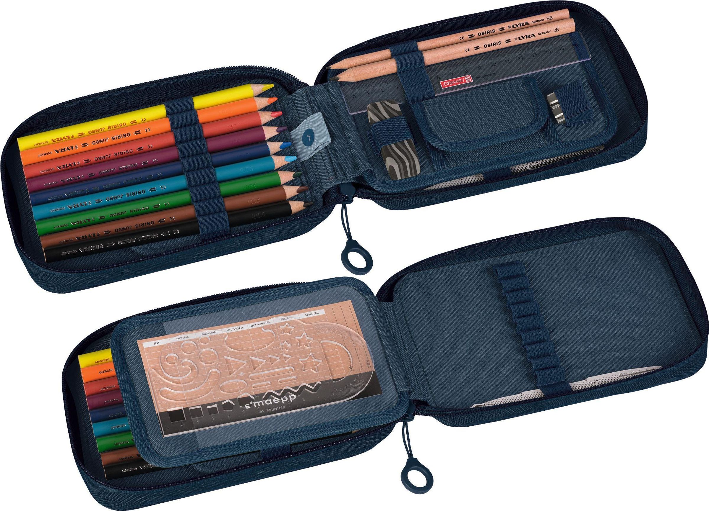 B/H/T: 200×125×45 mm ? Kunstfaser, Farbe: denim ? Inhalt: 9 dicke Markenbuntstifte, 2 Markenbleistifte, Lineal 16 cm, Metalldoppelspitzer, Radiergummi, Geldfach mit Klettverschluss, Stundenplan, Zeichenschablone ? innovative Stifterampe für leichteres Entnehmen, horizontales Öffnen spart Platz auf dem Schreibtisch, mit ergonomischem Zipper für müheloses Öffnen und Schließen