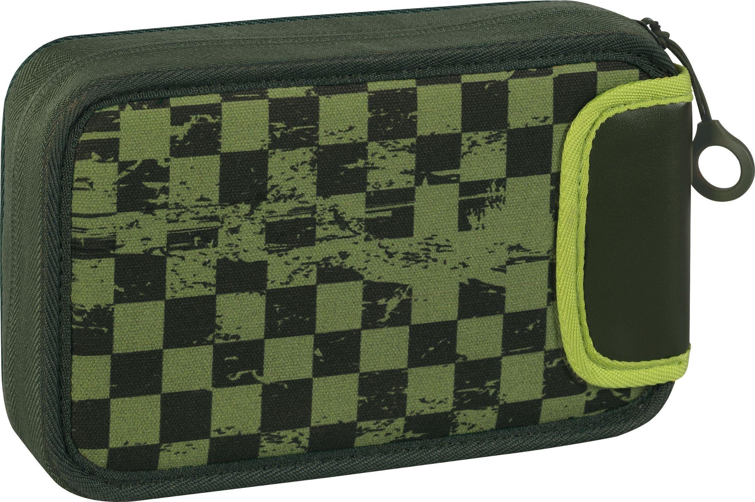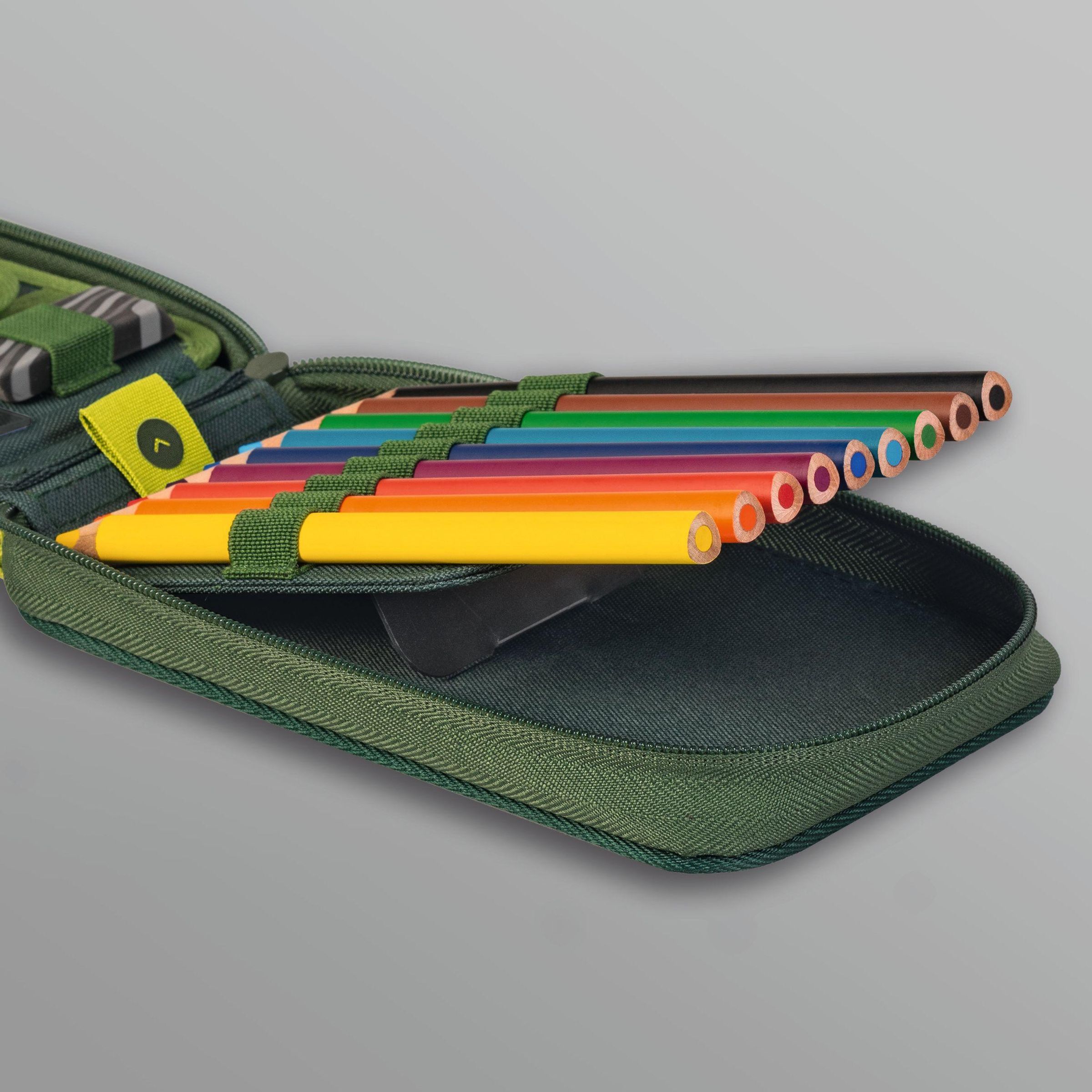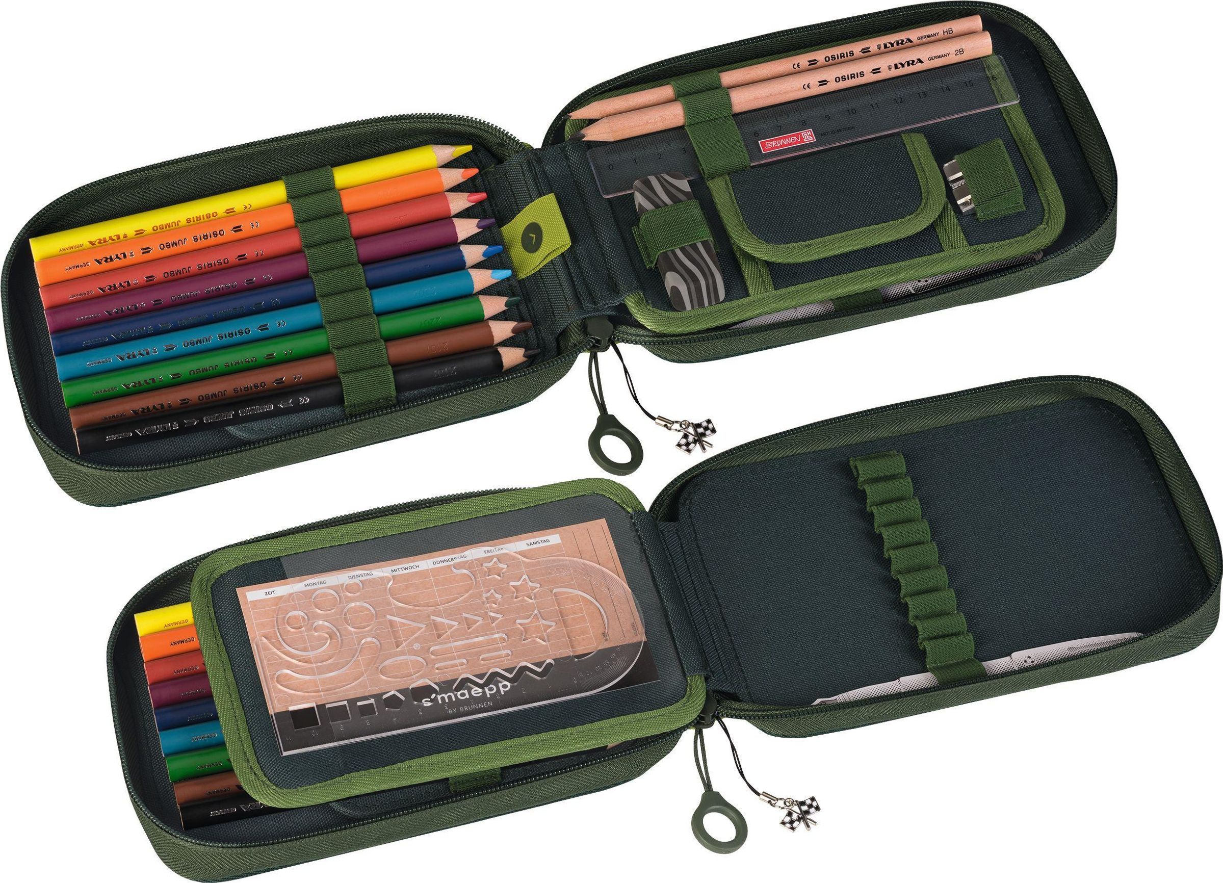 B/H/T: 200×125×45 mm ? Kunstfaser, Farbe: grün, mehrfarbig ? mit Anhänger ? Inhalt: 9 dicke Markenbuntstifte, 2 Markenbleistifte, Lineal 16 cm, Metalldoppelspitzer, Radiergummi, Geldfach mit Klettverschluss, Stundenplan, Zeichenschablone ? innovative Stifterampe für leichteres Entnehmen, horizontales Öffnen spart Platz auf dem Schreibtisch, mit ergonomischem Zipper für müheloses Öffnen und Schließen