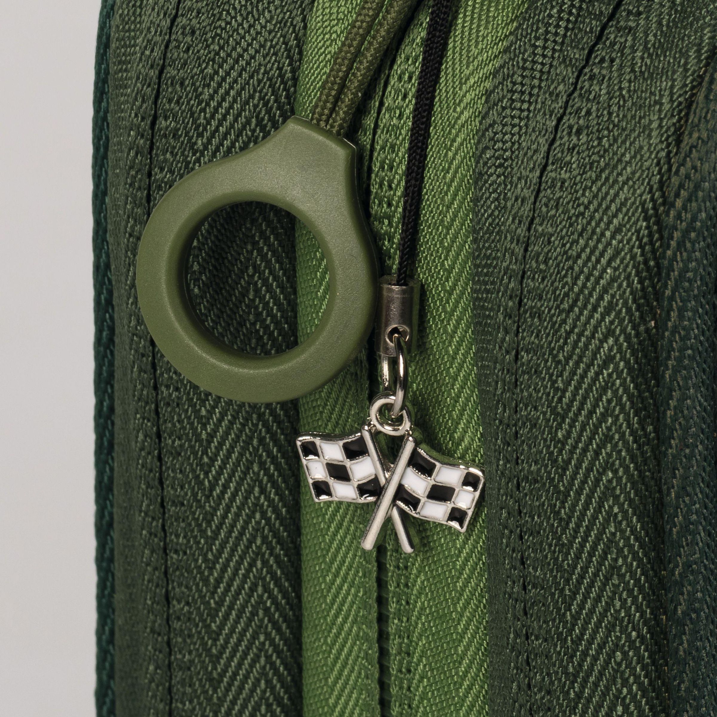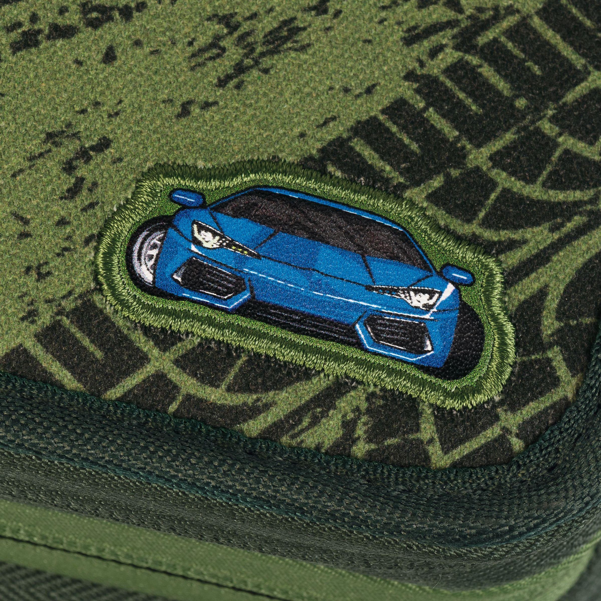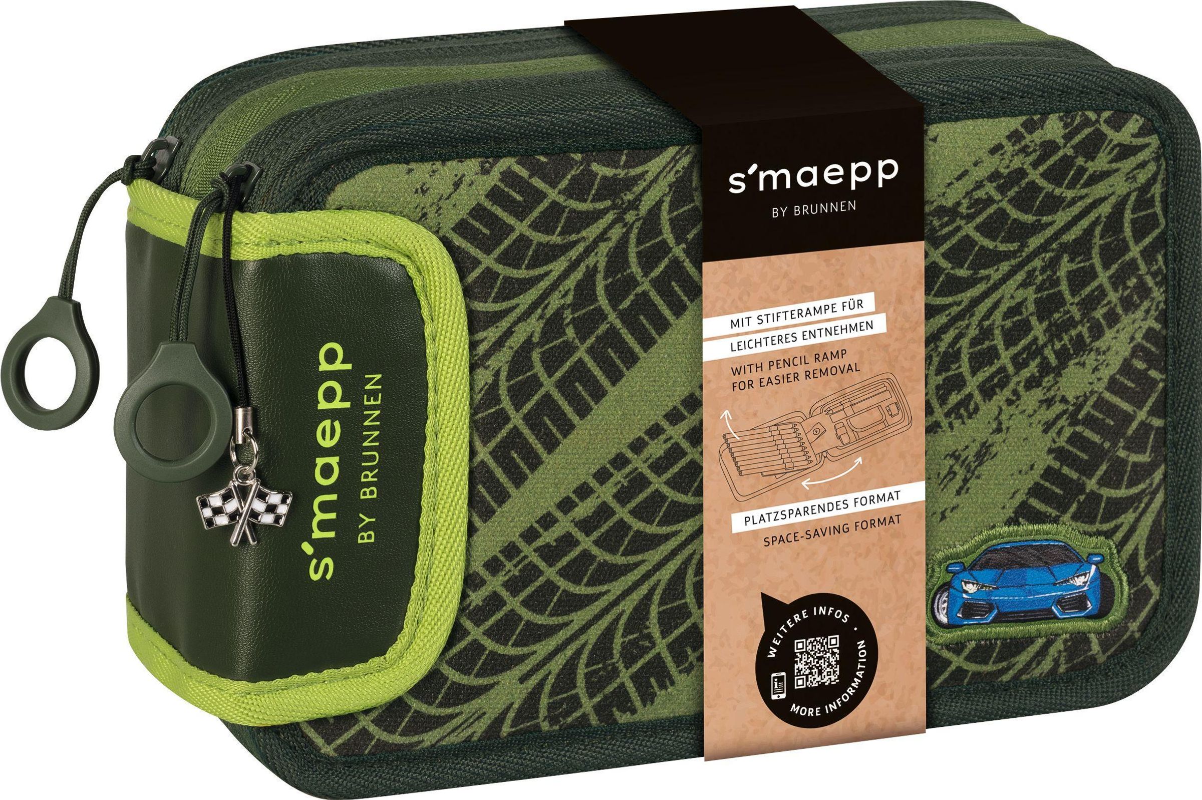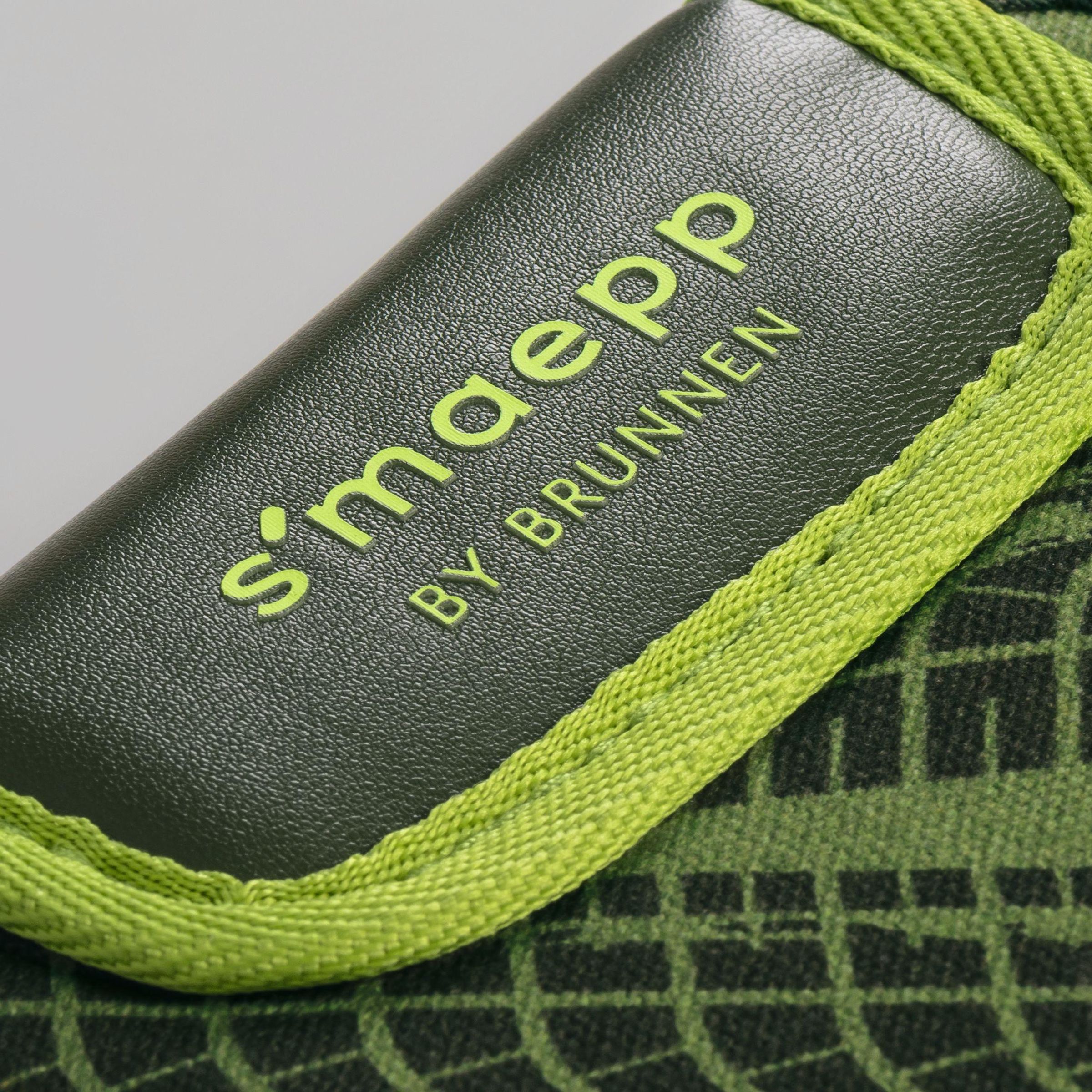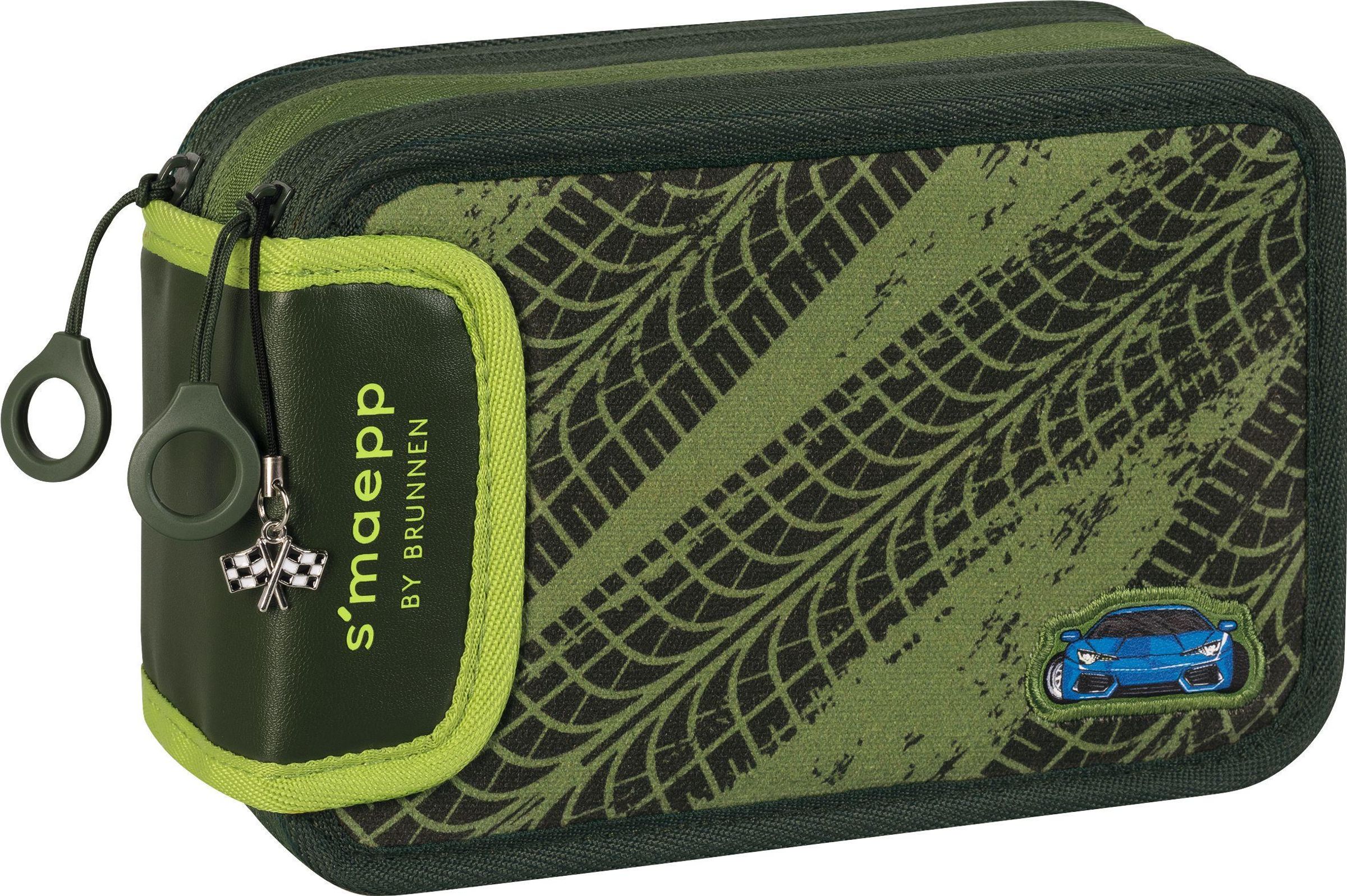 Text: "s'maepp BY BRUNNEN". Ein grünes Federmäppchen mit Reifenmustern und einem kleinen, blauen Auto als Detail., Diverse