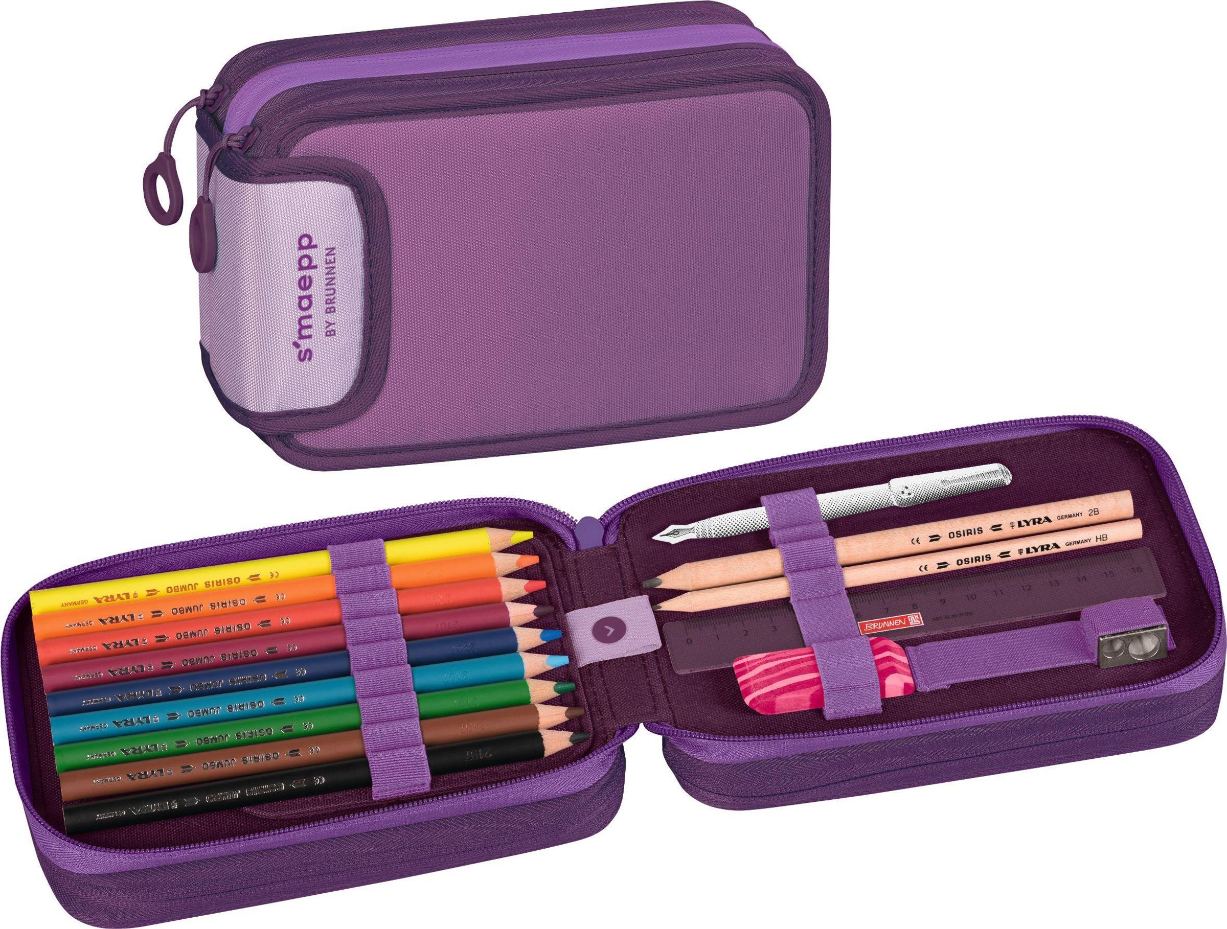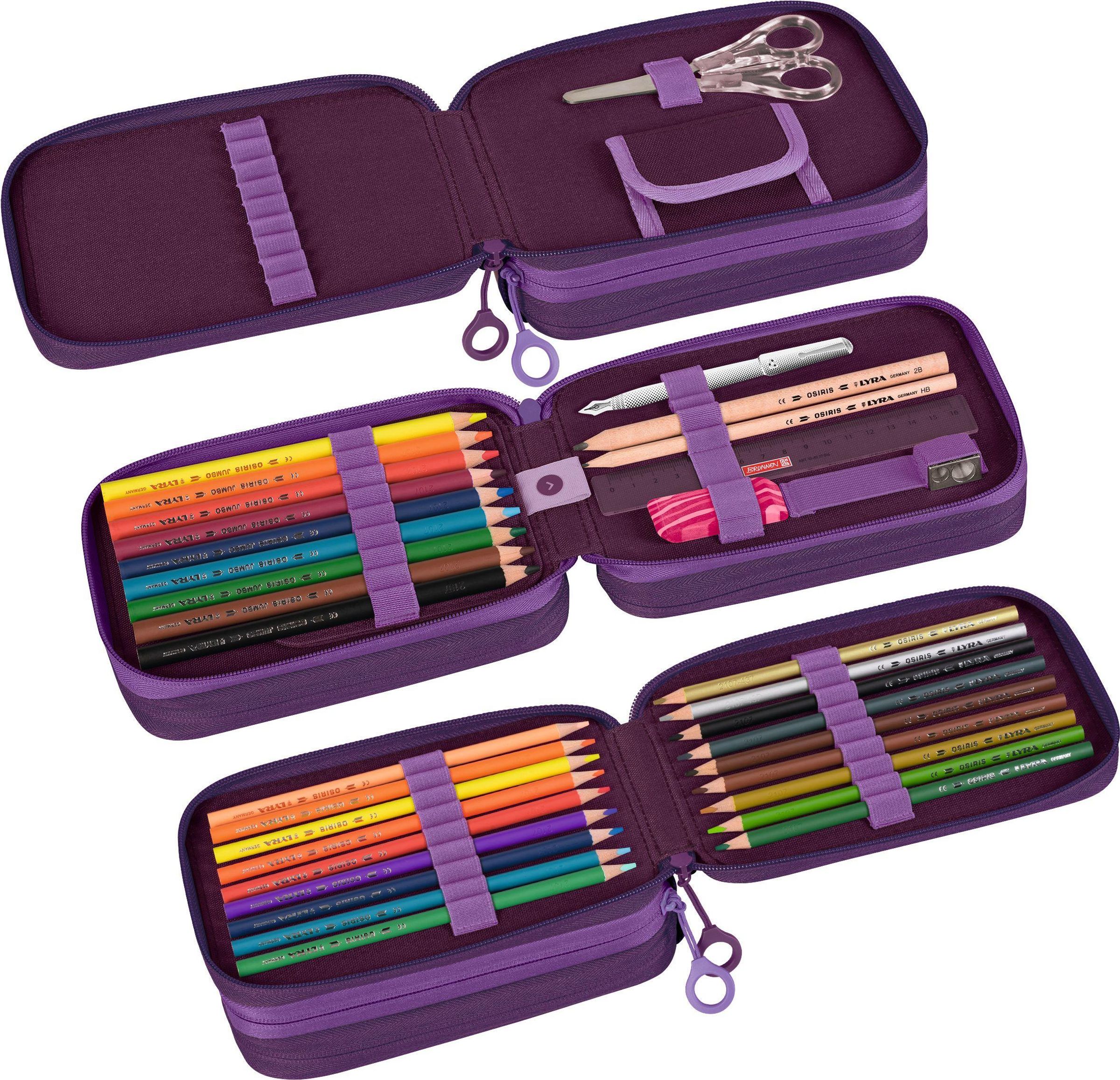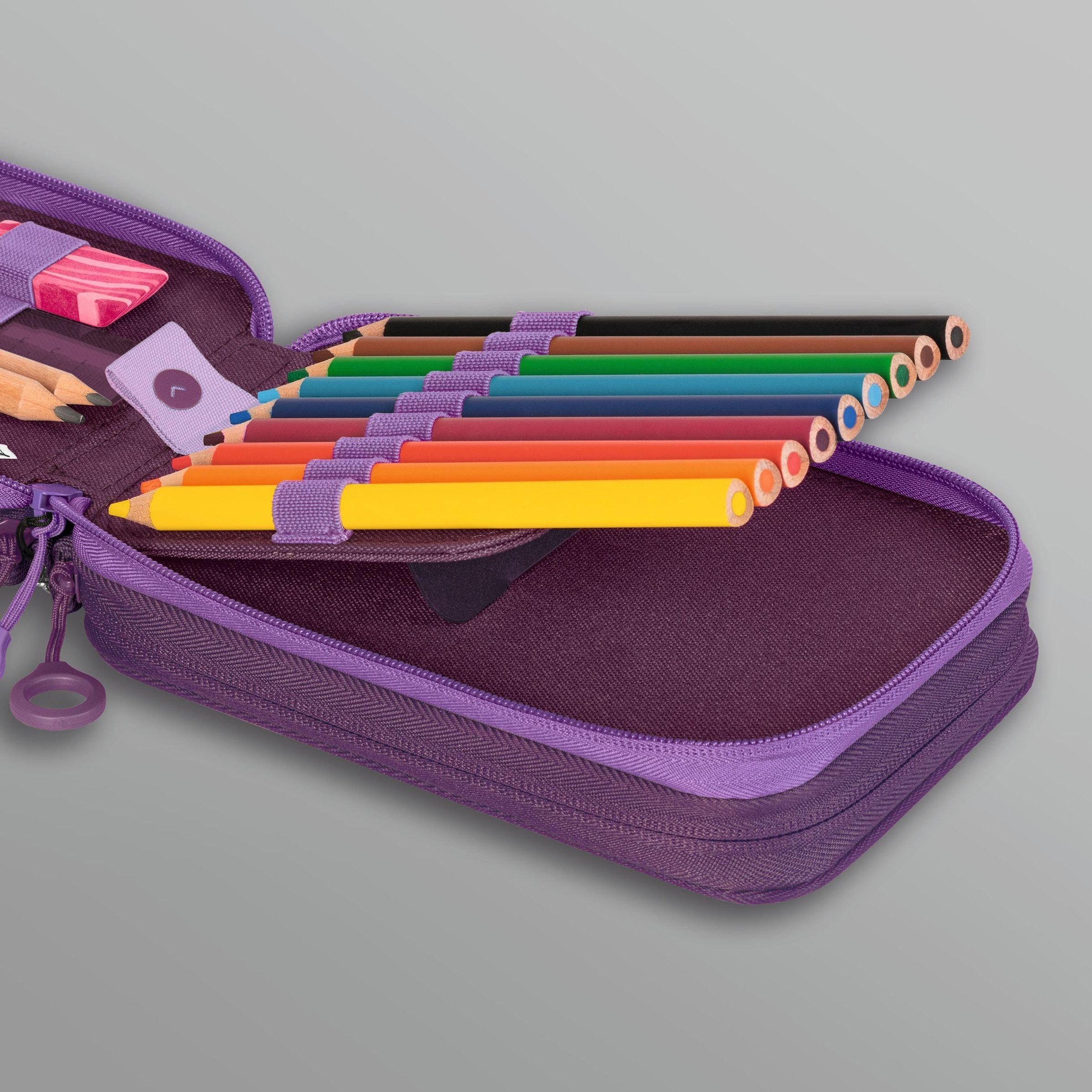 B/H/T: 200×125×75 mm ? Kunstfaser, Farbe: lila ? 3 Reißverschlüsse ? Inhalt: 18 dünne Markenbuntstifte, 9 dicke Markenbuntstifte, 2 Markenbleistifte, Lineal 16 cm, Metalldoppelspitzer, Radiergummi, Kinderschere, Geldfach mit Klettverschluss ? innovative Stifterampe für leichteres Entnehmen, horizontales Öffnen spart Platz auf dem Schreibtisch, mit ergonomischem Zipper für müheloses Öffnen und Schließen