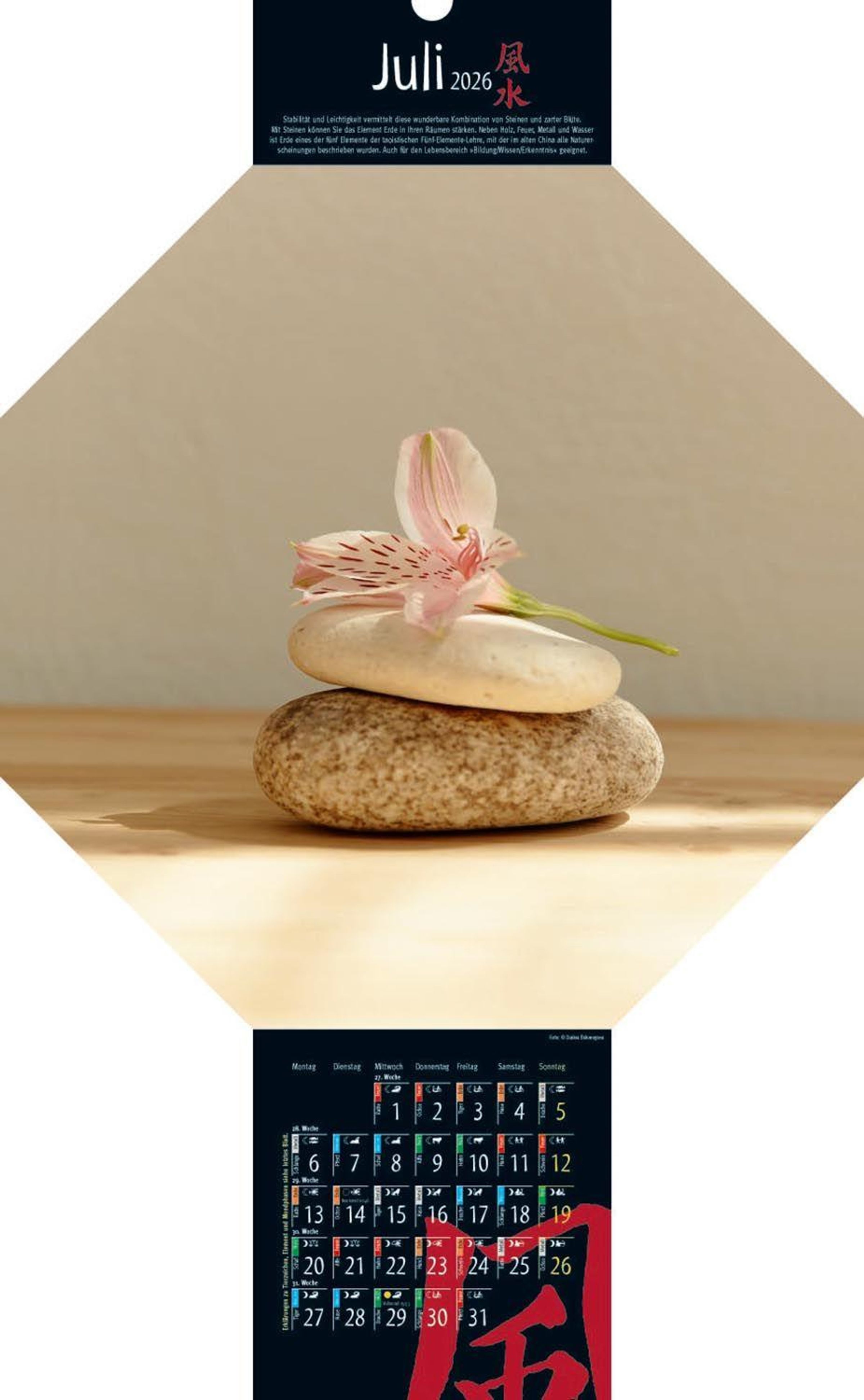 Von der Schönheit des Augenblicks erzählen die Bilder des Feng-Shui-Kalenders. Ob grandiose Landschaften, stimmungsvolle Lichteffekte oder zarte Blütenbilder - die Monatsmotive schenken uns ein Gefühl von Harmonie und Schönheit. Der außergewöhnliche Kalender entführt uns in ferne Welten und zu traumhaften Sehnsuchtsorten. Die achteckigen Bilder sind an das chinesische Bagua angelehnt - ein wichtiges Symbol im Feng Shui. Mit chinesischen Tierzeichen und Elementen für jeden Tag im Kalendarium, sie geben Aufschluss über die Qualität und Stimmung des Tages. Erläuterungen hierzu sowie zum Jahr des Feuerpferdes sind auf einem Extrablatt. Mit westlichen Mondphasen und wertvollen Feng-Shui-Tipps.