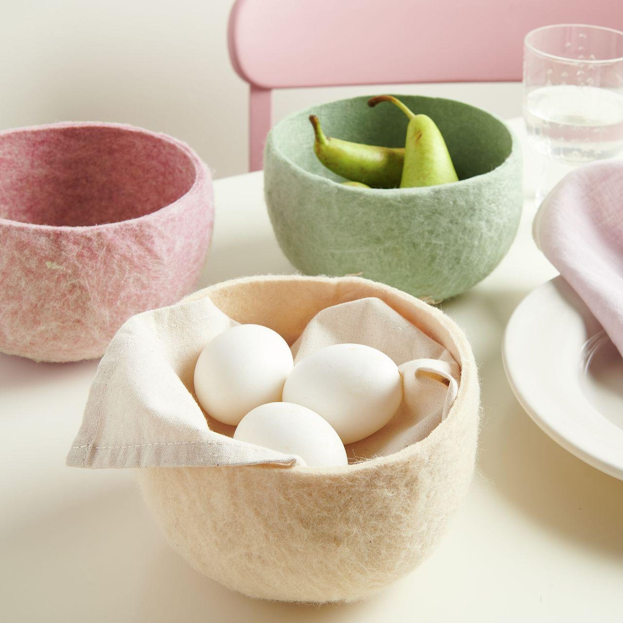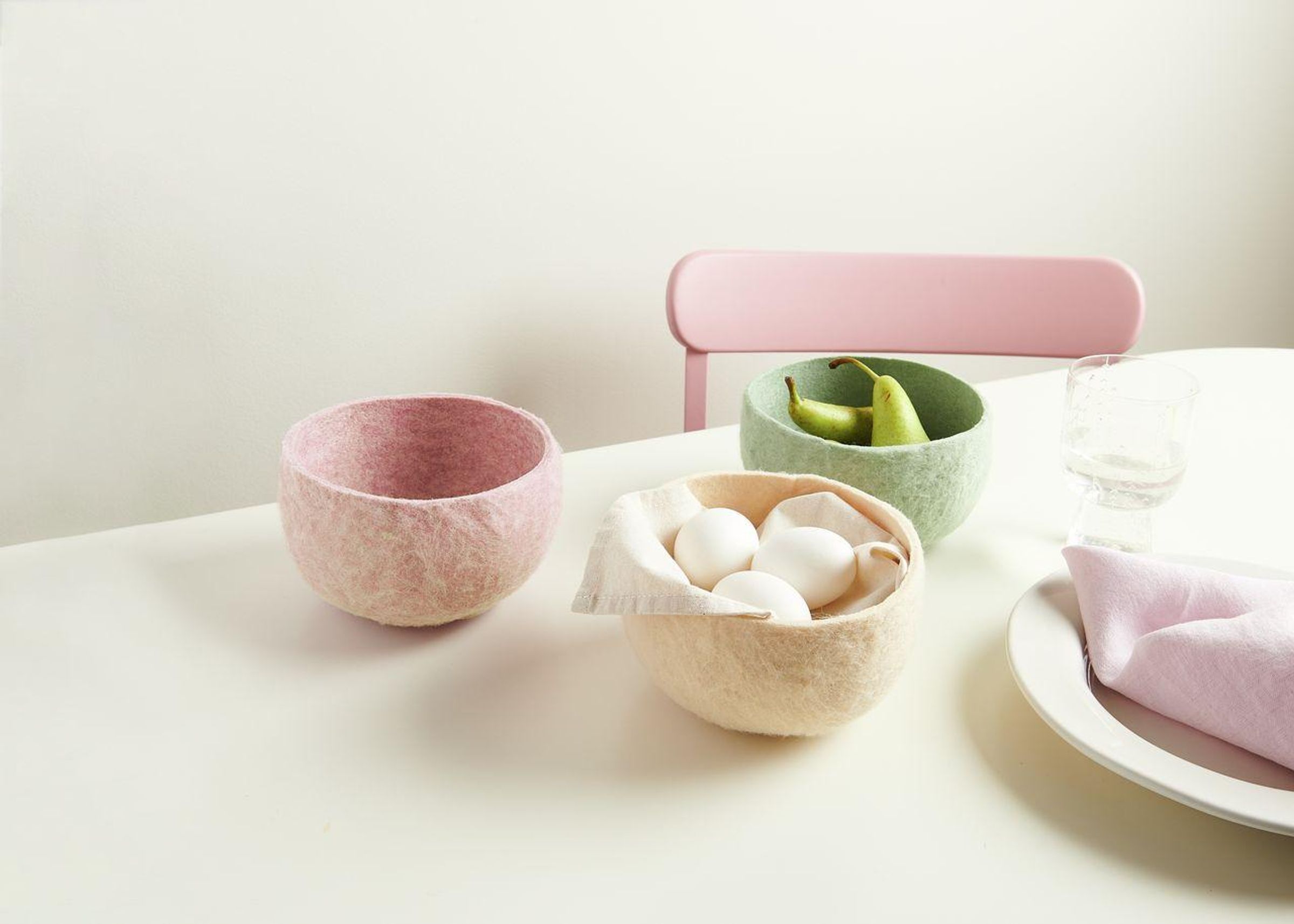 Drei Filzschalen: rosa leer, grün mit Birnen, beige mit Eiern; pinker Stuhl und Glas mit Wasser daneben., Diverse