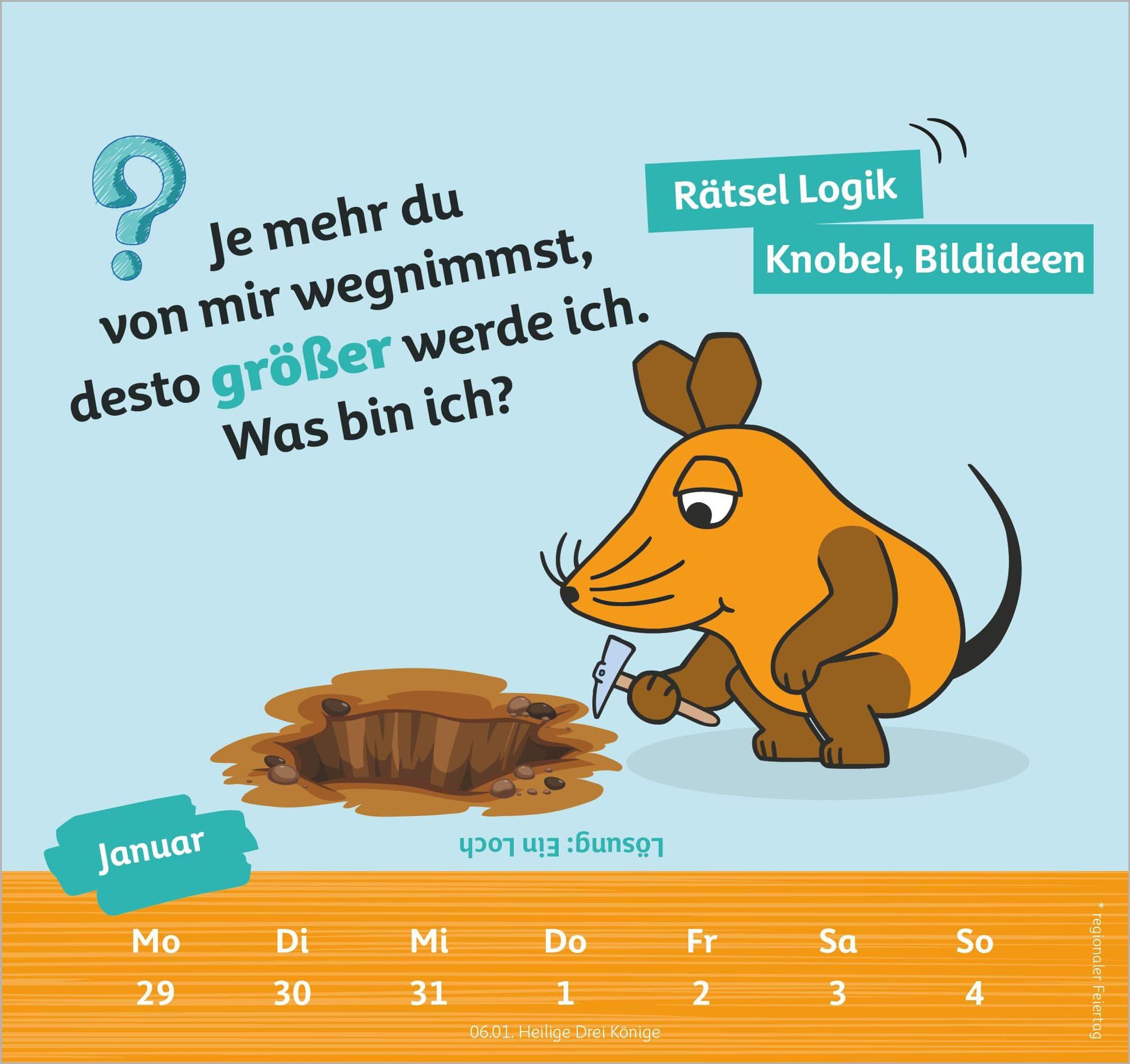"Find es raus mit der Maus! Woche für Woche pfiffiger Wissensspaß für kleine Entdecker. 2027 DUMONT." Illustration einer Maus und eines blauen Elefanten., Kalender