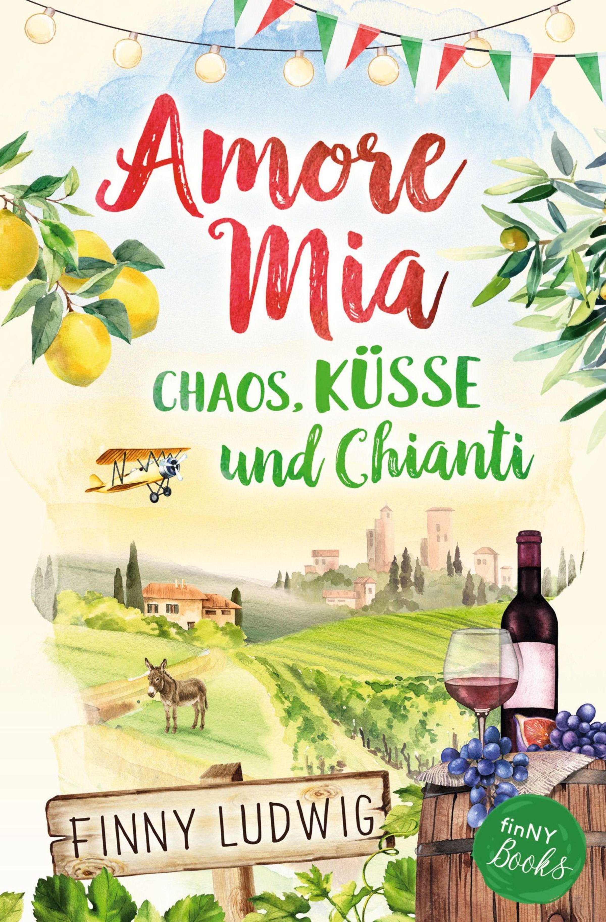 „Amore Mia: Chaos, Küsse und Chianti“ von Finny Ludwig. Illustration mit Weinflasche, Landschaft und Zitrusfrüchten., Buch