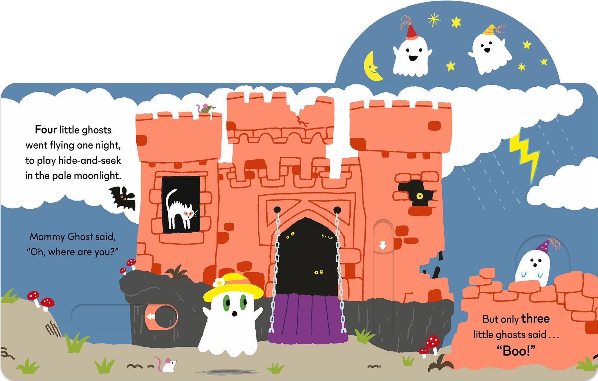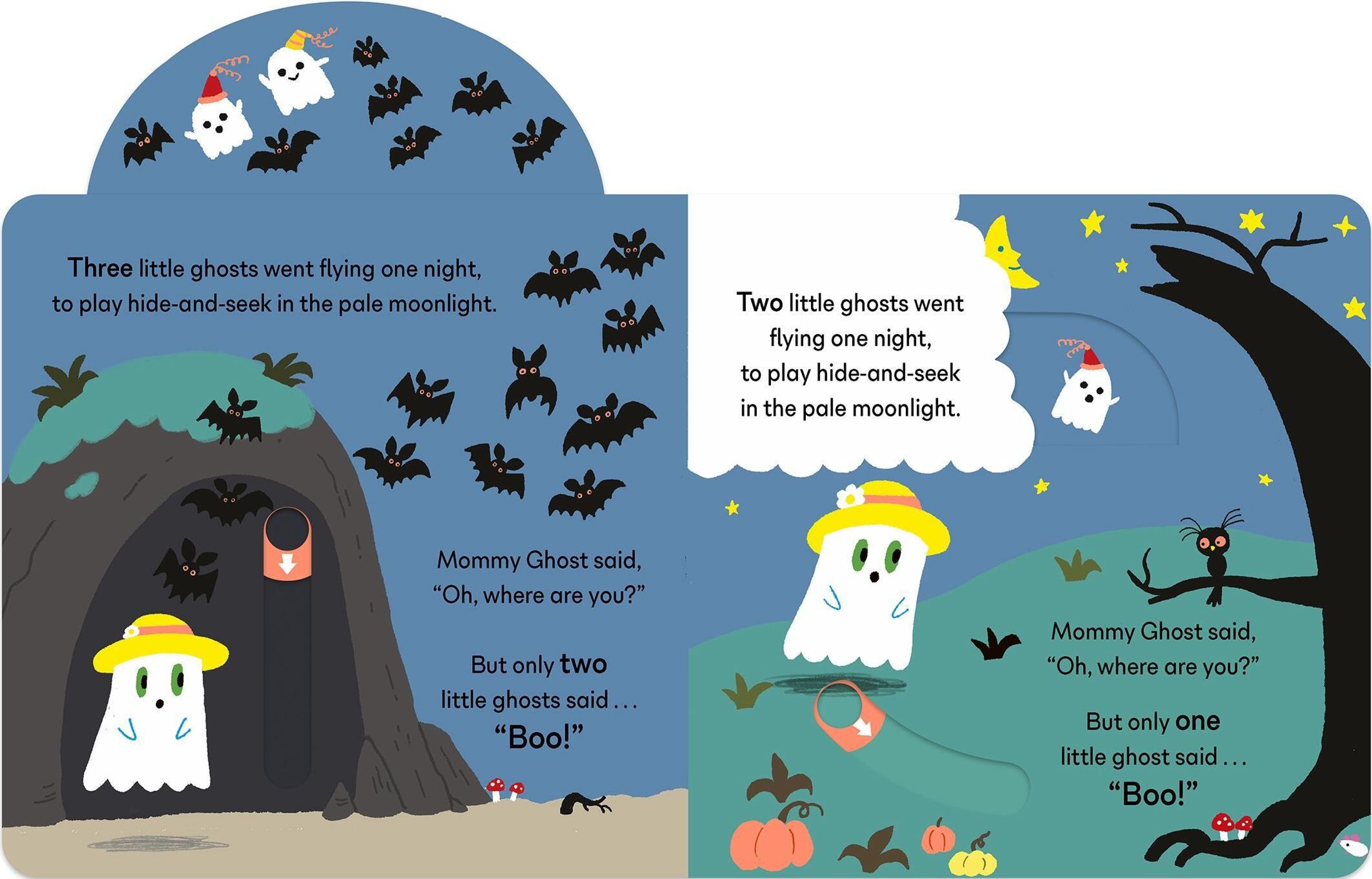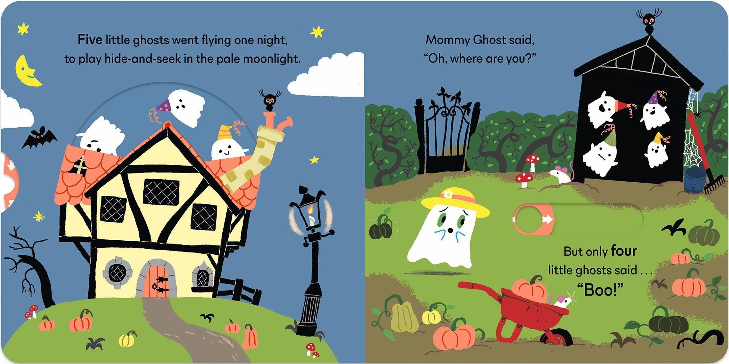 Based on the popular nursery rhyme Five Little Ducks, this adorably spooky board book is the perfect treat for babies and toddlers this Halloween. With an interactive slider on every page and bright colors throughout, children will love to count along as they repeat the rhyme while on the hunt for Mommy Ghost's playful little Ghosts, who all shout, "BOO!".