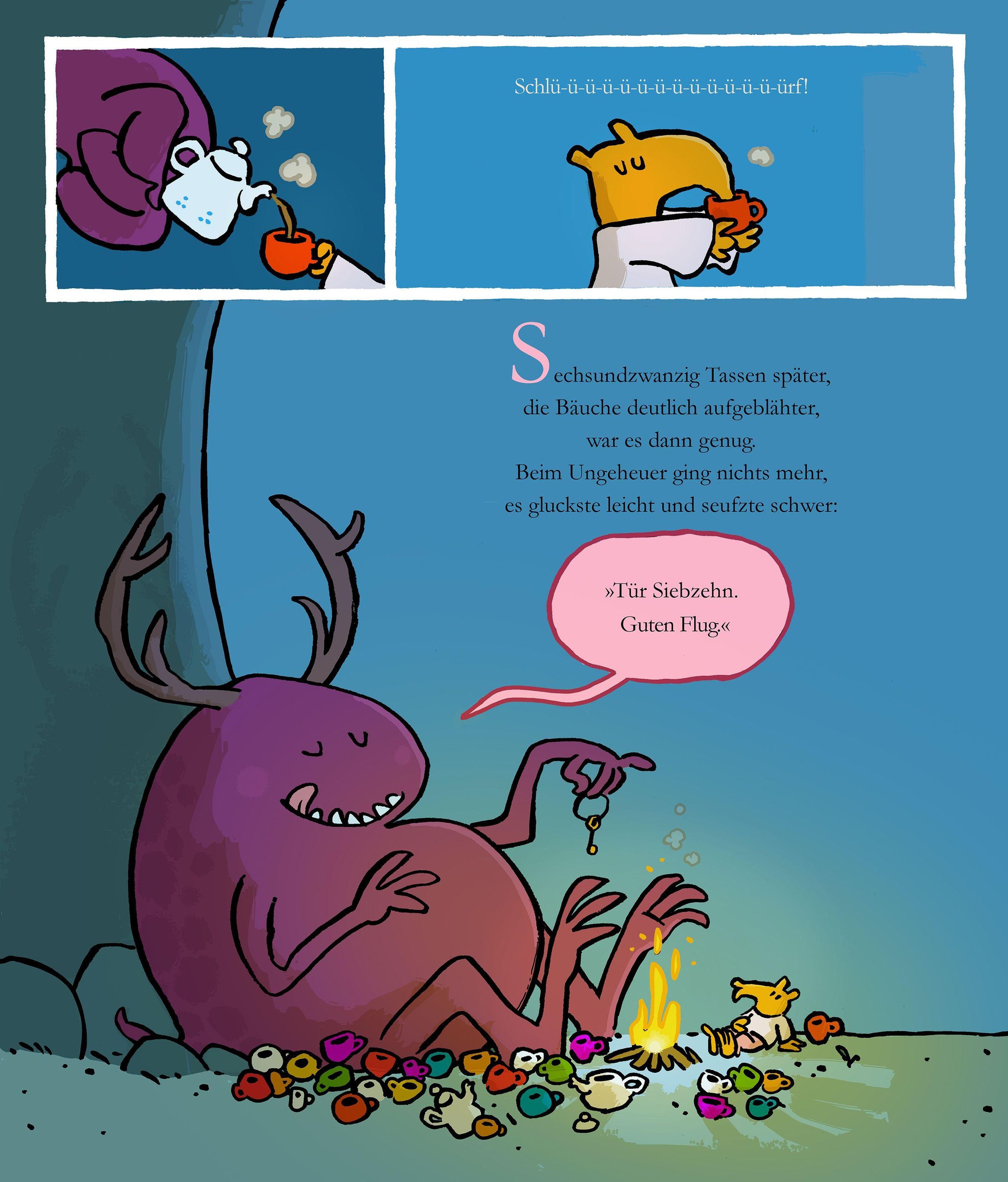 "Schluß für heute! Schlafenszeit!" ZYX ist dafür nicht bereit. Es will lieber Abenteuer! Riesen, Otter, Ungeheuer, Pizzaberge, Krokodile, Piraten, Türen (davon viele). Es fliegt zum Dschungel, fährt zur See und rückwärts durch das ABC.