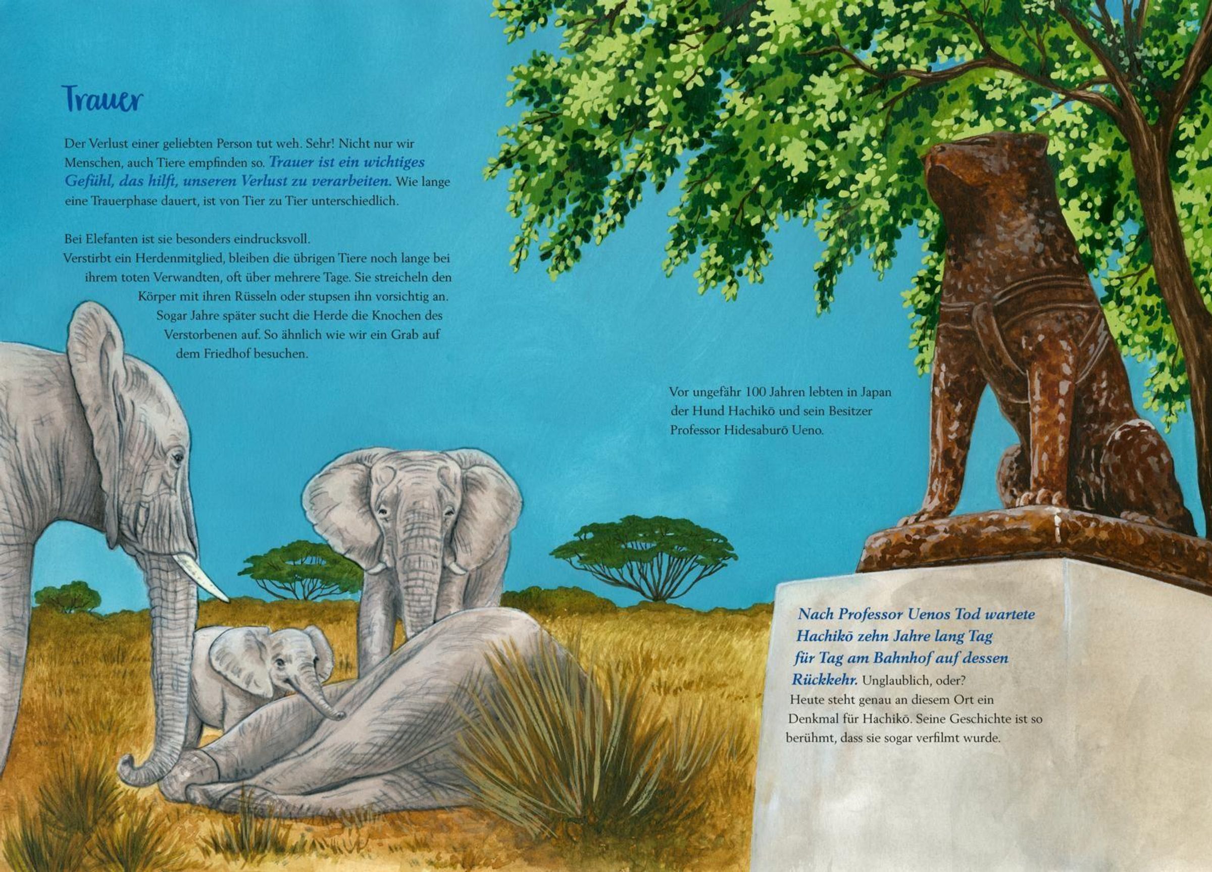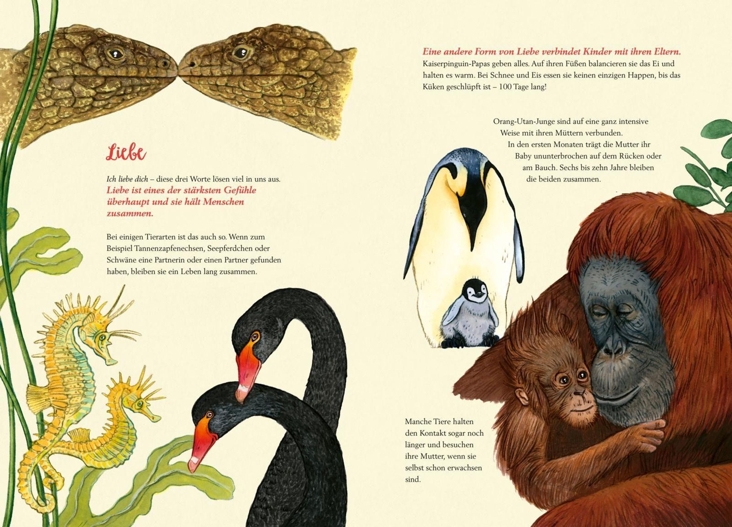 Menschen können sich mit Sprache ausdrücken und sich gegenseitig von ihren Gefühlen erzählen. Tiere können nicht mit Wörtern sagen, was sie empfinden. Aber Forscher*innen haben herausgefunden, dass sie sehr wahrscheinlich ebenso fühlen wie wir. In diesem wunderschön gestalteten, riesengroßen Bilderbuch erfährst du zum Beispiel, wie und wie lange Elefanten trauern. Du lernst, dass Tannenzapfenechsen, Schwäne oder Seepferdchen nach der Partnerwahl ein Leben lang zusammenbleiben. Es wird erklärt, warum Schimpansen lächeln, wie wichtig Erdmännchen Vertrauen ist und woran Krokodile Freude haben.