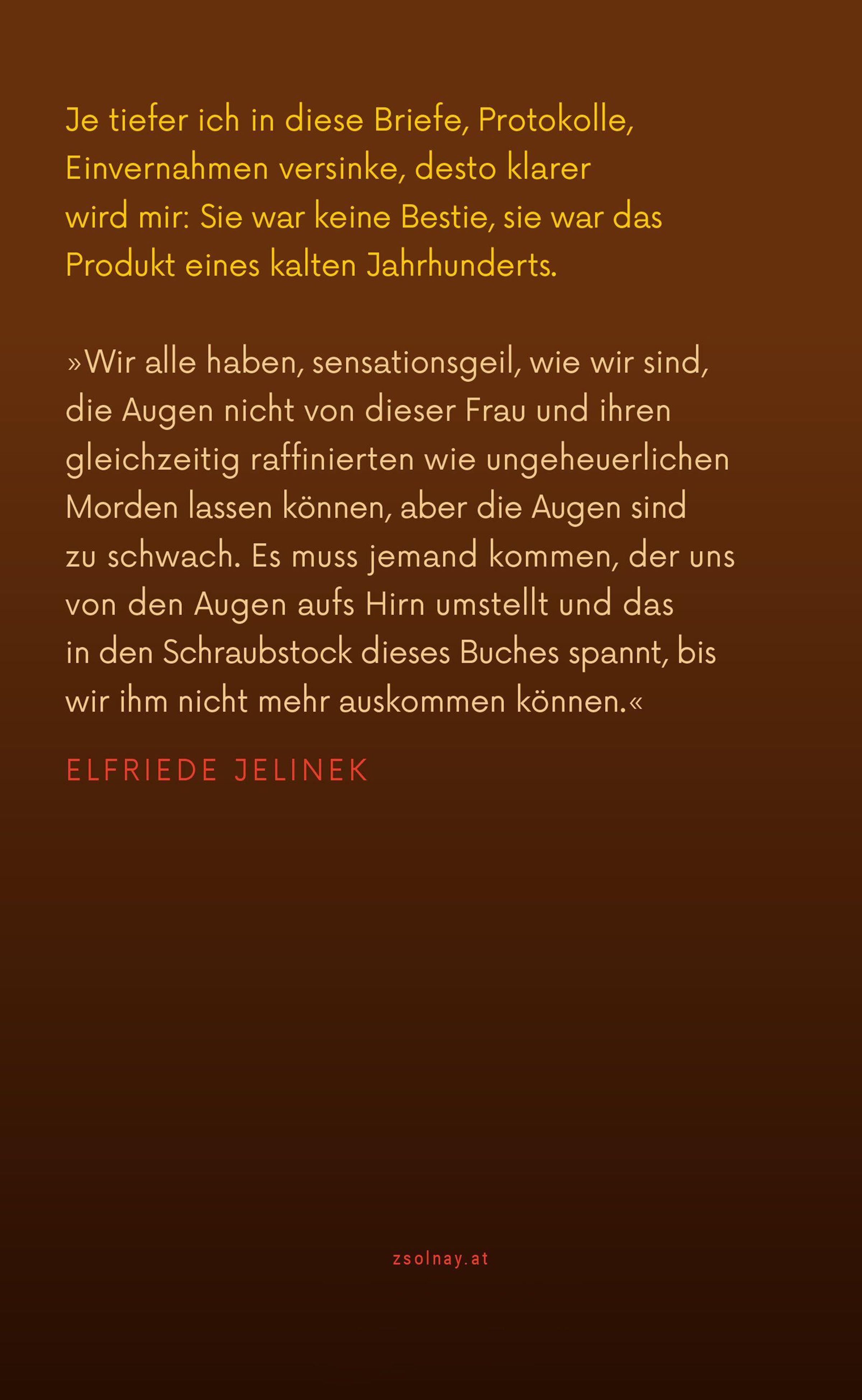 'Wir alle haben, sensationsgeil, wie wir sind, die Augen nicht von dieser Frau und ihren gleichzeitig raffinierten wie ungeheuerlichen Morden lassen können, aber die Augen sind zu schwach. Es muss jemand kommen, der uns von den Augen aufs Hirn umstellt und das in den Schraubstock dieses Buches spannt, bis wir ihm nicht mehr auskommen können.' Elfriede Jelinek