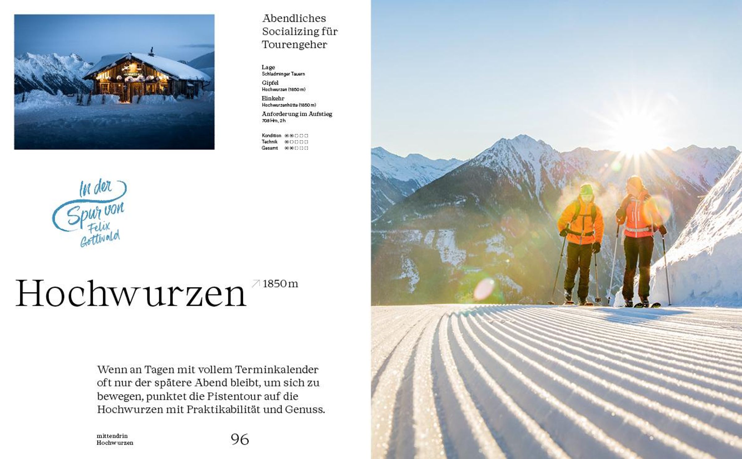 Glitzernder Pulverschnee, sonnenbeschienene Hänge und gemütliche Hütten fernab vom Trubel der Pisten: Ein Tag am Berg ist ein Kurzurlaub vom Alltag. Der Weg auf den Gipfel mag anstrengend sein, dafür fühlt man sich danach geduldiger, dankbarer und gelassener. Wenn die Skitouren in diesem Buch in geselliger Runde und mit genussvoller Stärkung ausklingen, sind unsere Energietanks wieder aufgefüllt.
