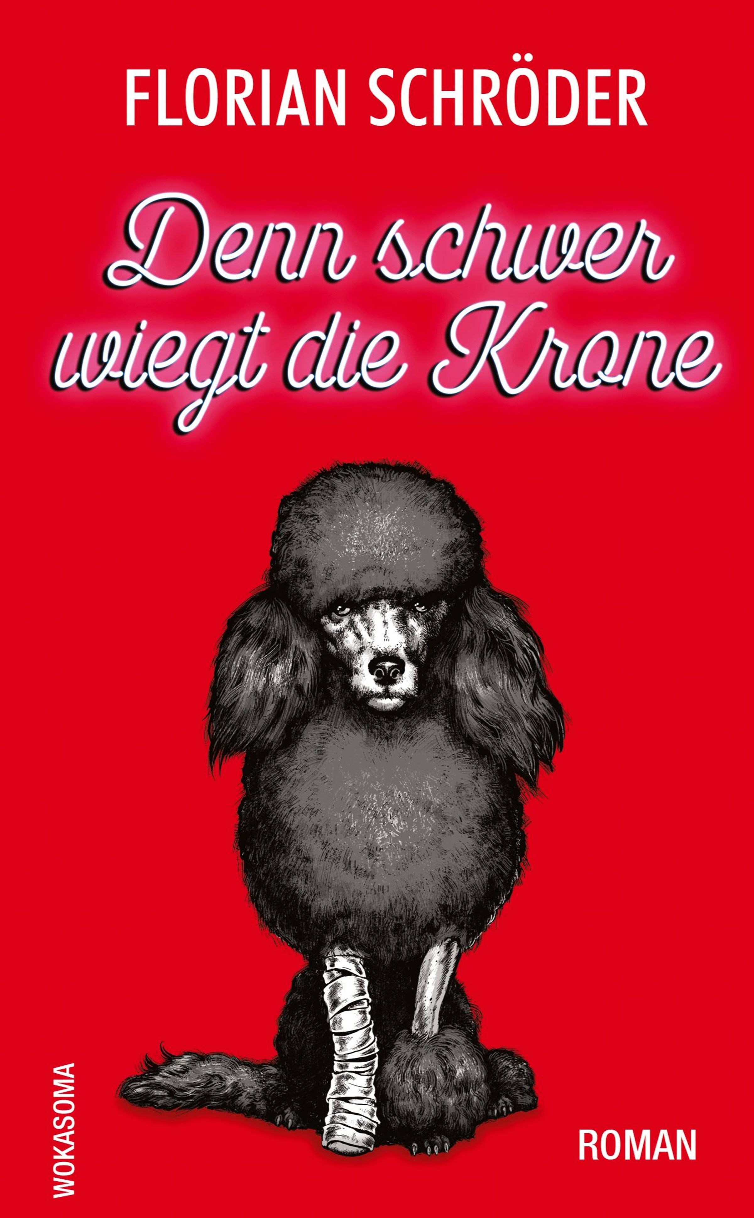 Text: "Florian Schröder, Denn schwer wiegt die Krone, WOKASOMA, Roman." Illustration eines Pudels mit bandagiertem Bein auf rotem Hintergrund., Buch