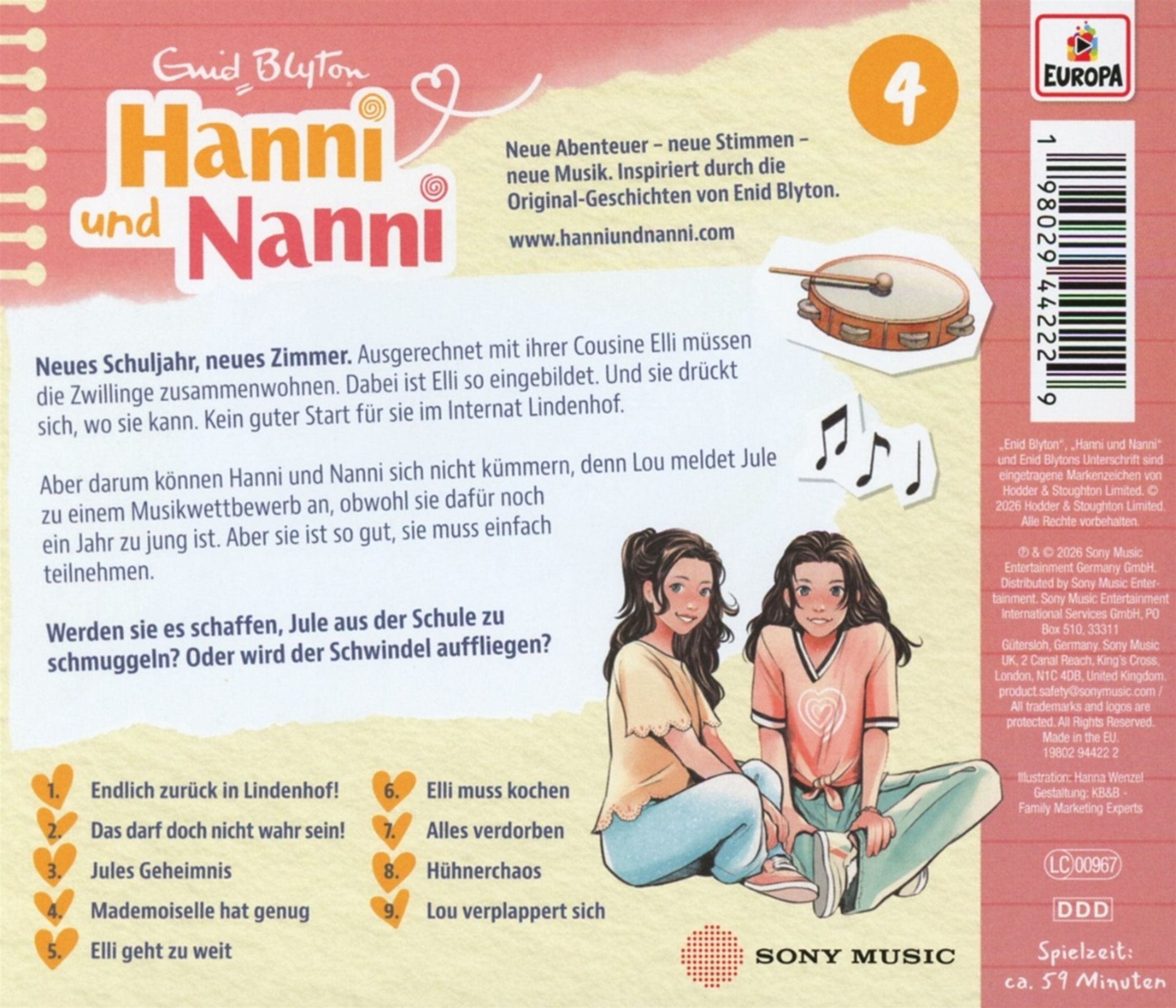 Neues Schuljahr, neues Zimmer. Ausgerechnet mit ihrer Cousine Elli müssen die Zwillinge zusammenwohnen. Dabei ist Elli so eingebildet. Und sie drückt sich, wo sie kann. Kein guter Start für sie in Internat Lindenhof. Aber darum können Hanni und Nanni sich nicht kümmern, denn Lou meldet Jule zu einem Musikwettbewerb an, obwohl sie dafür noch ein Jahr zu jung ist. Aber sie ist so gut, sie muss einfach teilnehmen. Werden sie es schaffen, Jule aus der Schule zu schmuggeln? Oder wird der Schwindel auffliegen?