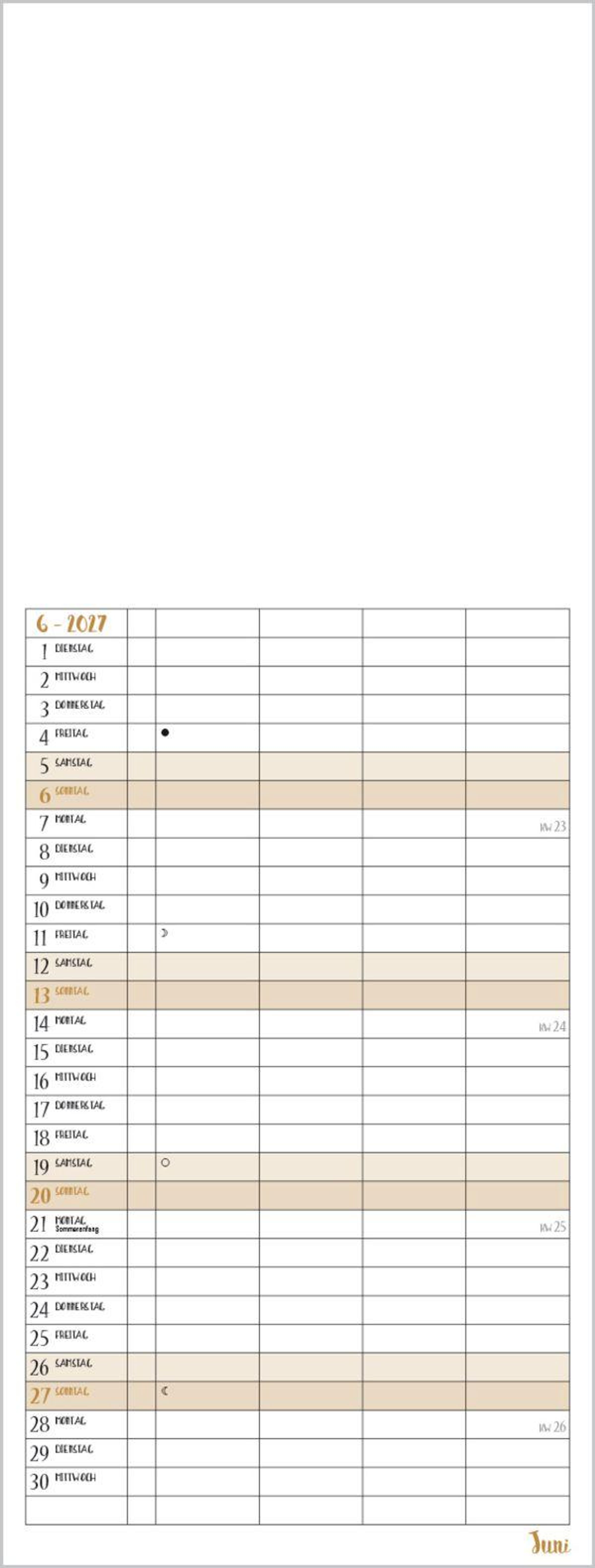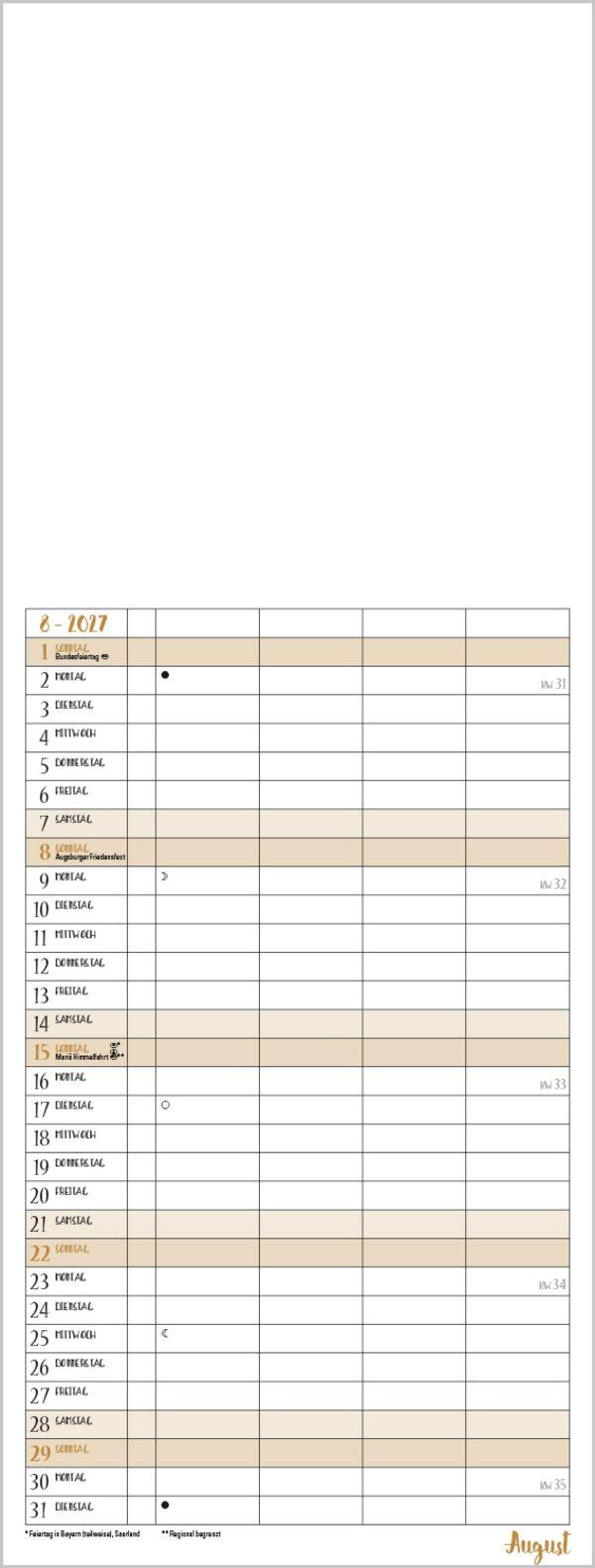 Familientimer mit hochwertigem weißem Karton und mit edlen goldfarbenen Markierungen der Wochenenden und Feiertage