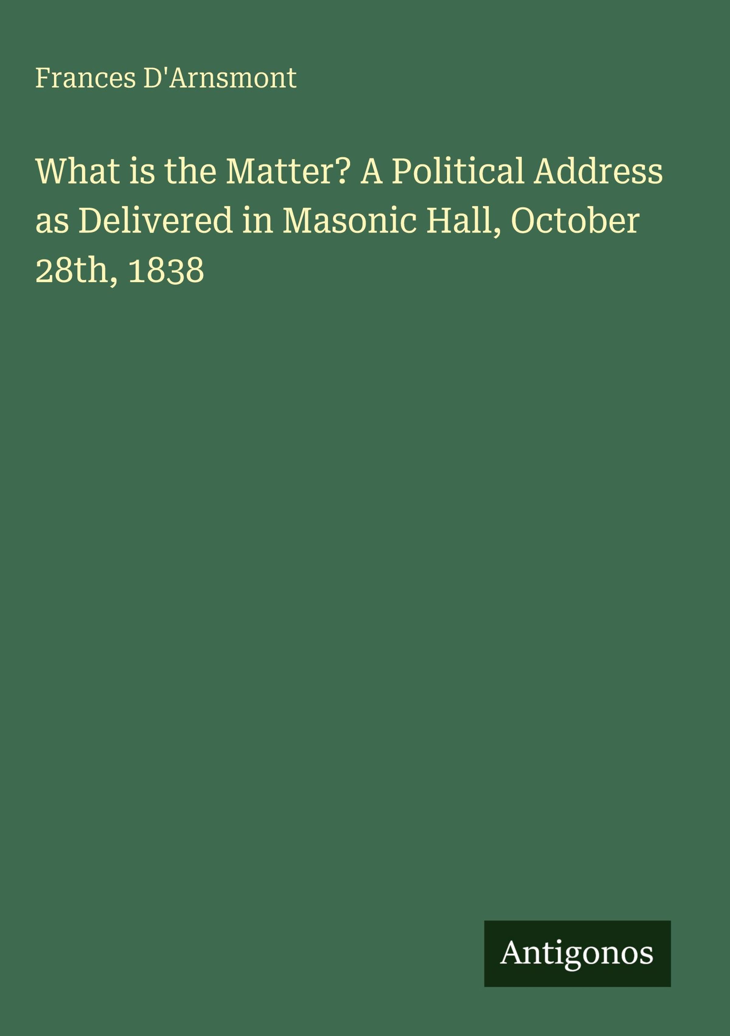 Frances D'Arnsmont: What is the Matter? A Political Address as Delivered in Masonic Hall, October 28th, 1838, Gebunden