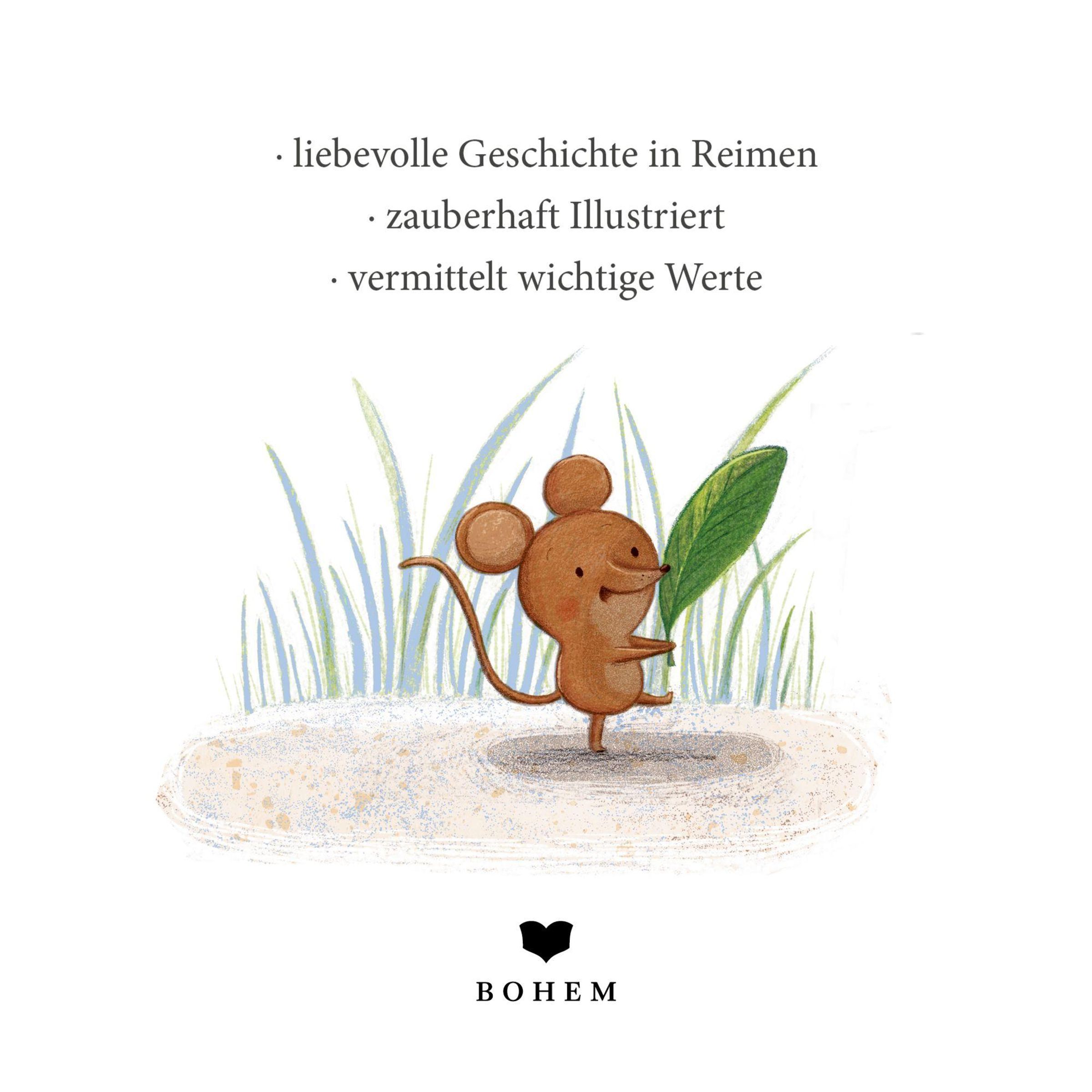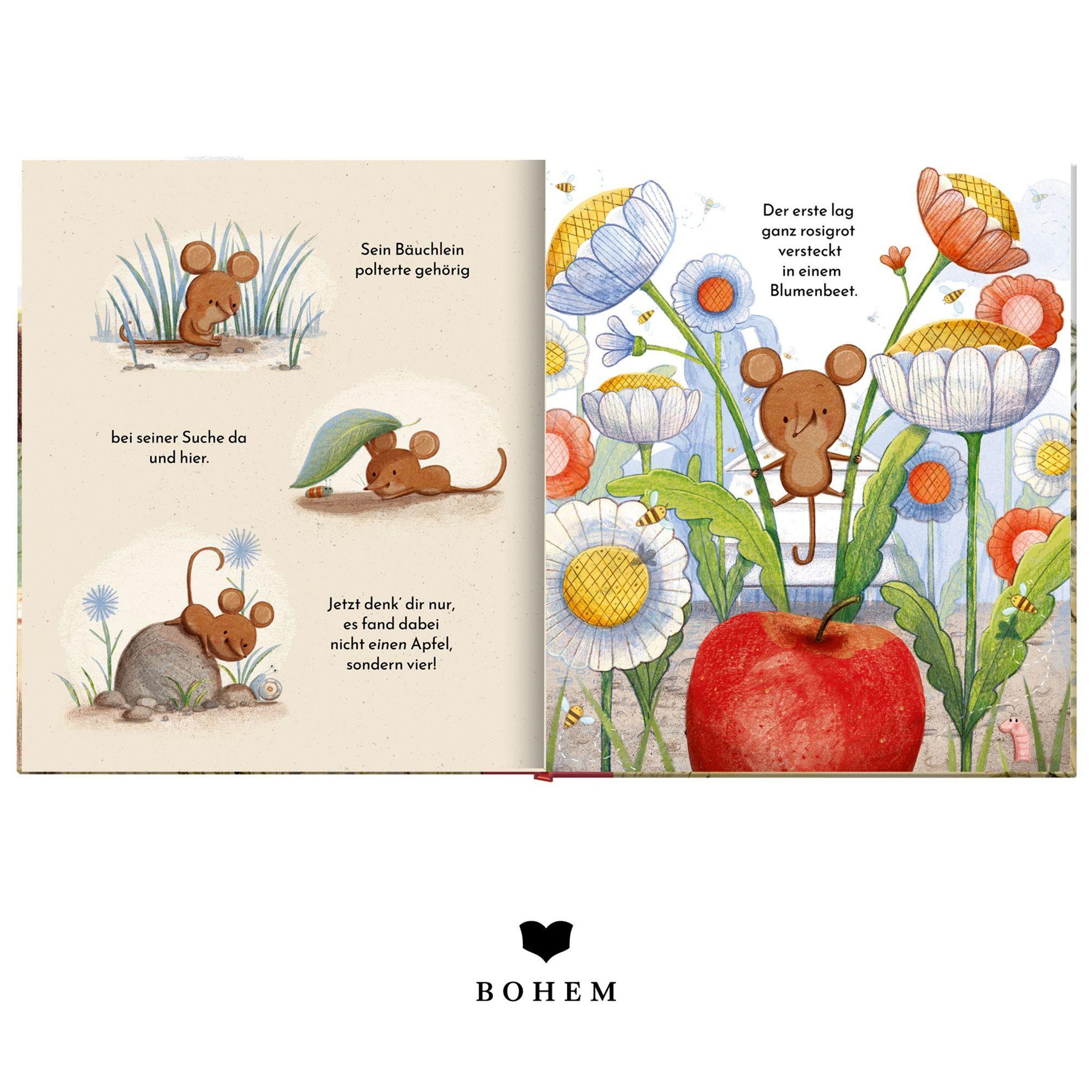 „Mäuschens Äpfel“ steht groß in der Mitte. Eine fröhliche Maus steht auf einem gelben Apfel, umgeben von drei anderen Äpfeln., Buch