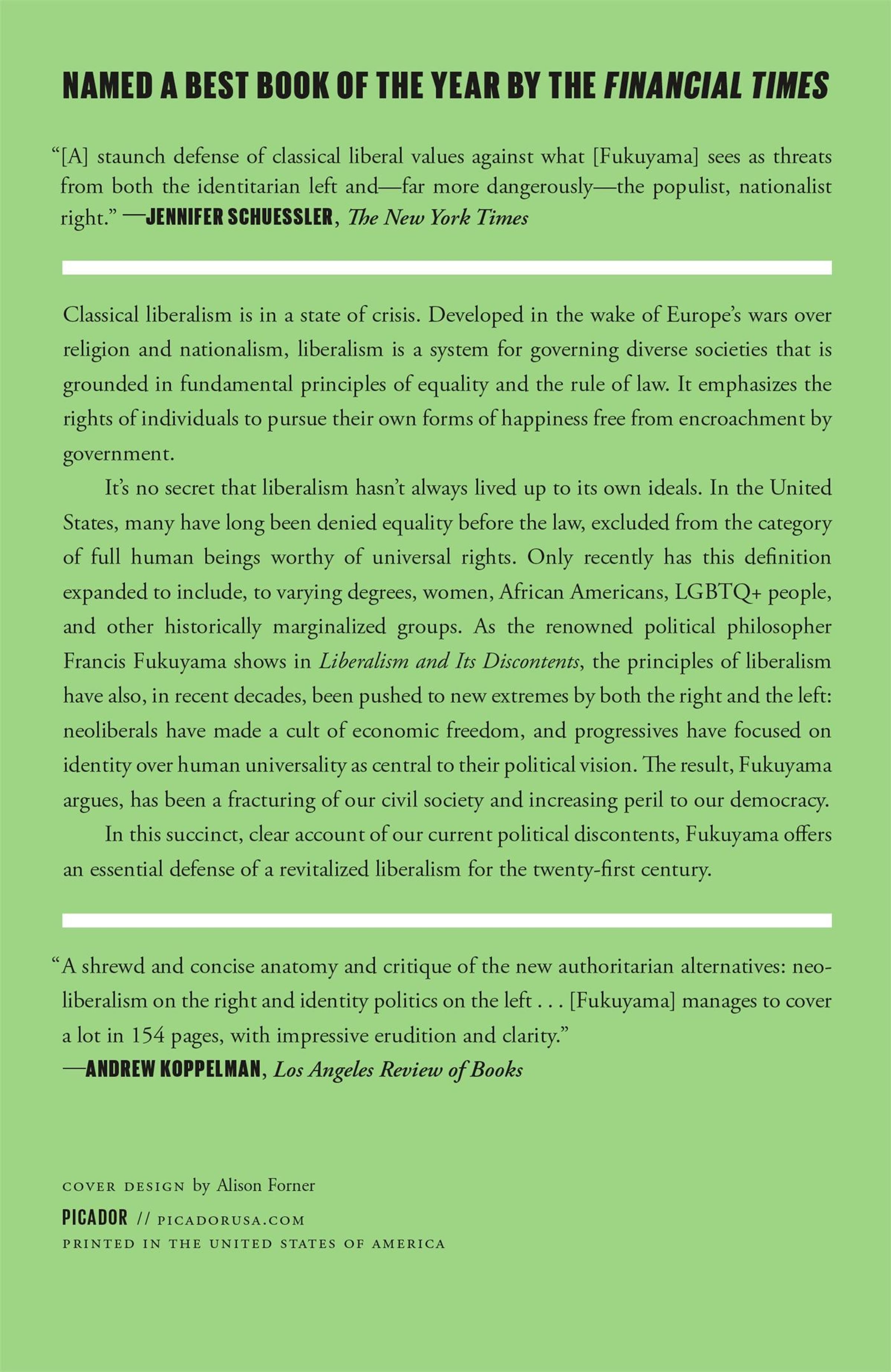 It's no secret that liberalism hasn't always lived up to its own ideals. In the United States, many have long been denied equality before the law, excluded from the category of full human beings worthy of universal rights. Only recently has this definition expanded to include, to varying degrees, women, African Americans, LGBTQ+ people, and other historically marginalized groups. As the renowned political philosopher Francis Fukuyama shows in Liberalism and Its Discontents , the principles of liberalism have also, in recent decades, been pushed to new extremes by both the right and the left: neoliberals have made a cult of economic freedom, and progressives have focused on identity over human universality as central to their political vision. The result, Fukuyama argues, has been a fracturing of our civil society and increasing peril to our democracy.