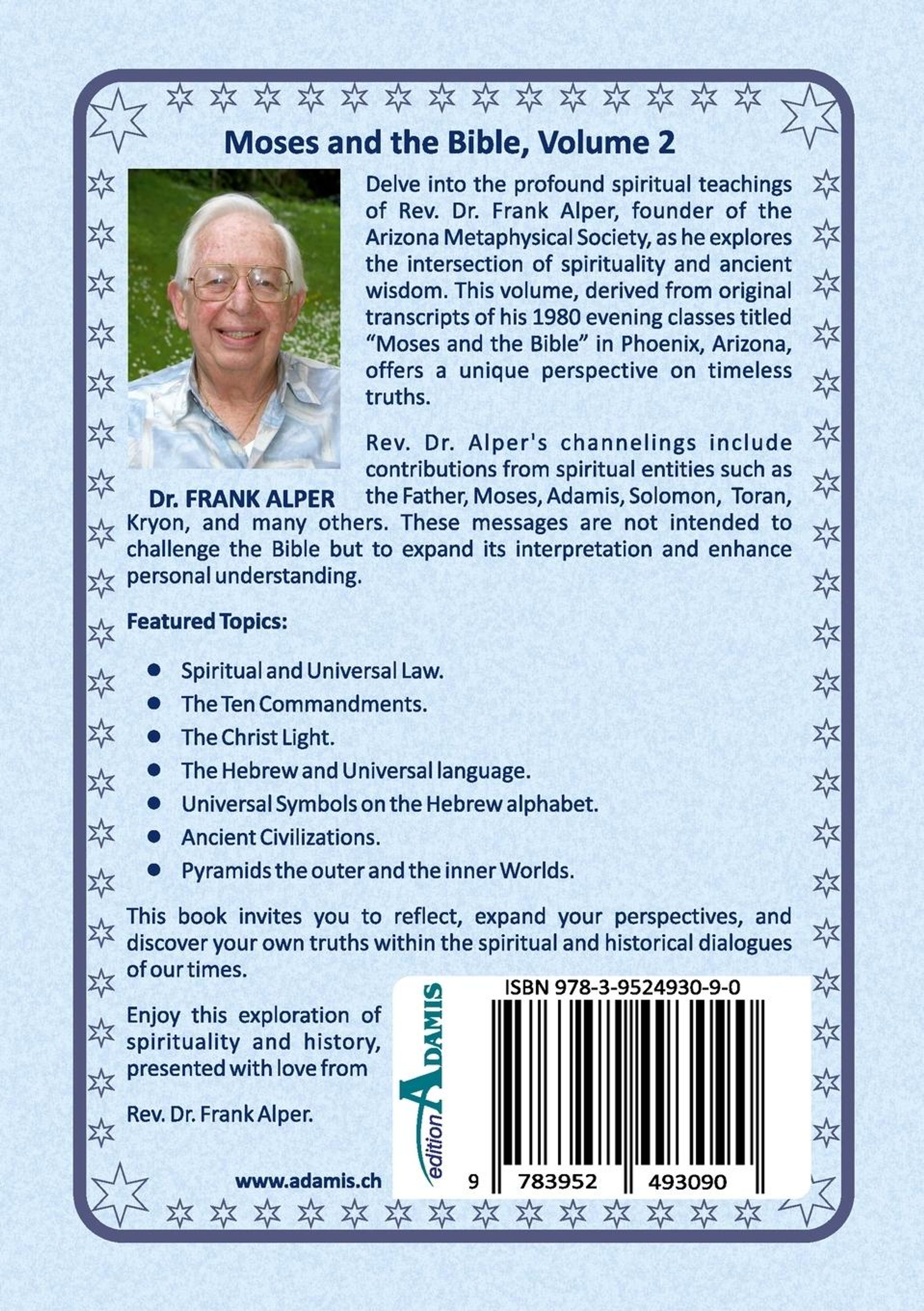 Delve into the profound spiritual teachings of Rev. Dr. Frank Alper, founder of the Arizona Metaphysical Society, as he explores the intersection of spirituality and ancient wisdom. This volume, derived from original transcripts of his 1980 evening classes titled "Moses and the Bible" in Phoenix, Arizona, offers a unique perspective on timeless truths. Rev. Dr. Alper's channelings include contributions from spiritual entities such as the Father, Moses, Adamis, Solomon, Toran, Kryon, and many others. These messages are not intended to challenge the Bible but to expand its interpretation and enhance personal understanding.