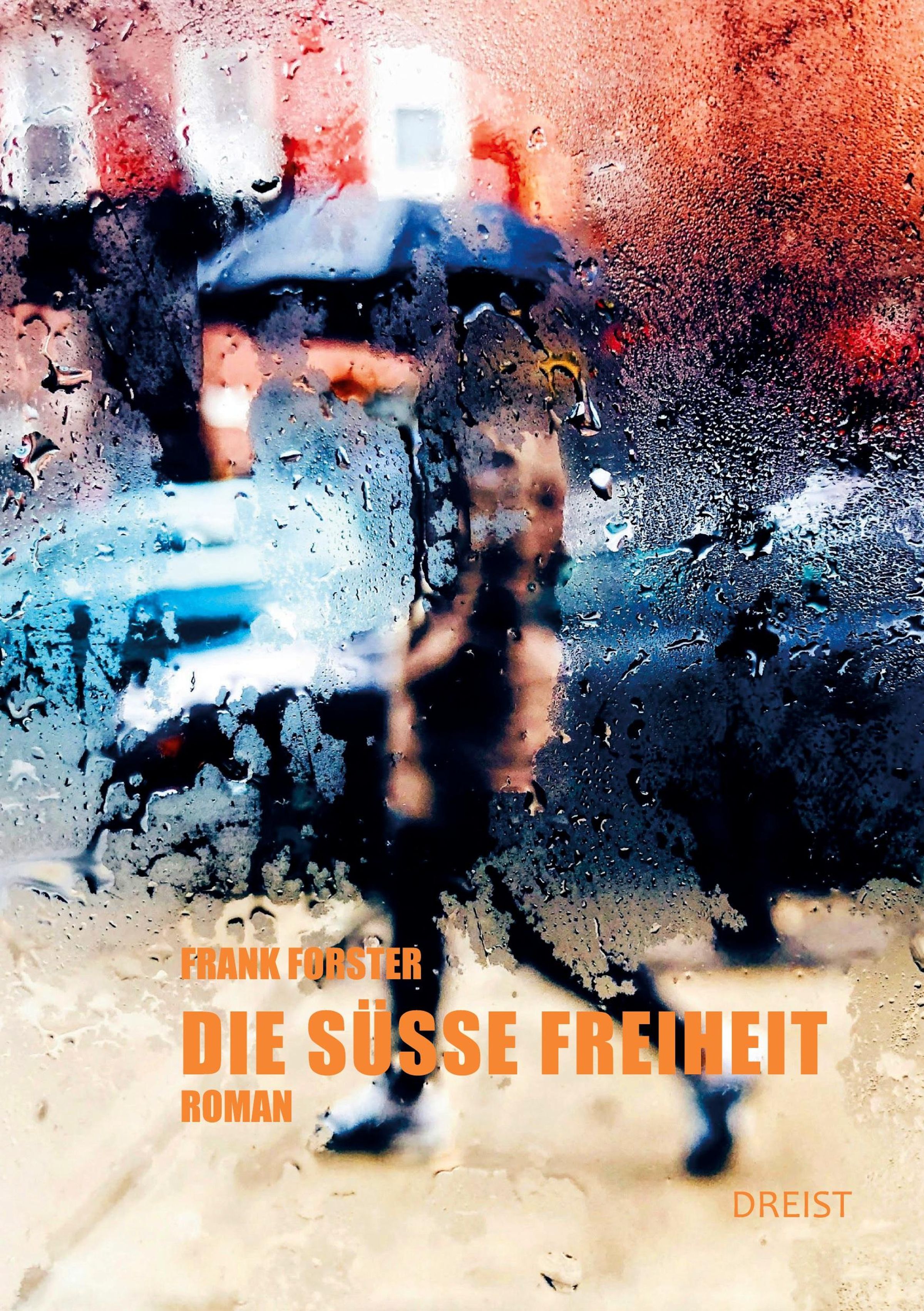 Text: „FRANK FORSTER DIE SÜSSE FREIHEIT ROMAN DREIST“. Unscharfe Person im Regen hinter beschlagenem Fenster., Buch
