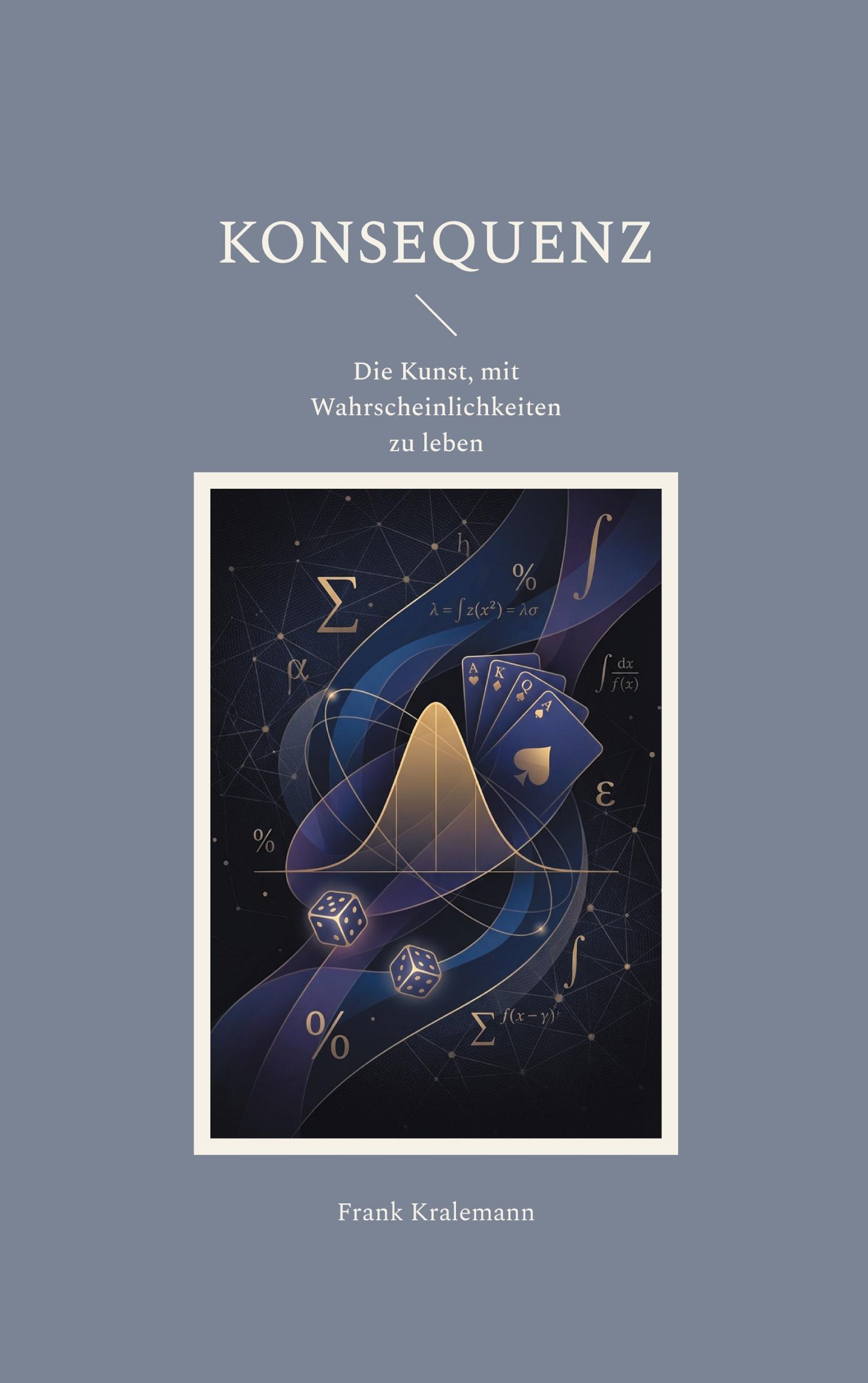 "Konsequenz: Die Kunst, mit Wahrscheinlichkeiten zu leben. Frank Kralemann." Illustration mit mathematischen Symbolen und Würfeln., Buch
