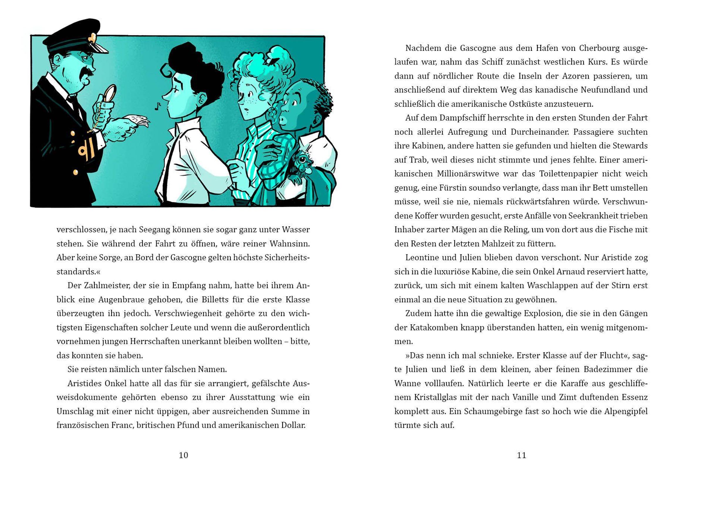 Aristide, Leontine und Julien fliehen nach ihrem Pariser Abenteuer unter falschem Namen an Bord des Luxusdampfers La Gascogne, der im Wettlauf um die schnellste Atlantiküberquerung nach New York fährt. Als ein unfassbar wertvolles Diamant-Collier vermisst wird, fällt der Verdacht auf einen gewissen Meisterdieb - die geheimnisvolle 'Katze'-, hinter der sich niemand anderes als Aristide verbirgt. Mit Mut und Witz versuchen die Freunde, ihre Unschuld zu beweisen, und stoßen auf ein noch größeres Geheimnis: ein Päckchen, das im Auftrag eines amerikanischen Gangsterbosses an Bord geschmuggelt wurde. Im dichten Nordatlantiknebel kämpfen sie um Wahrheit, Freundschaft - und ihre Freiheit.