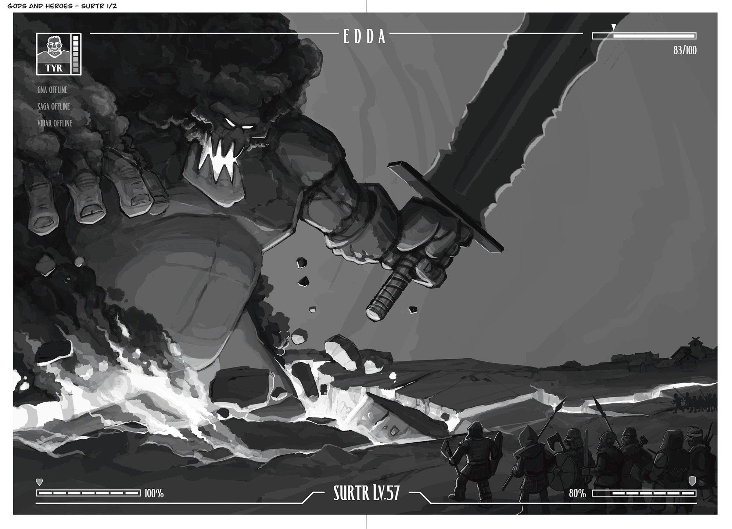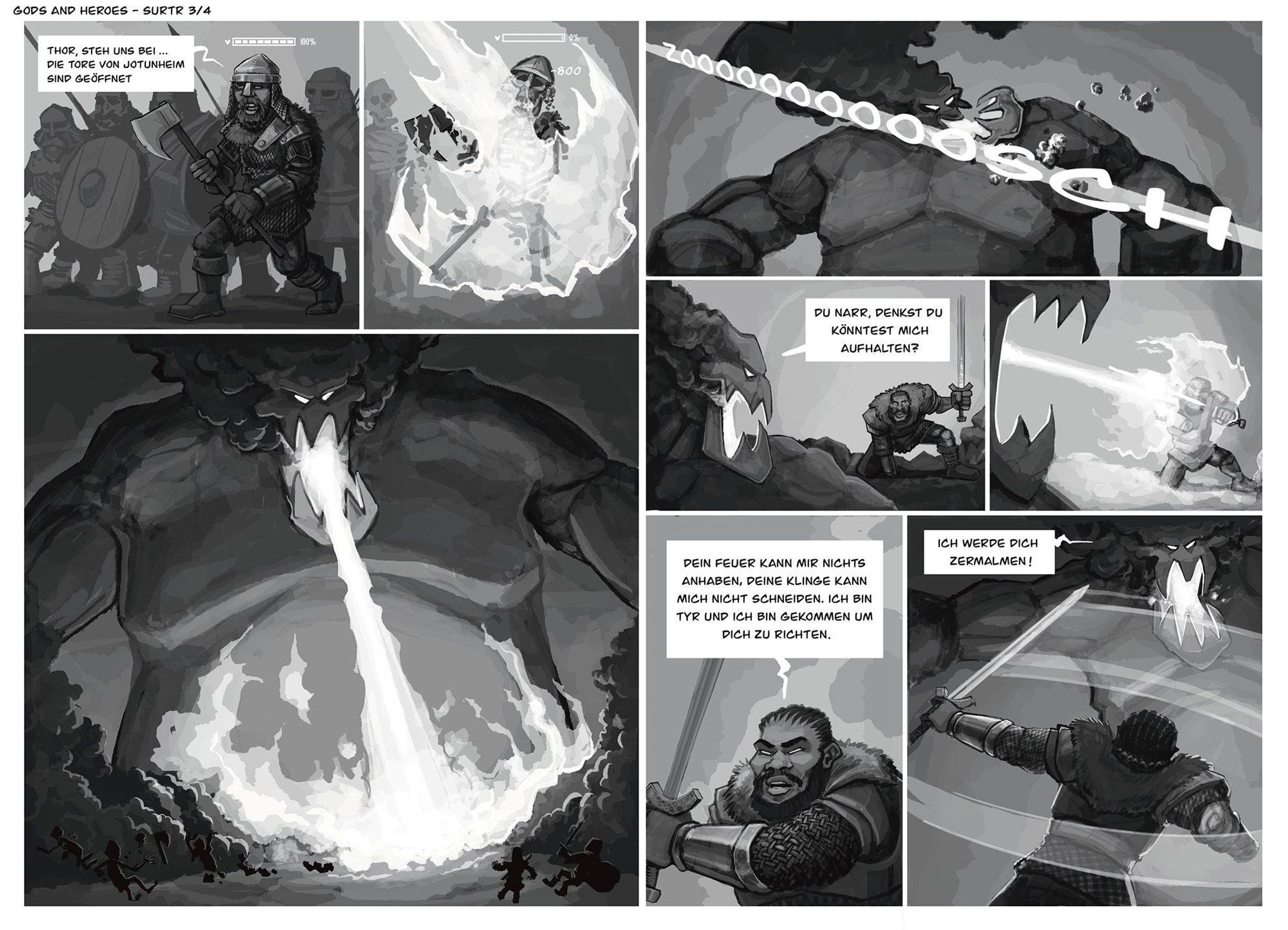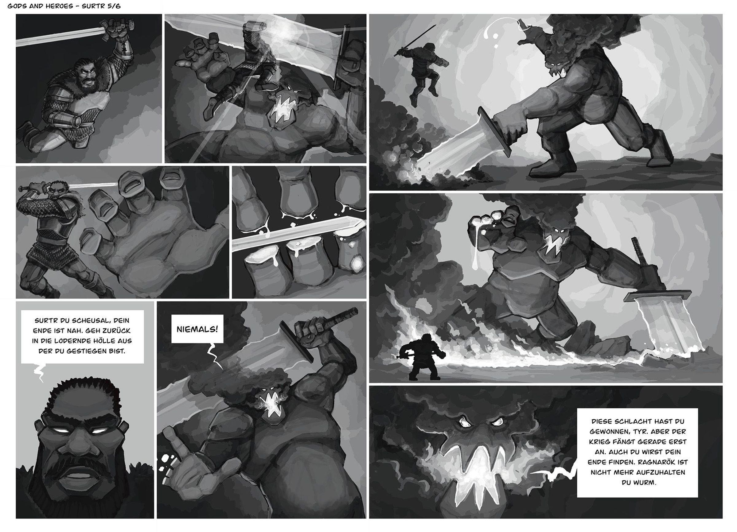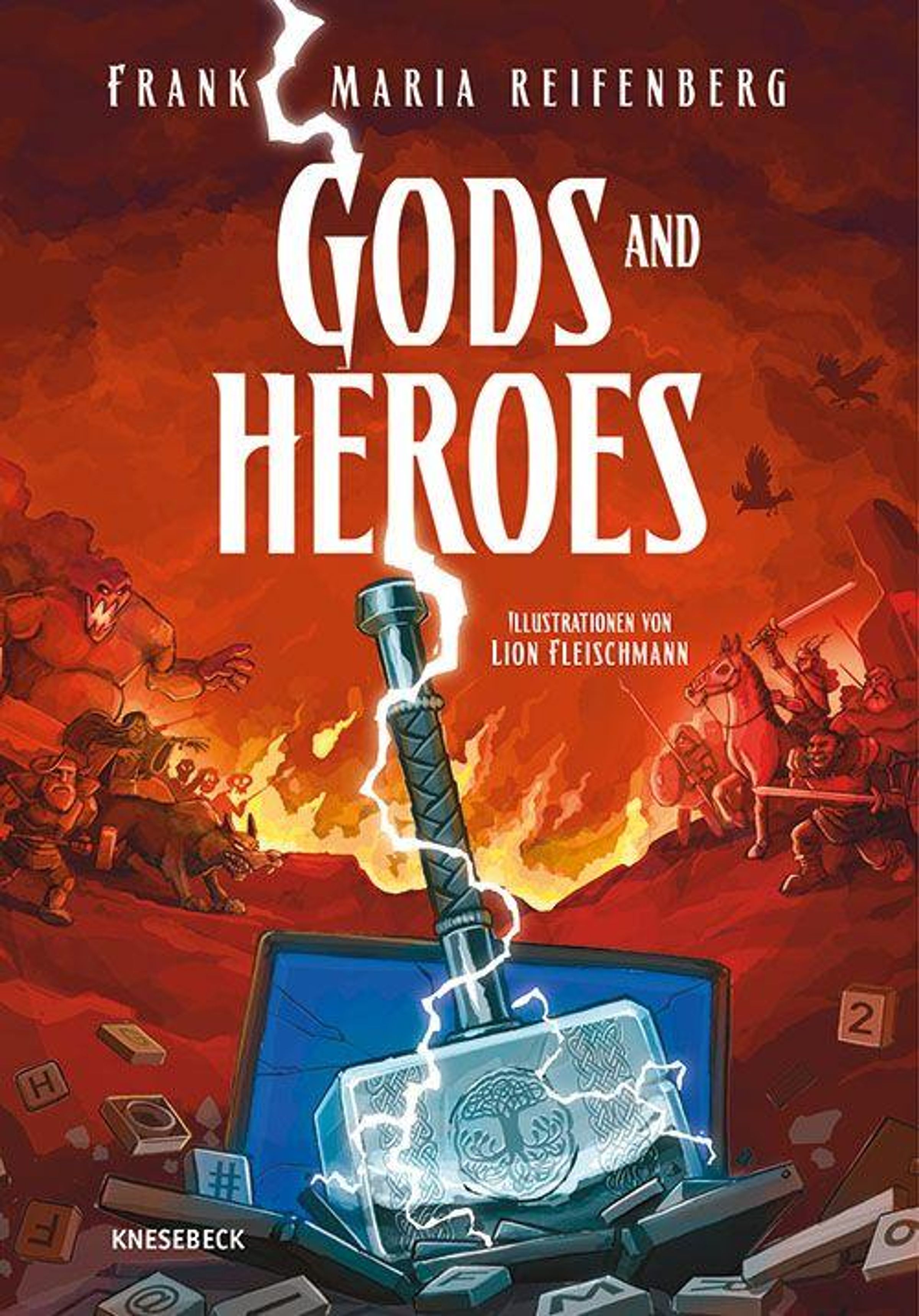 Text: "Gods and Heroes", "Frank Maria Reifenberg", "Illustrationen von Lion Fleischmann". Ein Hammer mit Runen, umgeben von Kriegern., Buch