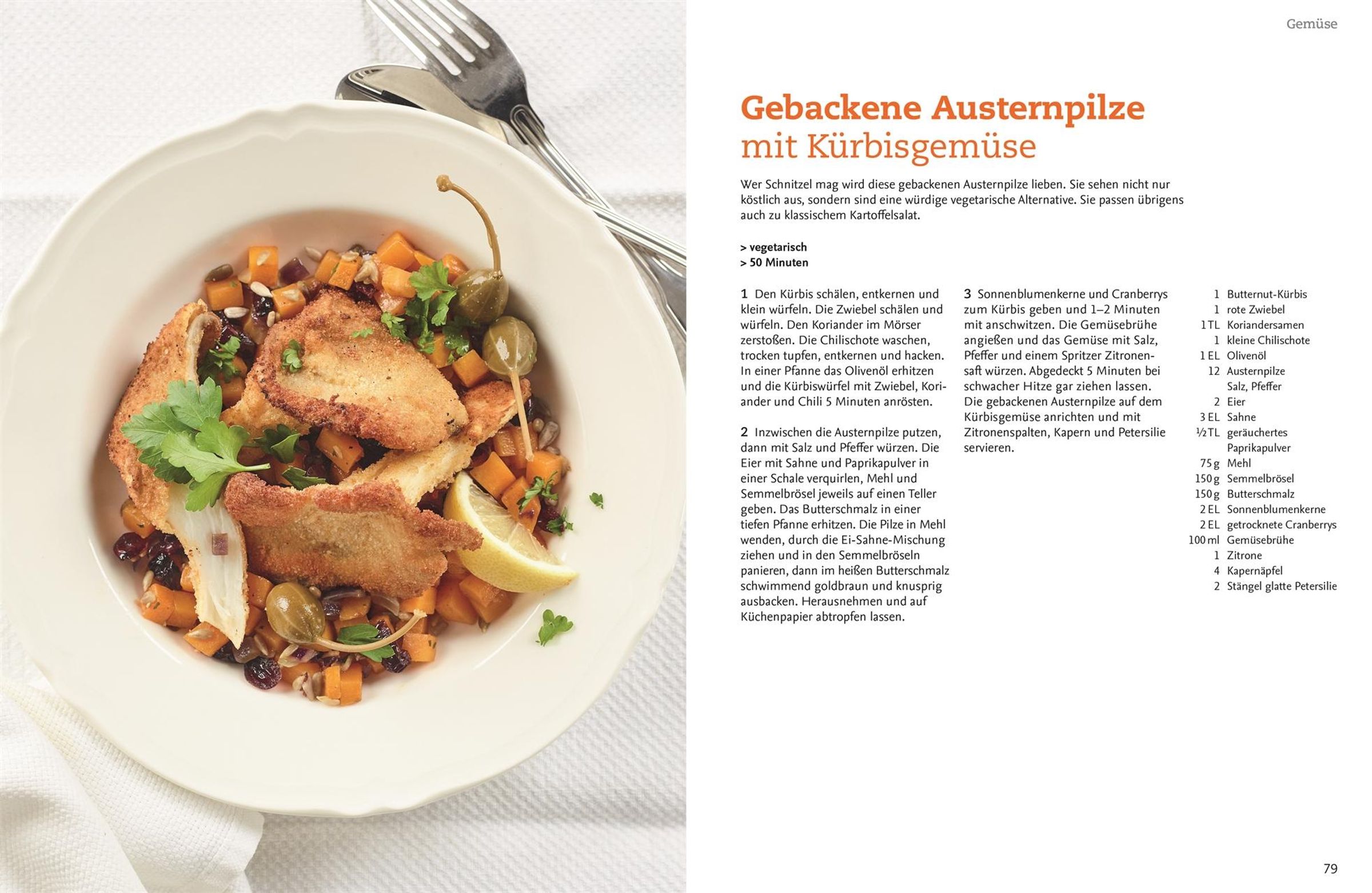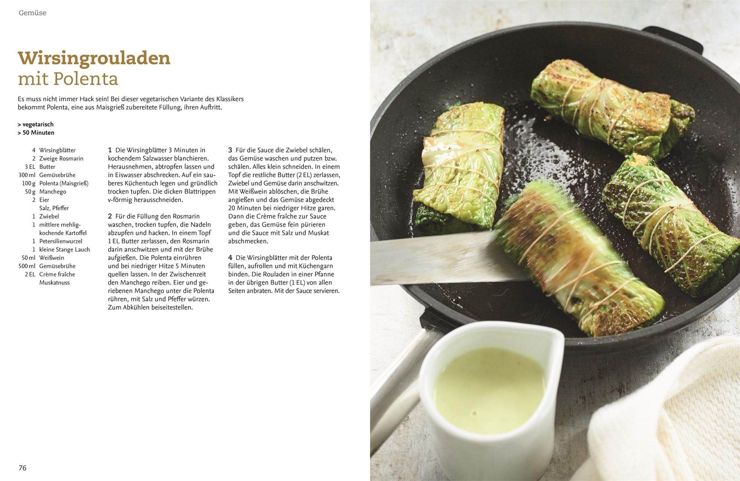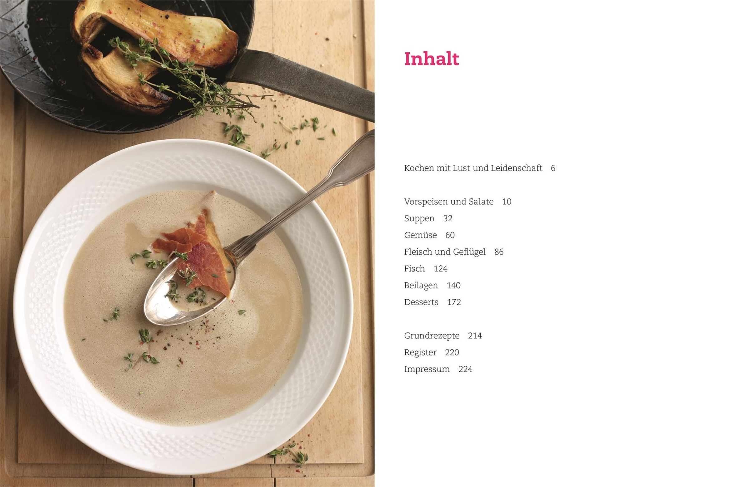 Über 60 deutsche Gerichte: Ob Suppen, Vorspeisen, Hauptgerichte, Beilagen und Desserts - stellen Sie sich Kapitel für Kapitel Ihr individuelles mehrgängiges deutsches Menü zusammen: z. B. mit Leberkäsesalat mit Kräutern, gedämpften Maultaschen mit Seeteufel und Asiagemüse oder Griessflammeri mit marinierten Zwetschgen.